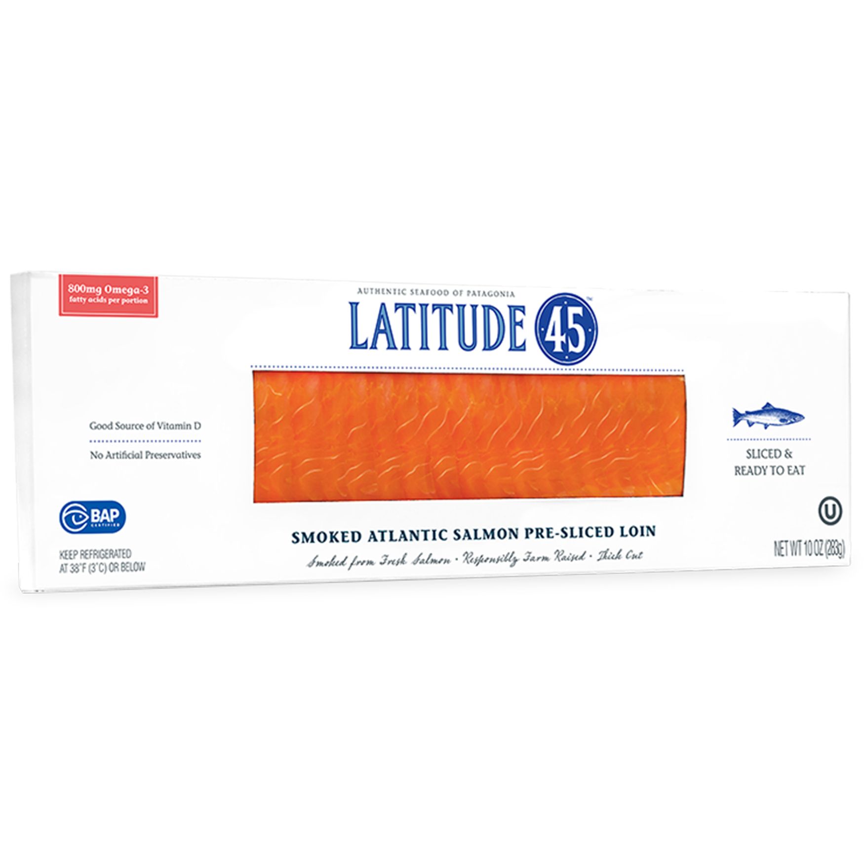 Latitude 45's premium smoke roasted salmon is made from hand-selected fresh Atlantic Salmon, sustainably sourced from the pristine waters of the Chilean Patagonian region. Within hours of harvest, the salmon is naturally cured through a slow smoke process, creating one of the finest smoked salmon products available. Atlantic Salmon is a source of lean protein, omega 3 fatty-acids and a good source of vitamin D. The product is ready-to-eat and conveniently offers endless pairing options - the smoke roasting process makes this product perfect for delicious salmon dips and spreads on sandwiches, flat breads, and crackers; mincing into salads, or in pastas and as pizza toppings. Latitude 45 operates in an ideal environment for salmon production, the glacial fjords and pristine waters of Patagonia. This smoked salmon is always made from fresh salmon and smoked within 24 hours of leaving the water resulting in one of the finest smoked salmon products available to consumers, and its rich flavor allows consumers to enjoy a unique culinary experience every time they try it. Latitude 45 is also committed to transparency, food safety, and the implementation of world-class sustainable practices that support the environment. Latitude 45 is a member of The Global Salmon Initiative (GSI) and the Global Sustainable Seafood Initiative (GSSI) and operates a robust QC control system to satisfy the most demanding customers and consumers around the world. All of Latitude 45 products are OU kosher and BAP 4-Star Certified.