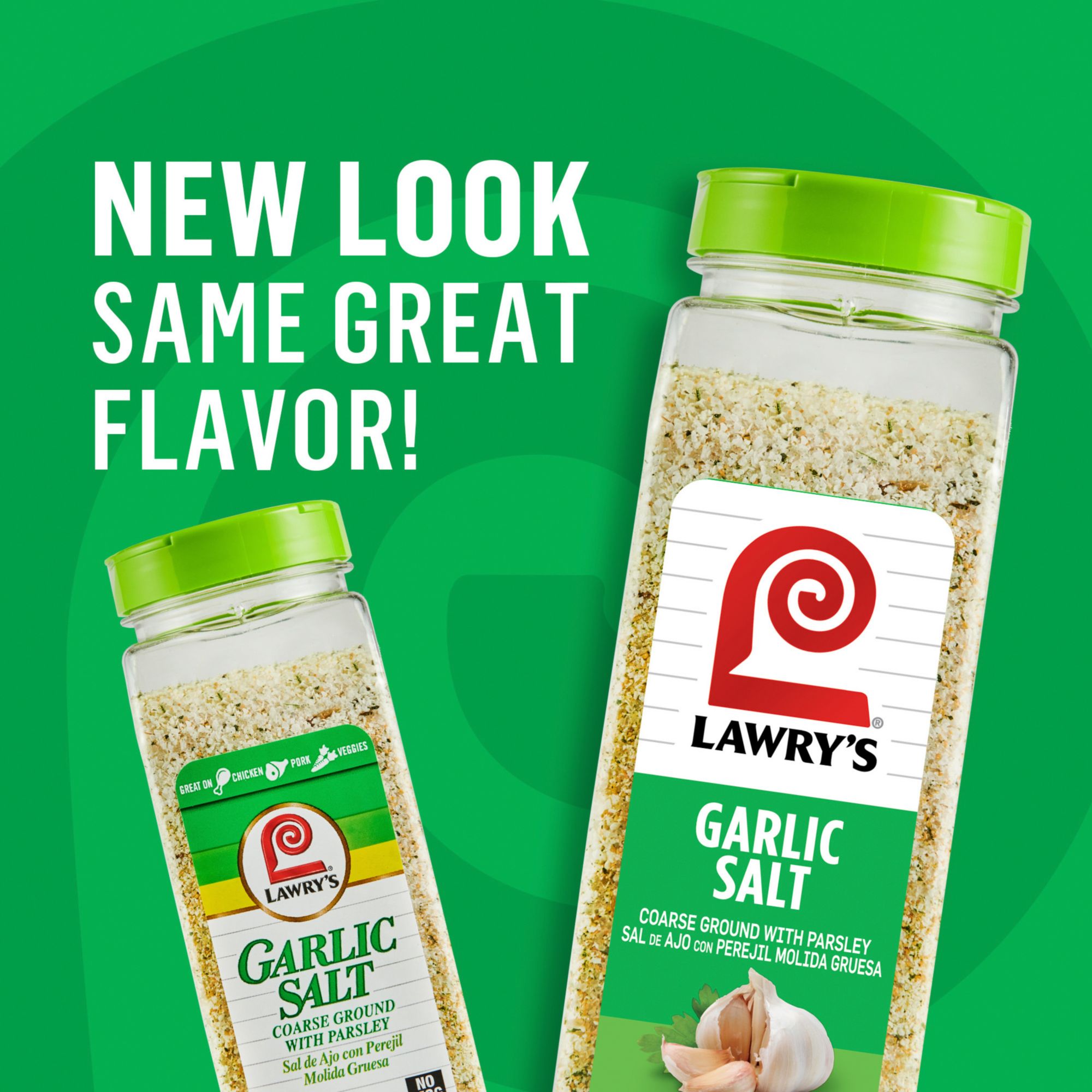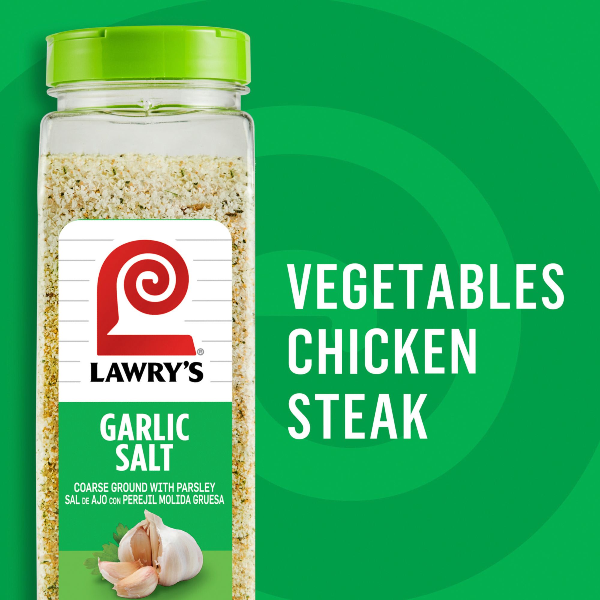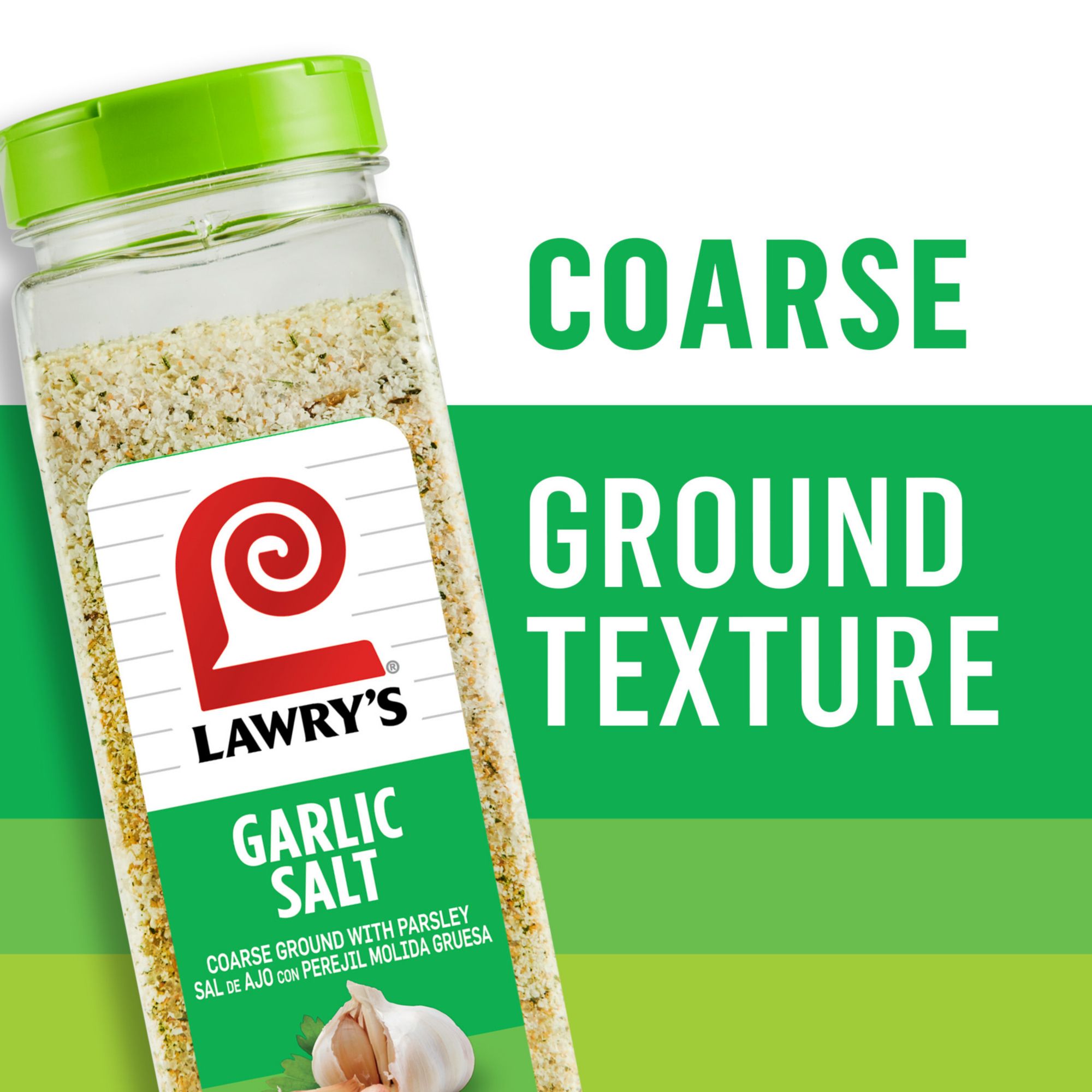Lawry's Coarse Ground with Parsley Garlic Salt is the flavor you want in your pantry or professional kitchen to add zing to favorite menu items and recipes. A blend of coarse-ground garlic, salt, and parsley in one convenient bottle, it adds full-bodied garlic flavor to mac 'n cheese, rice and beans, tacos, greens … everything! Busy cooks know to have garlic salt at hand. From breakfast scrambled eggs to midday salads and dinnertime fried chicken, garlic salt is the shortcut to rich, savory taste. Use to salt steaks, chops, pasta dishes, casseroles, soups, dips, and more. It makes ordinary side dishes like rice, potatoes, and veggies shine. It’s the secret to making any dish with ground beef – burgers, meat loaf, chili, or meatballs – so much better.