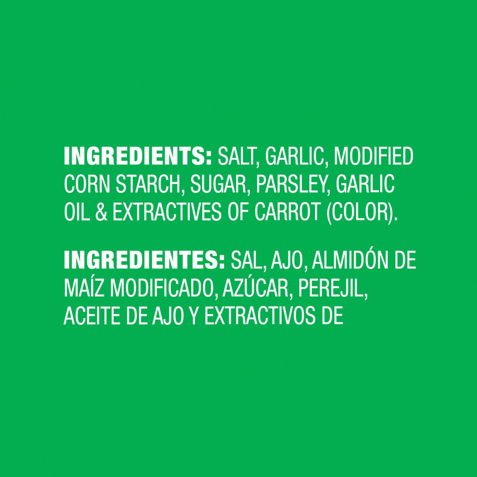 Ingredients: Salt, Garlic, Modified Corn Starch, Sugar, Parsley, Garlic Oil & Extractives Of Carrot (Color).