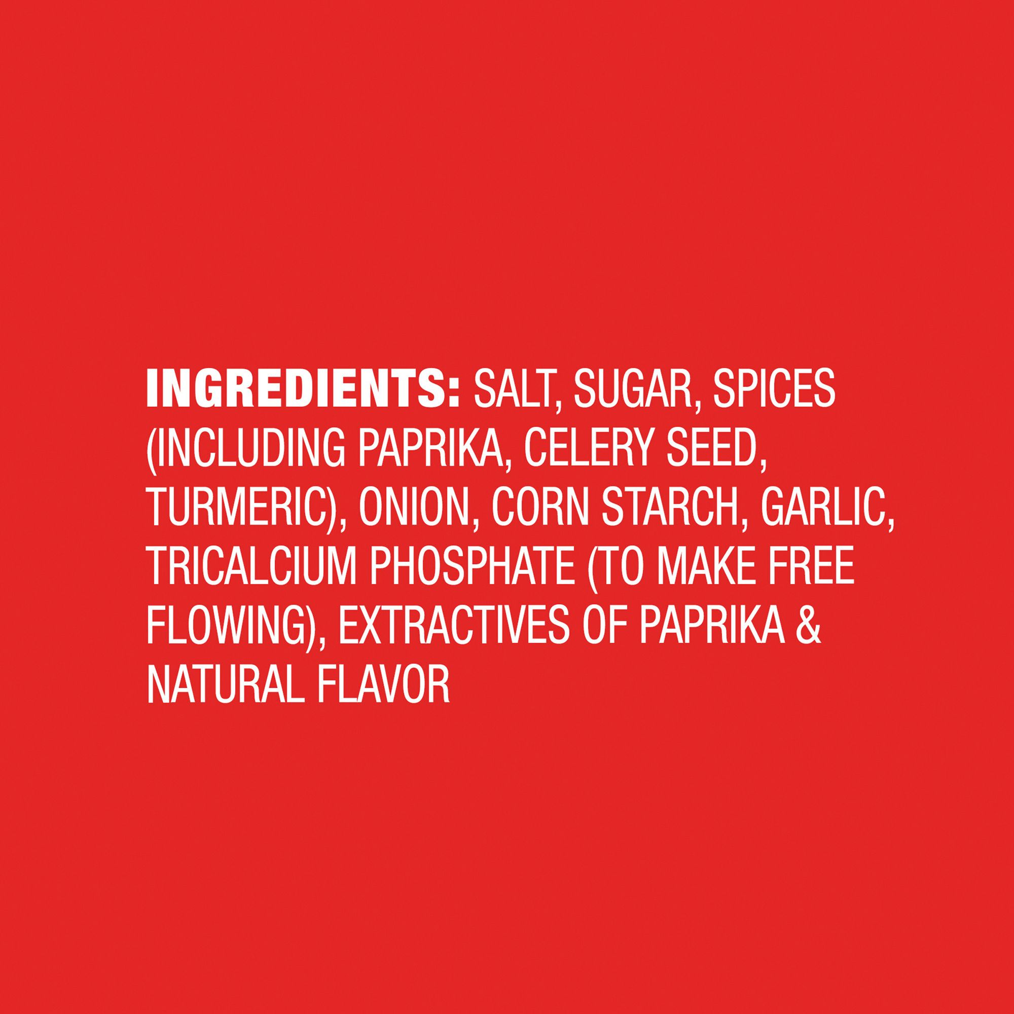 Ingredients: Salt, Sugar, Spices (Including Paprika, Celery Seed, Turmeric), Onion, Corn Starch, Garlic, Tricalcium Phosphate (To Make Free Flowing), Extractives Of Paprika & Natural Flavor.