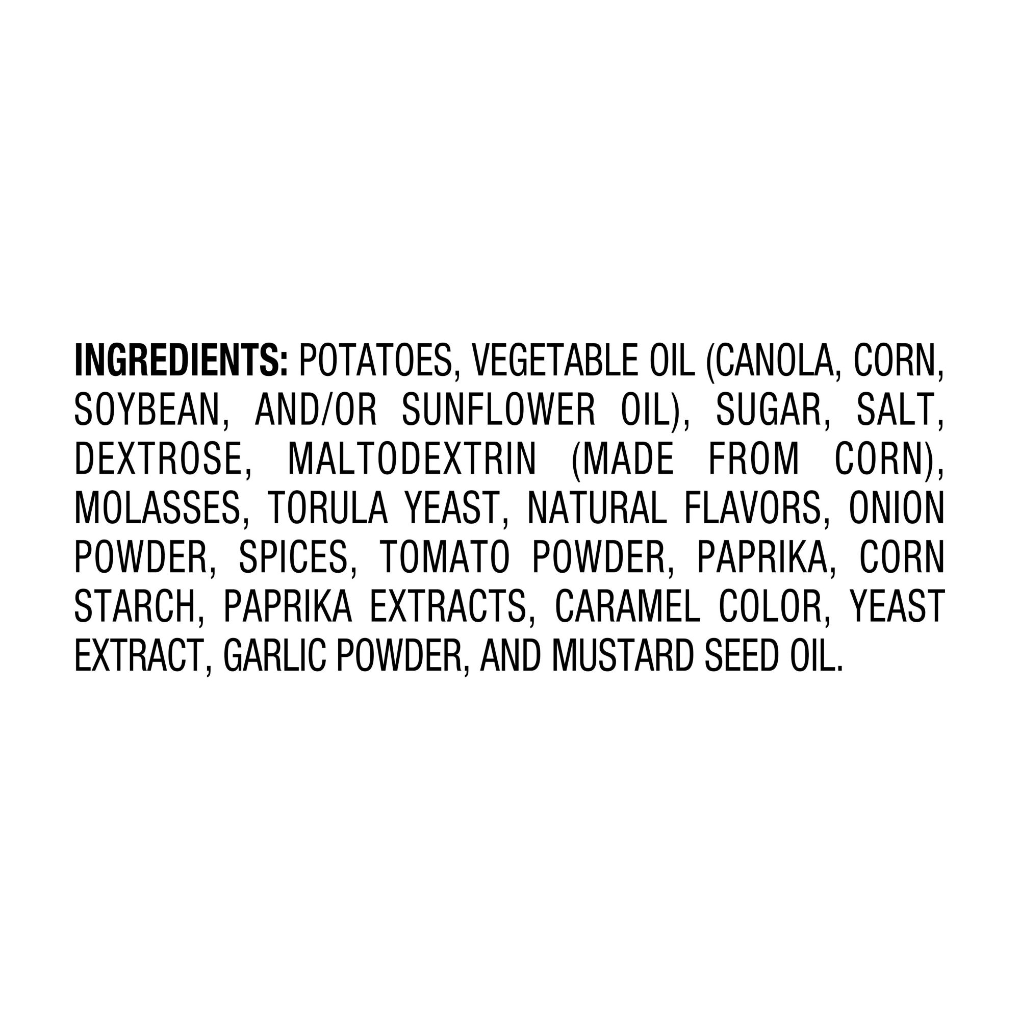 Ingredients Potatoes, Vegetable Oil (Canola, Corn, Soybean, And/Or Sunflower Oil), Sugar, Salt, Dextrose, Maltodextrin (Made From Corn), Molasses, Torula Yeast, Natural Flavors, Onion Powder, Spices, Tomato Powder, Paprika, Corn Starch, Paprika Extracts, Caramel Color, Yeast Extract, Garlic Powder, And Mustard Seed Oil.