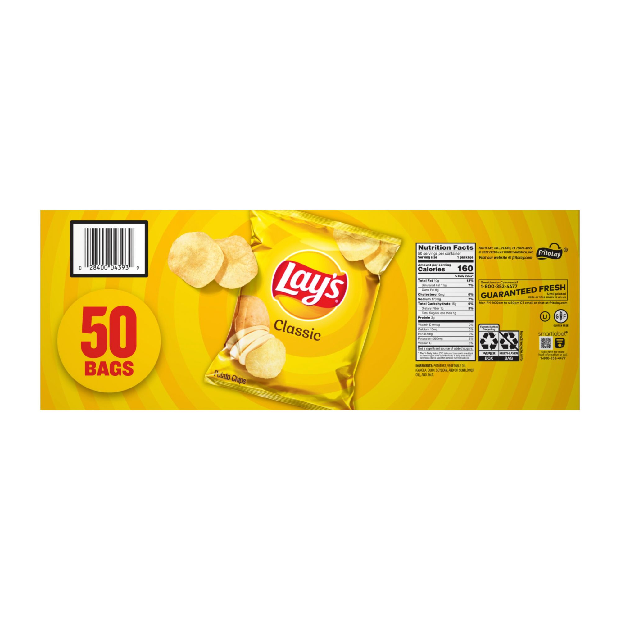 Crunchy snack perfect for family and friends Single-serve packs help with portion control Portability ensures fresh tasting chips every time Perfect for on-the-go snacking or lunch bags Includes 50 Lay's Classic Potato Chips, 1 oz. each