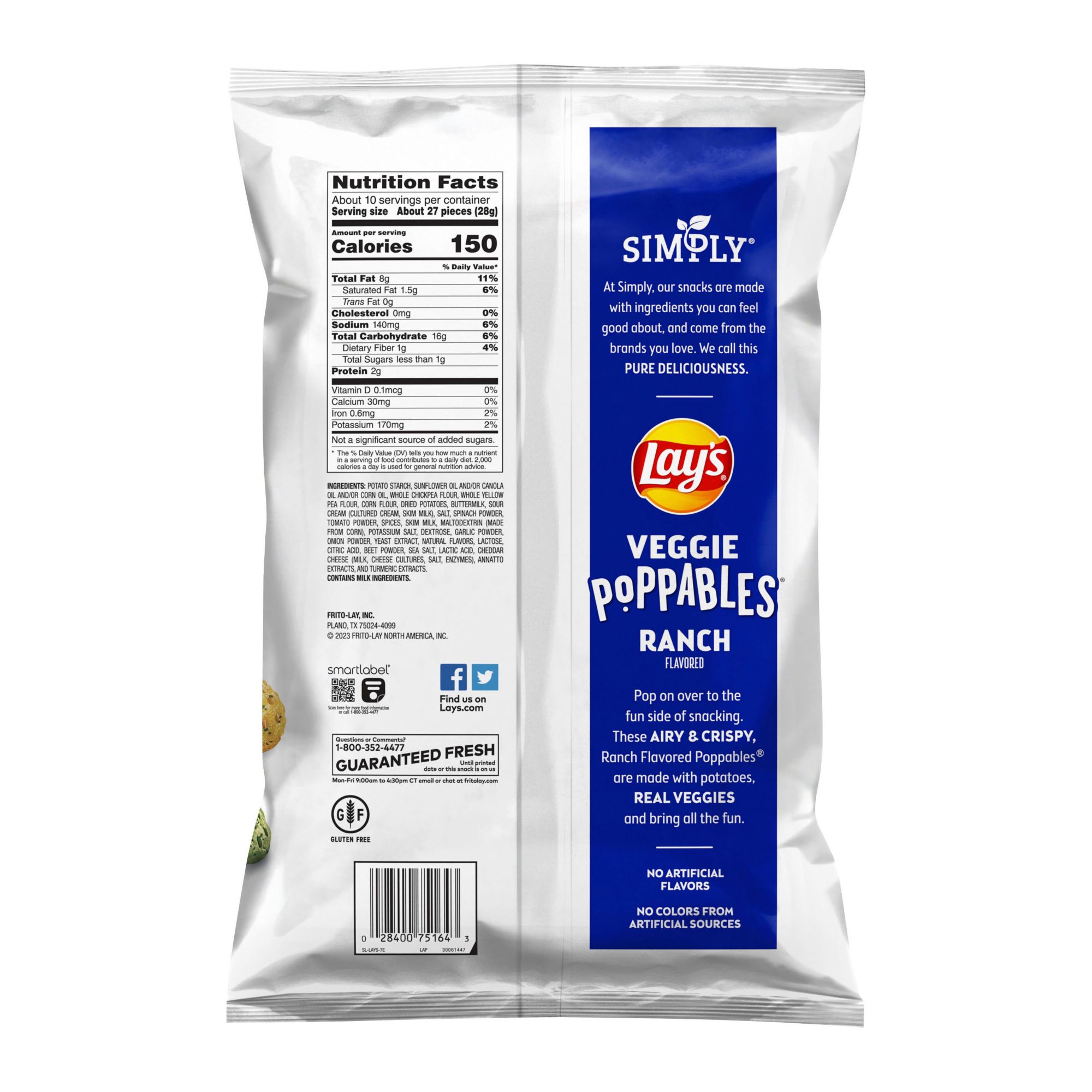 Simply Lay's poppable snacks Made with real veggies No Artificial Flavors No Colors From Artificial Sources Ranch flavored Lay's Simply Veggie Poppables Potato & Veggie Snacks Ranch Flavored, 9.875 oz. bag