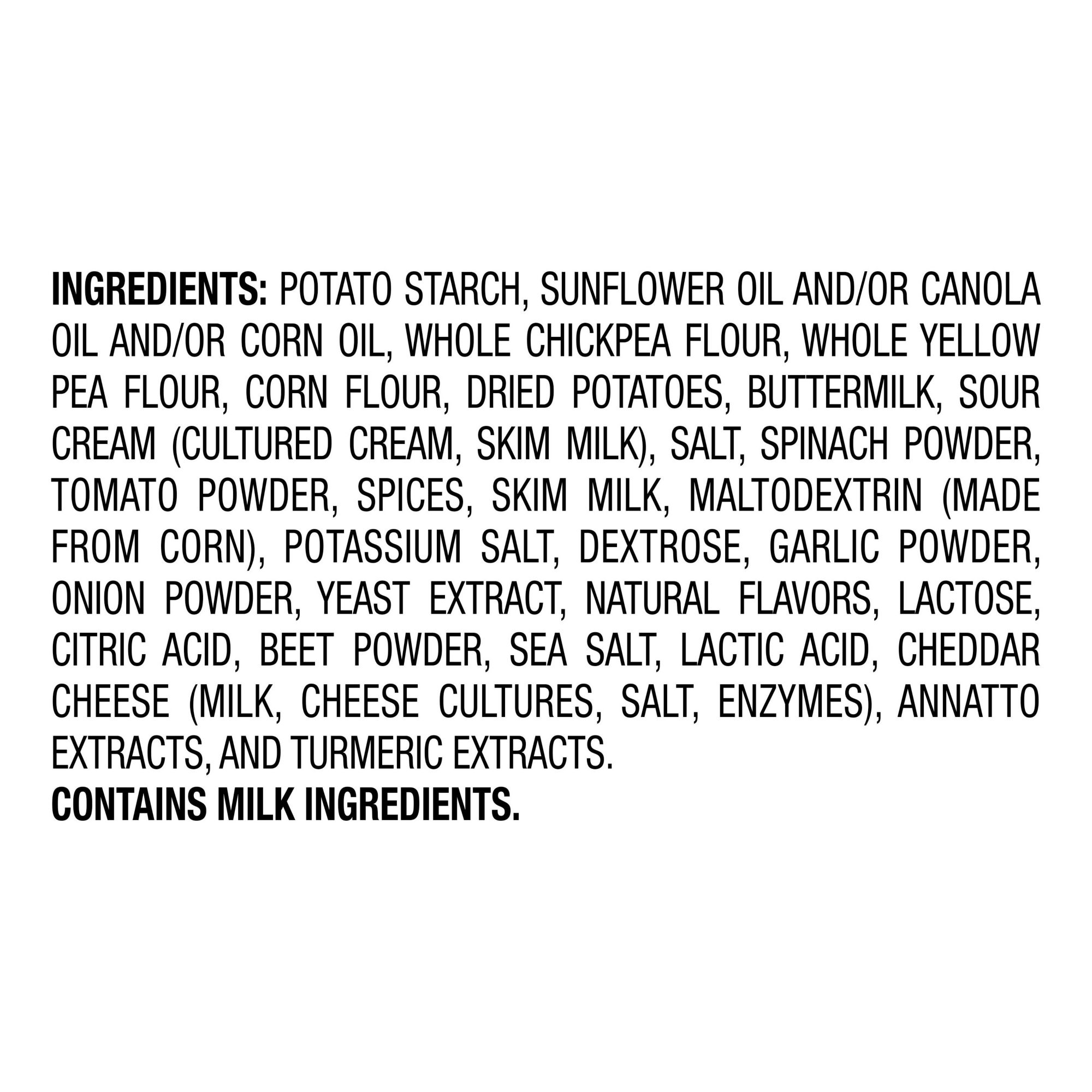 Ingredients: Potato Starch, Sunflower Oil And/Or Canola Oil And/Or Corn Oil, Whole Chickpea Flour, Whole Yellow Pea Flour, Corn Flour, Dried Potatoes, Buttermilk, Sour Cream (Cultured Cream, Skim Milk), Salt, Spinach Powder, Tomato Powder, Spices, Skim Milk, Maltodextrin (Made From Corn), Potassium Salt, Dextrose, Garlic Powder, Onion Powder, Yeast Extract, Natural Flavors, Lactose, Citric Acid, Beet Powder, Sea Salt, Lactic Acid, Cheddar Cheese (Milk, Cheese Cultures, Salt, Enzymes), Annatto Extracts, And Turmeric Extracts. Contains Milk Ingredients.