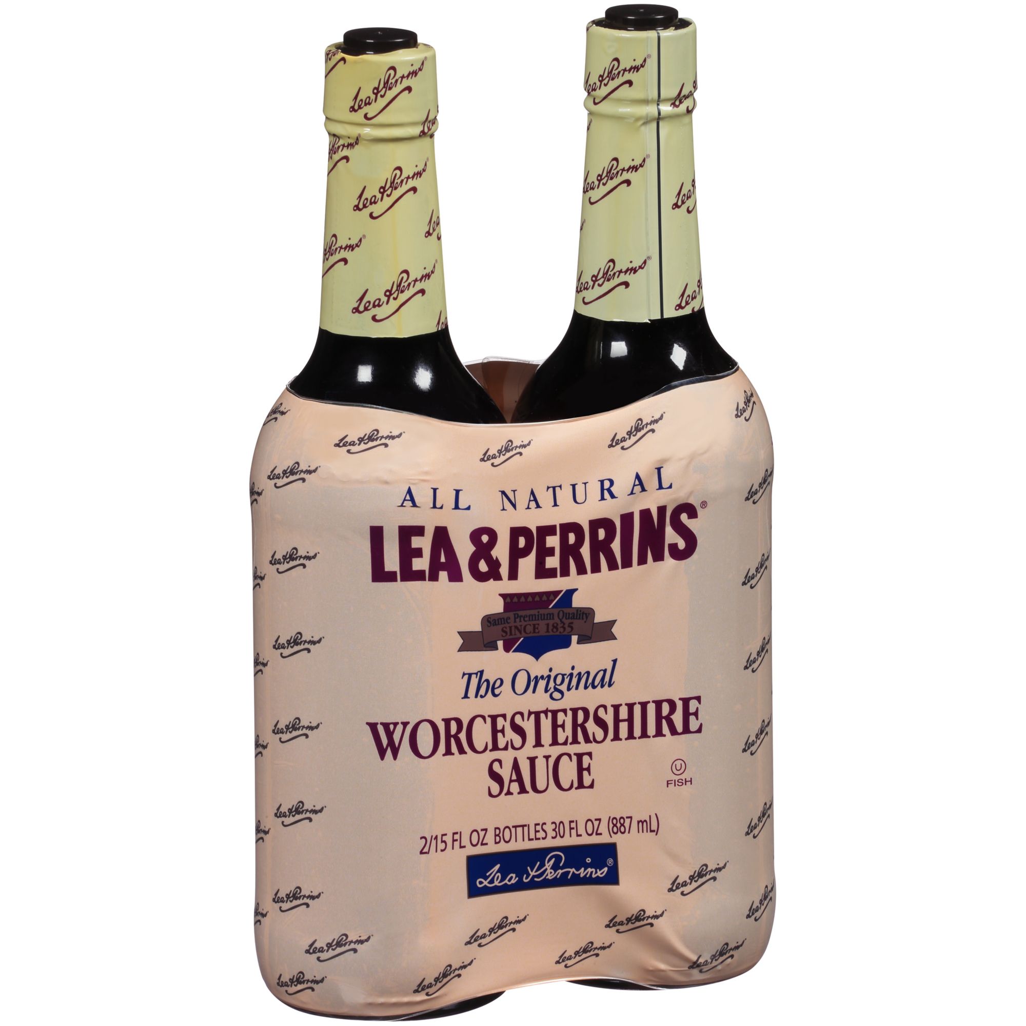 One twin pack of 15 fl oz. bottles of Lea & Perrins Worcestershire Sauce Lea & Perrins Worcestershire Sauce makes your food so tasty, it has your guests begging for more A savory sauce flavored with garlic, tamarind extract and chili pepper extracts, sugar, and molasses Toss your chicken, meat, fish and vegetables in Worcestershire Sauce or drizzle it while cooking Free of cholesterol, fat, preservatives and gluten, with 80% less sodium than soy sauce Adds flavor to grilled salmon, chicken dishes, turkey, roast beef, chili, pasta and salads Sealed, mess-free glass bottle