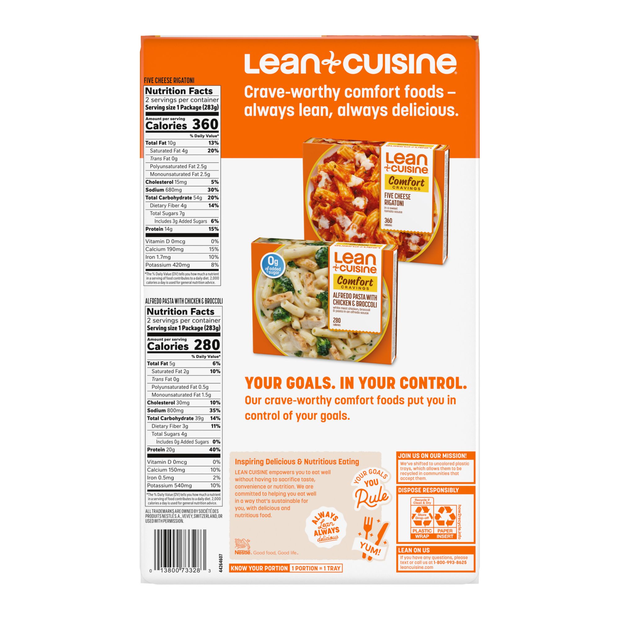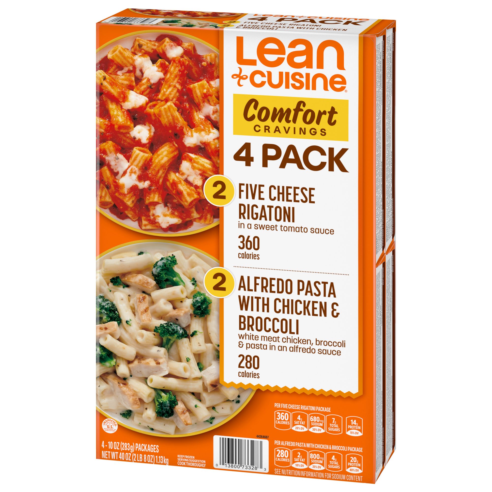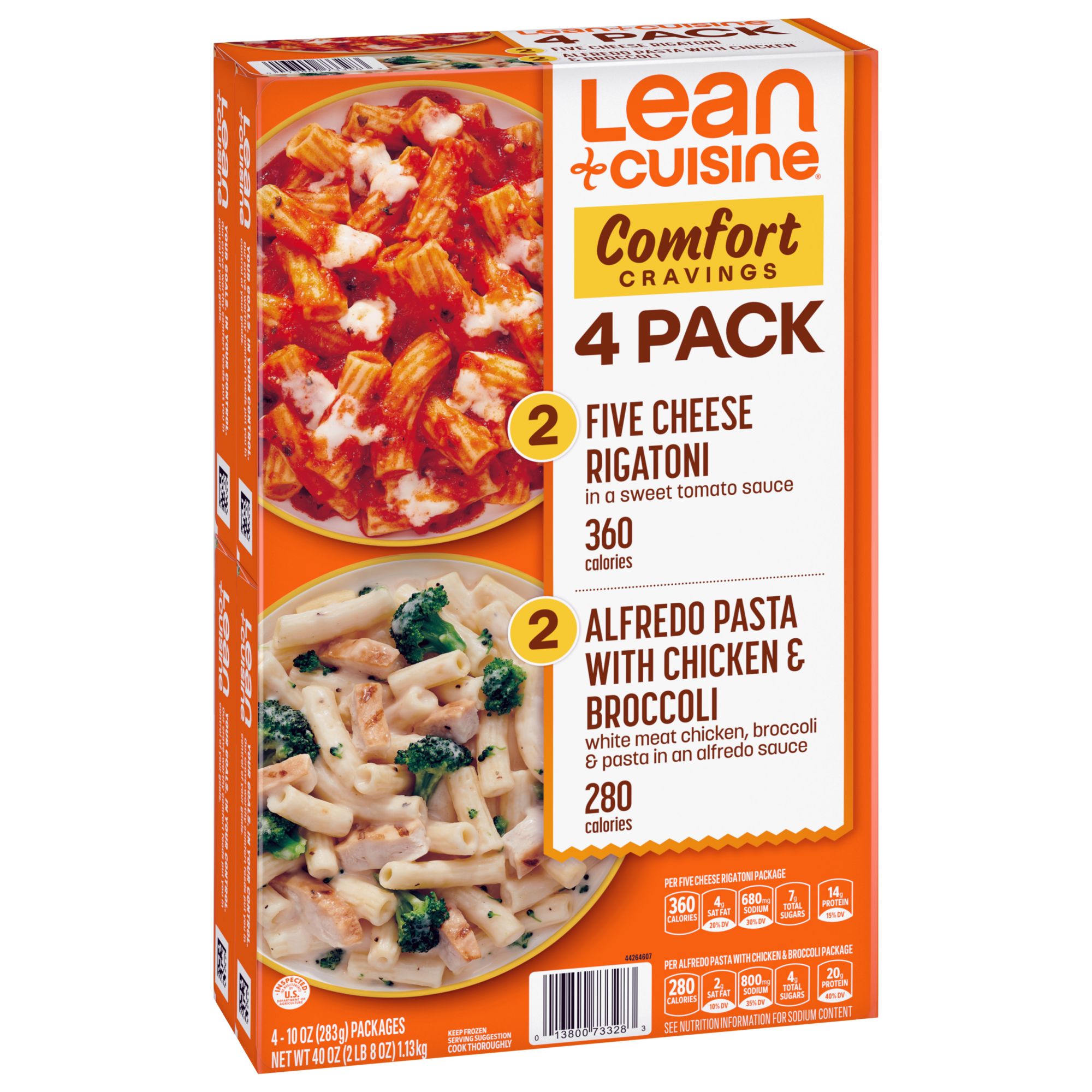 Satisfy your comfort food cravings with the Lean Cuisine Comfort Variety Pack. The Lean Cuisine Comfort Variety Pack contains two classic recipes. The Alfredo Pasta with Chicken & Broccoli is 280 calories and 20 grams of protein per package. These easy-to-make Lean Cuisine frozen meals feature white meat chicken, pasta and broccoli in an Alfredo sauce. The Five Cheese Rigatoni contains 360 calories and 14 grams of protein per package. This easy-to-make Lean Cuisine meal features freshly made rigatoni pasta topped with a five cheese blend in a sweet tomato sauce. Each 10-ounce entree can be enjoyed on its own or with a side salad as part of an easy meal. Pair Lean Cuisine pasta noodles with a sandwich, or customize it with your favorite add-ons. This microwave meal is ready in less than seven minutes and makes a convenient lunch, quick dinner or snack. Lean Cuisine entrees are made with premium ingredients for a tasty, feel-good meal. This Lean Cuisine meal contains no preservatives and offers 10%-15% DV of calcium per serving for a satisfying meal you can feel good about. Lean Cuisine frozen entrees are not your mother’s diet food. Lean Cuisine helps you take control of your wellness goals with a variety of delicious frozen dinners and snacks, all 400 calories or less.