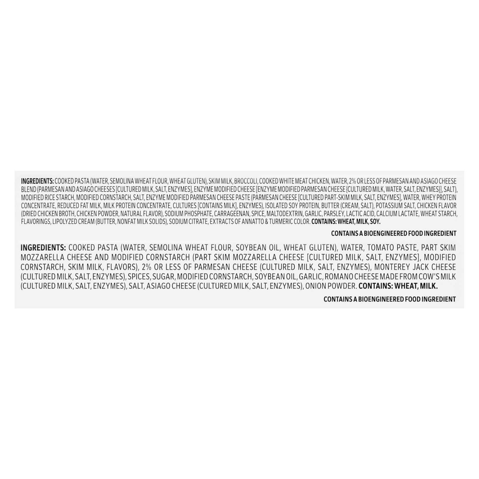 Ingredients: Lean Cuisine Alfredo Pasta With Chicken And Broccoli: Cooked Pasta (Water, Semolina Wheat Flour, Wheat Gluten), Skim Milk, Broccoli, Cooked White Meat Chicken, Water, 2% Or Less Of Parmesan And Asiago Cheese Blend (Parmesan And Asiago Cheeses [Cultured Milk, Salt, Enzymes], Enzyme Modified Cheese [Enzyme Modified Parmesan Cheese {Cultured Milk, Water, Salt, Enzymes}], Salt), Modified Rice Starch, Modified Cornstarch, Salt, Enzyme Modified Parmesan Cheese Paste (Parmesan Cheese [Cultured Part-skim Milk, Salt, Enzymes], Water, Whey Protein Concentrate, Reduced Fat Milk, Milk Protein Concentrate, Cultures [Contains Milk], Enzymes), Isolated Soy Protein, Butter (Cream, Salt), Potassium Salt, Chicken Flavor (Dried Chicken Broth, Chicken Powder, Natural Flavor), Sodium Phosphate, Carrageenan, Spice, Maltodextrin, Garlic, Parsley, Lactic Acid, Calcium Lactate, Wheat Starch, Flavorings, Lipolyzed Cream (Butter, Nonfat Milk Solids), Sodium Citrate, Extracts Of Annatto & Turmeric Color. Lean Cuisine 5 Cheese Rigatoni: Cooked Pasta (Water, Semolina Wheat Flour, Soybean Oil, Wheat Gluten), Water, Tomato Paste, Part Skim Mozzarella Cheese And Modified Cornstarch (Part Skim Mozzarella Cheese [Cultured Milk, Salt, Enzymes], Modified Cornstarch, Skim Milk, Flavors), 2% Or Less Of Parmesan Cheese (Cultured Milk, Salt, Enzymes), Monterey Jack Cheese (Cultured Milk, Salt, Enzymes), Spices, Sugar, Modified Cornstarch, Soybean Oil, Garlic, Romano Cheese Made From Cow's Milk (Cultured Milk, Salt, Enzymes), Salt, Asiago Cheese (Cultured Milk, Salt, Enzymes), Onion Powder.