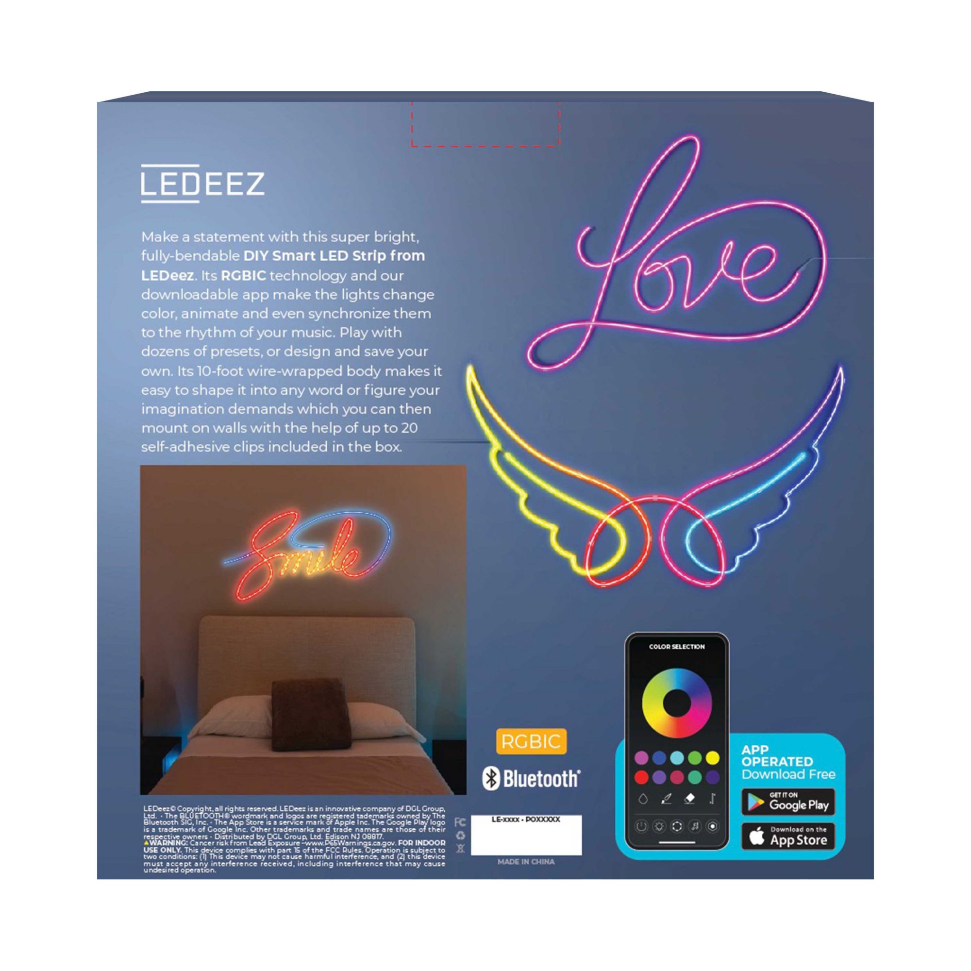Make a statement with this super bright and fully-bendable smart LED strip from Ledeez. The RGBIC technology and Ledeez’s downloadable app allow you to change the color, animate them and even synchronize them to the rhythm of your music. Play with dozens of presets or design and save your own color schemes and animations. Its 12’ wire-wrapped body makes it easy to shape it into any word or figure your imagination demands. Mounts easily on most walls with the help of up to 29 self-adhesive mounting clips.