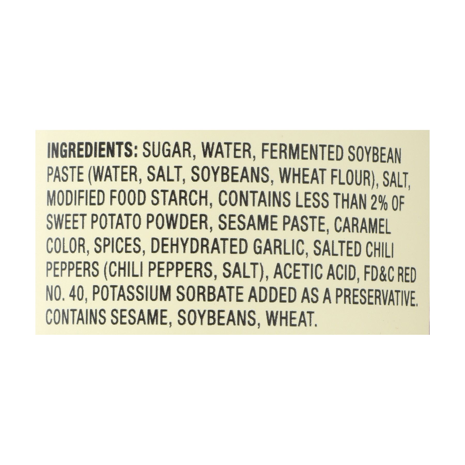Ingredients: Sugar, Water, Fermented Soybean Paste (Water, Salt, Soybeans, Wheat Flour), Salt, Modified Food Starch, Contains Less Than 2% Of Sweet Potato Powder, Sesame Paste, Caramel Color, Spices, Dehydrated Garlic, Salted Chili Peppers (Chili Peppers, Salt), Acetic Acid, Fd&c Red No. 40, Potassium Sorbate Added As A Preservative.