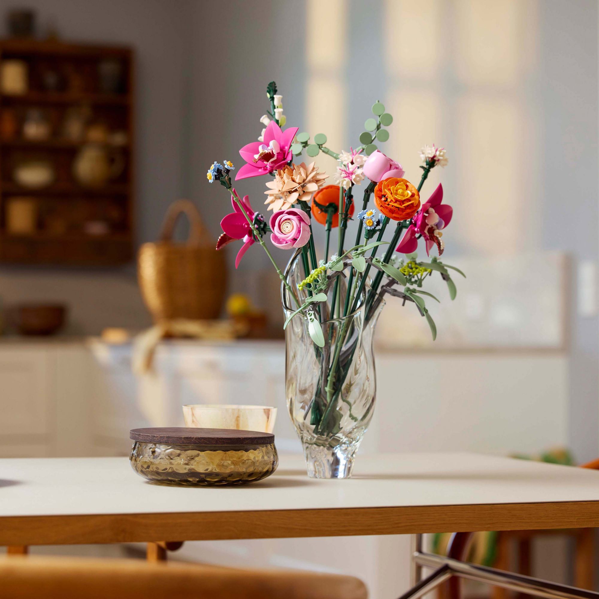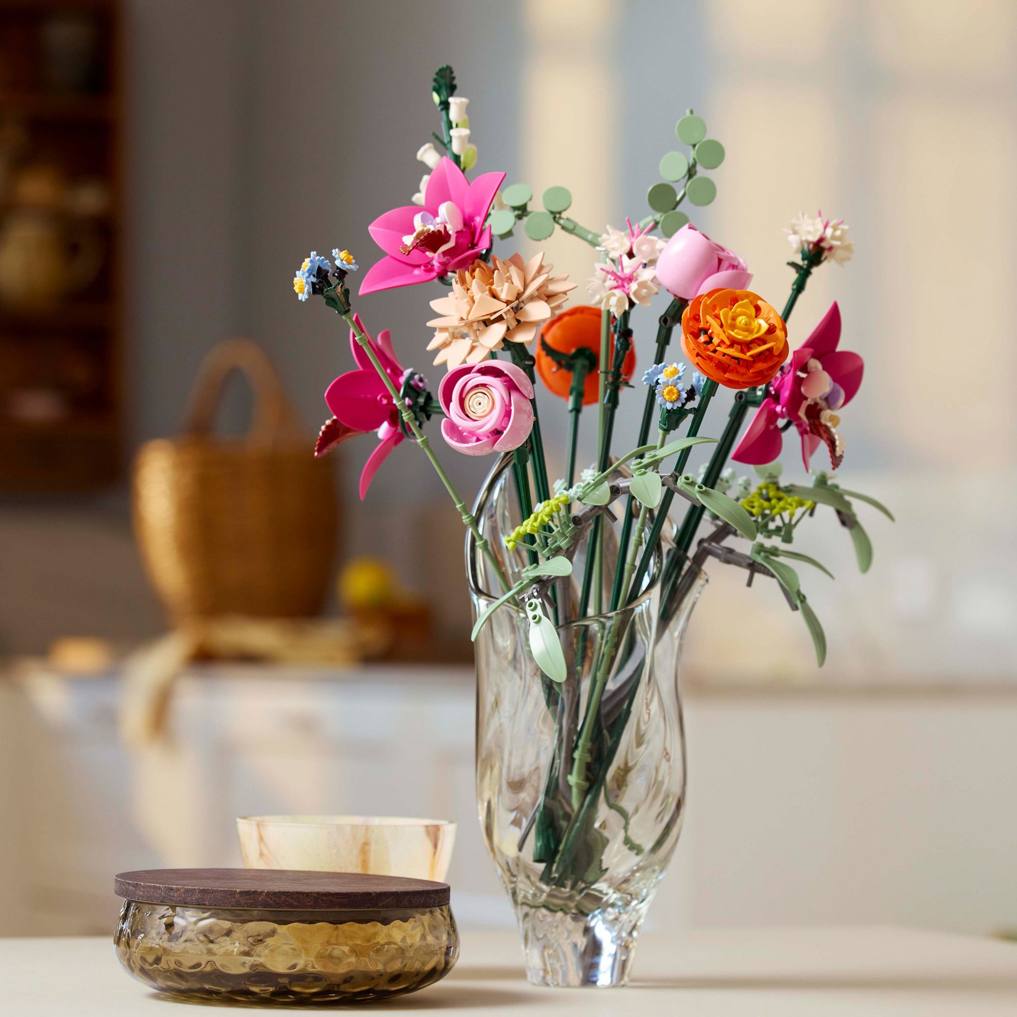 Includes 15 artificial flowers – The set features 15 buildable flower stems, including daisies, cornflowers, eucalyptus, elderflowers, roses, ranunculus, cymbidium orchids, a campanula and a waterlily dahlia