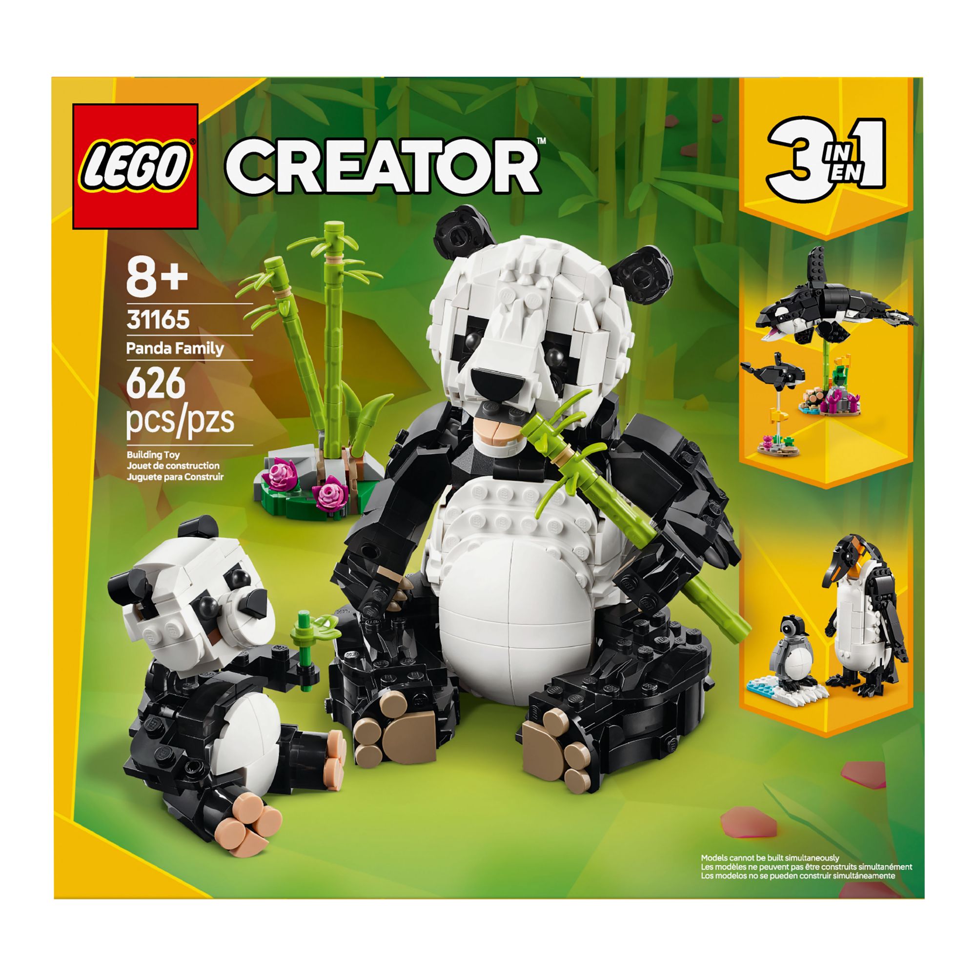 Boys, girls and animals lovers ages 8 and up will love this LEGO Creator Wild Animals: Panda Family (31165) toy building set. Kids can choose to build any of the three LEGO animal playsets with the same set of building blocks: A posable panda toy with its cub next to bamboo stalks, a play-and-display posable orca figure with its calf, or a posable penguin figure and its chick on a patch of ice. This 3 in 1 toy makes a great gift set for kids to build and rebuild as they engage in creative play and storytelling. The range of LEGO Creator building toys lets kids expand on the fun, with super-fast vehicles, amazing animals and house playsets. Please note that the 3 in 1 model kit cannot be built simultaneously.