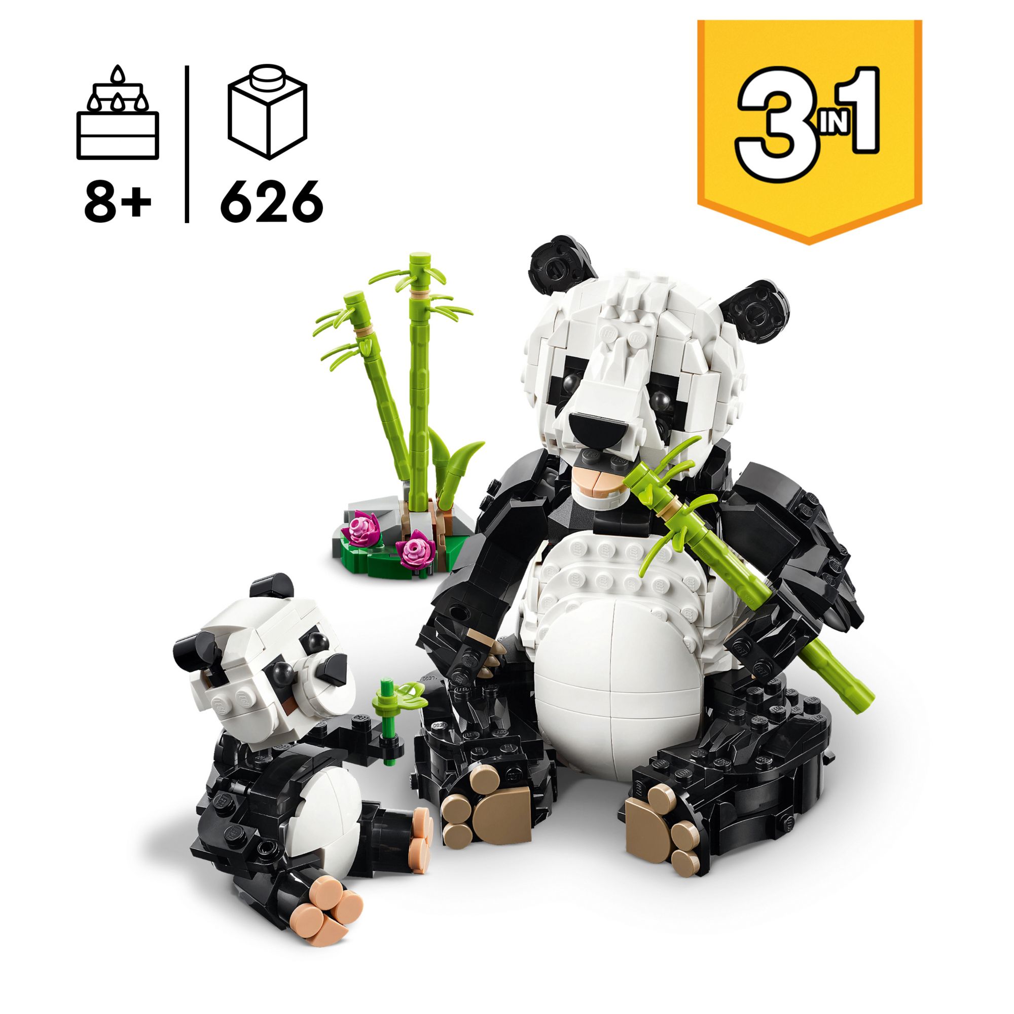 Three animal toys in one box – The LEGO Creator Wild Animals: Panda Family set lets girls and boys ages 8 years old and older build and rebuild three different animal families with the same bricks