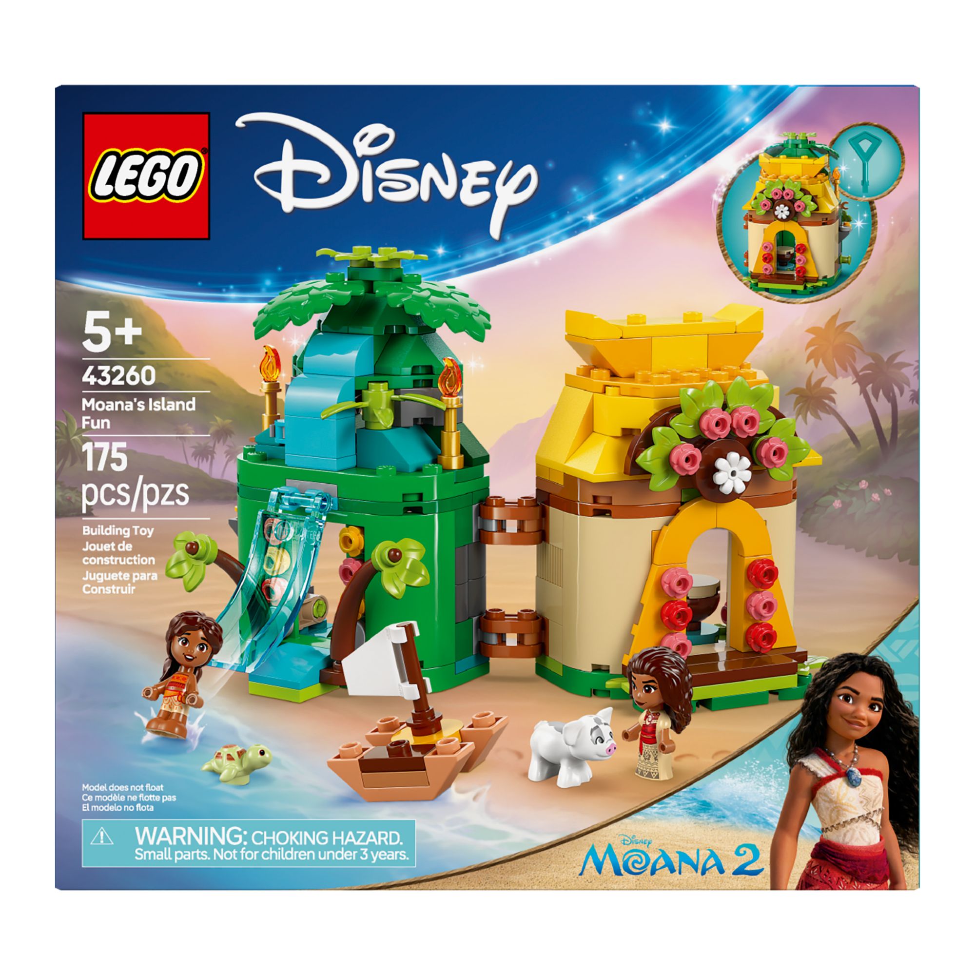 Board the boat and set off for an adventure beyond the reef with LEGO ǀ Disney Moana’s Island Fun (43260) toy building set for kids ages 5 years old and up. This playset is a double-sided model inspired by Disney’s Moana 2, and features Moana toys, accessories and details from the movie. Kids can imagine that they are traveling to the island where they’ll find a waterfall slide with a hidden entrance and a house with rooms for the Moana and her little sister and space for their pet Pua. This Moana 2 building set features Moana and Simea micro-doll figures. Kids can enjoys hours of interactive fun with the small boat, engaging story starters and a key that locks the island – making it perfect for on-the-go fun and taking the building toy to friends’ houses. This Disney LEGO set is packed with fun features to inspire kids as they play out their favorite movie scenes or new stories.
