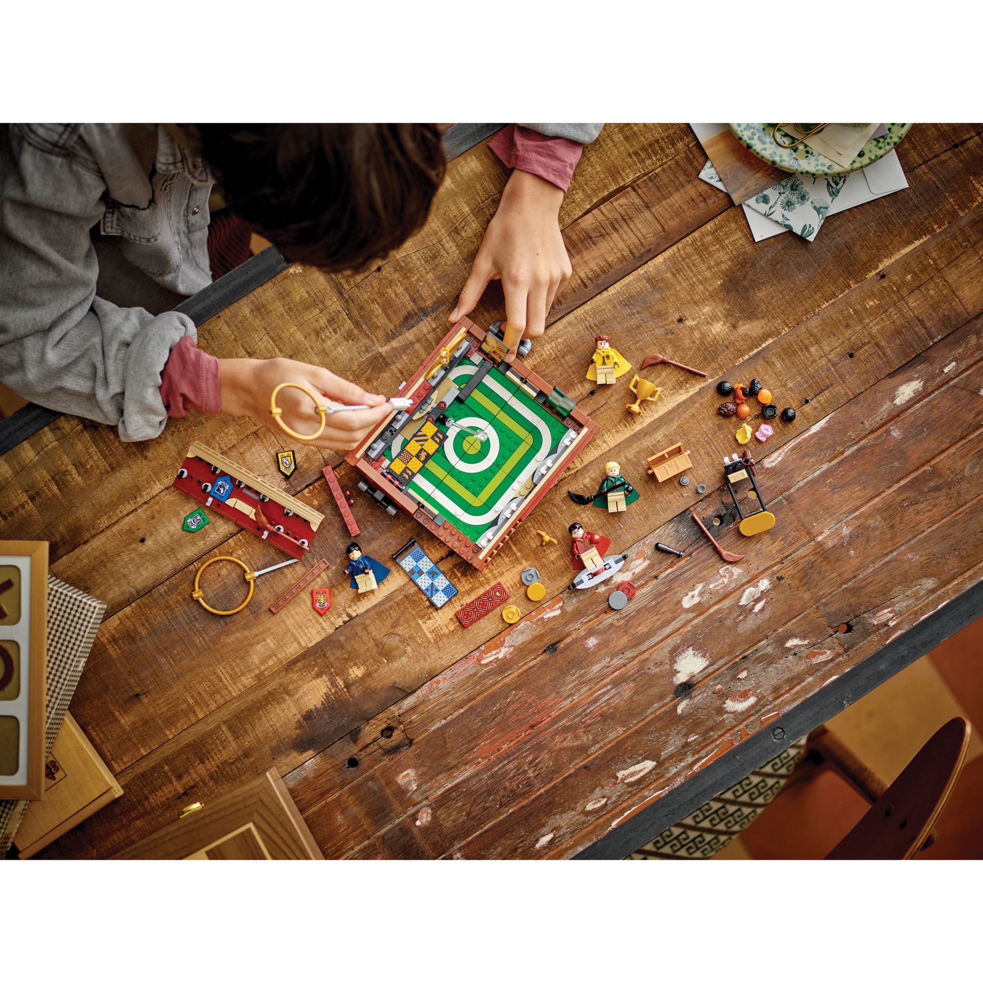 Unlock the LEGO brick trunk toy to reveal a Quidditch playing field and more