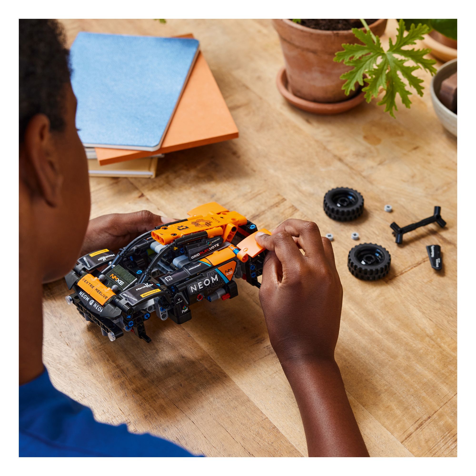 McLaren car toy for boys and girls aged seven and up – Give kids a fun building project with the Neom McLaren Extreme E Race Car toy building set with pull-back action for vehicle role play