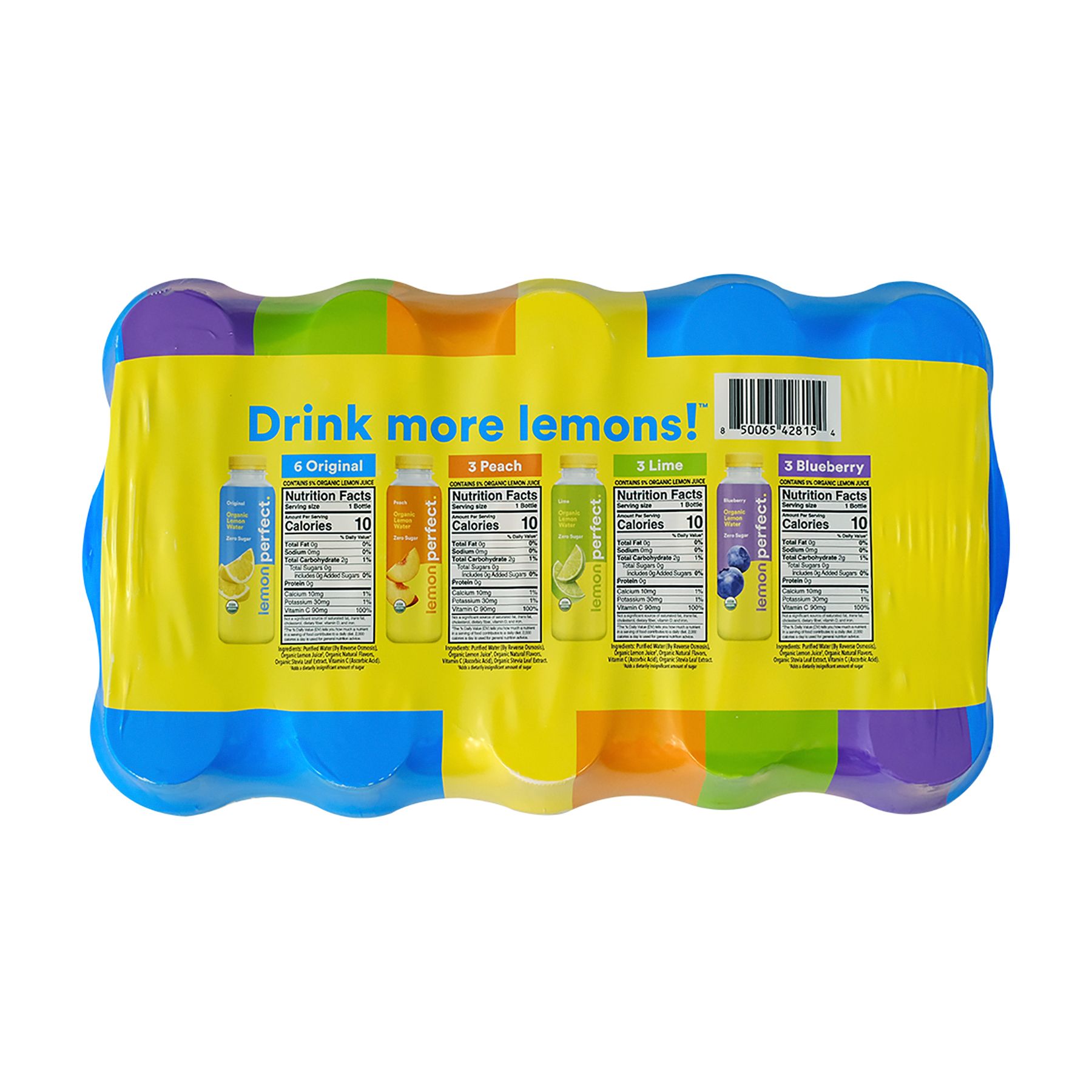 Includes (15) 15.2 ounce bottles of Lemon Perfect Organic Lemon Water - (6) Lemon Perfect Original Lemon, (3) Lemon Perfect Peach, (3) Lemon Perfect Lime & (3) Lemon Perfect Blueberry