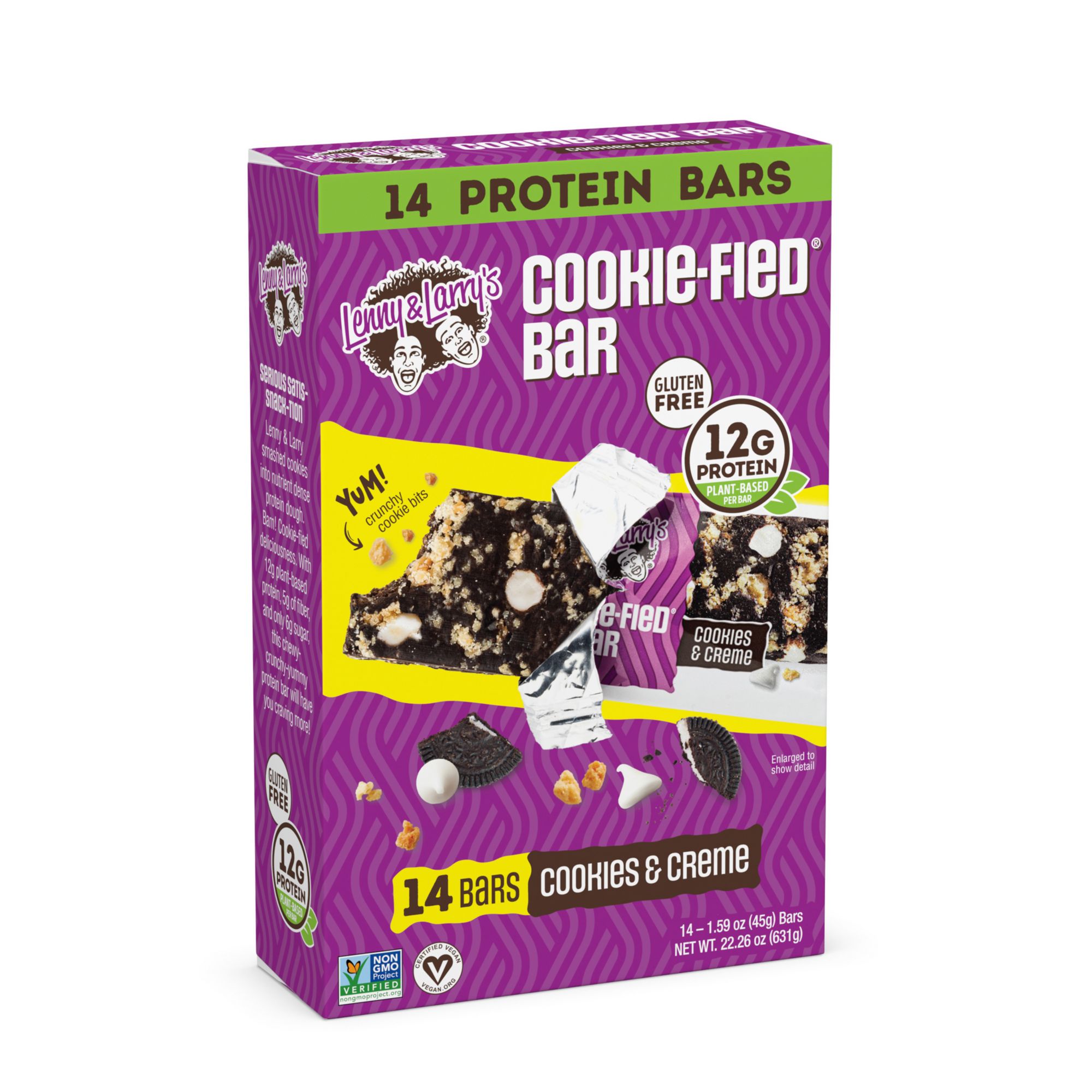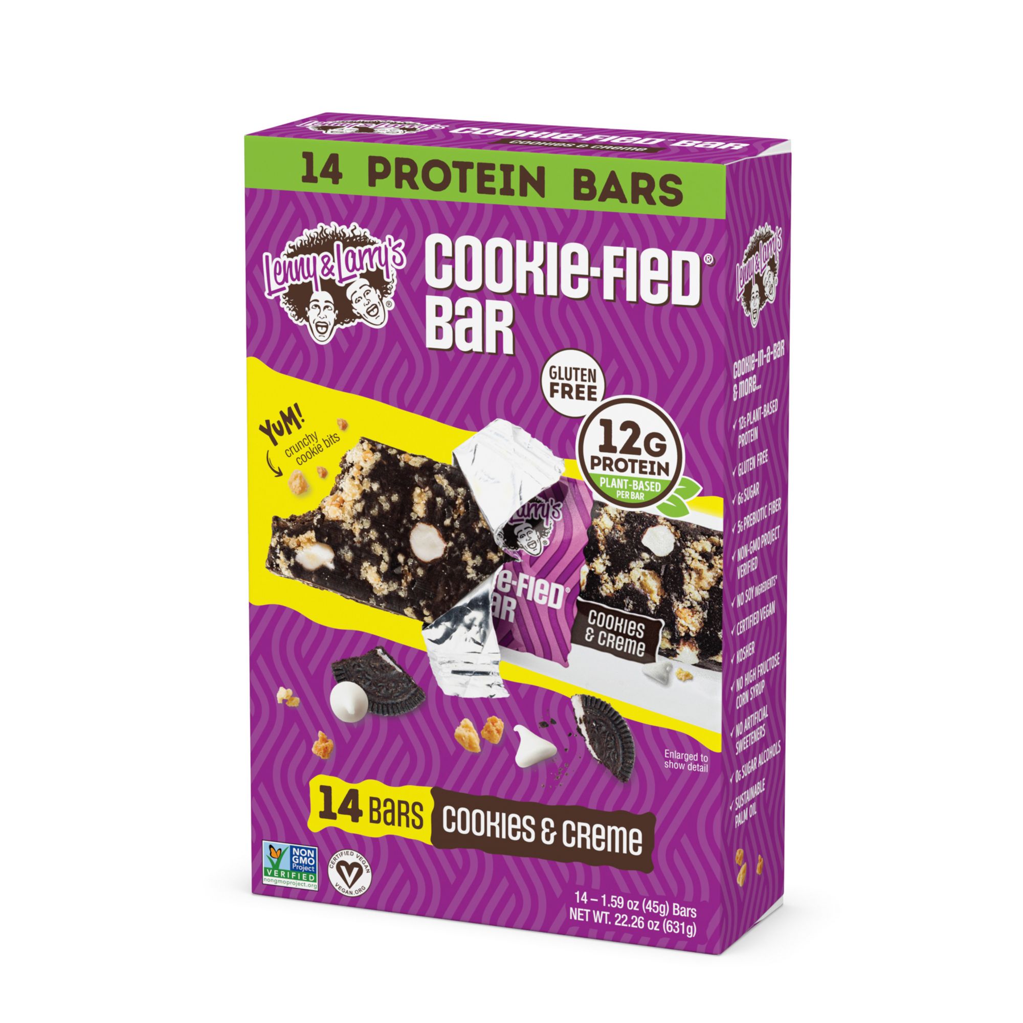 What's more fun than a cookie in a bar?! At Lenny & Larry’s, they bring circles of fun to a world of squares. So when they set out to create a snack bar, it couldn’t be just any boring bar. It would need to be Cookie-fied. The Cookies & Creme Cookie-fied Bar is a soft, chewy rich chocolate bar filled with sweet white chips and signature cookie pieces that gives your mouth an explosion of delicious flavor and fun crunchy cookie bits. The perfect balance between rich chocolate and sweet creamy flavor. Crafted with 12g plant-based protein and 5g prebiotic fiber, this Certified Vegan bar is a uniquely chewy and crunchy choice for a healthier snack option. Cookie-fied Bar is gluten free, Certified Vegan, Non-GMO Project Verified, and does not include soy ingredients, high fructose corn syrup, artificial sweeteners, nor sugar alcohols.