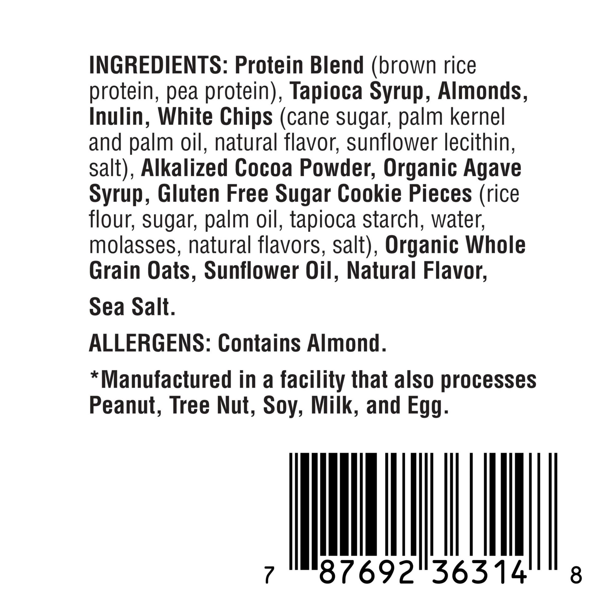 Ingredients: Protein Blend (brown rice protein, pea protein), Tapioca Syrup, Almonds, Inulin, White Chips (cane sugar, palm kernel and palm oil, natural flavor, sunflower lecithin, salt), Alkalized Cocoa Powder, Organic Agave Syrup, Gluten Free Sugar Cookie Pieces (rice flour, sugar, palm oil, tapioca starch, water, molasses, natural flavors, salt), Organic Whole Grain Oats, Sunflower Oil, Natural Flavor, Sea Salt.