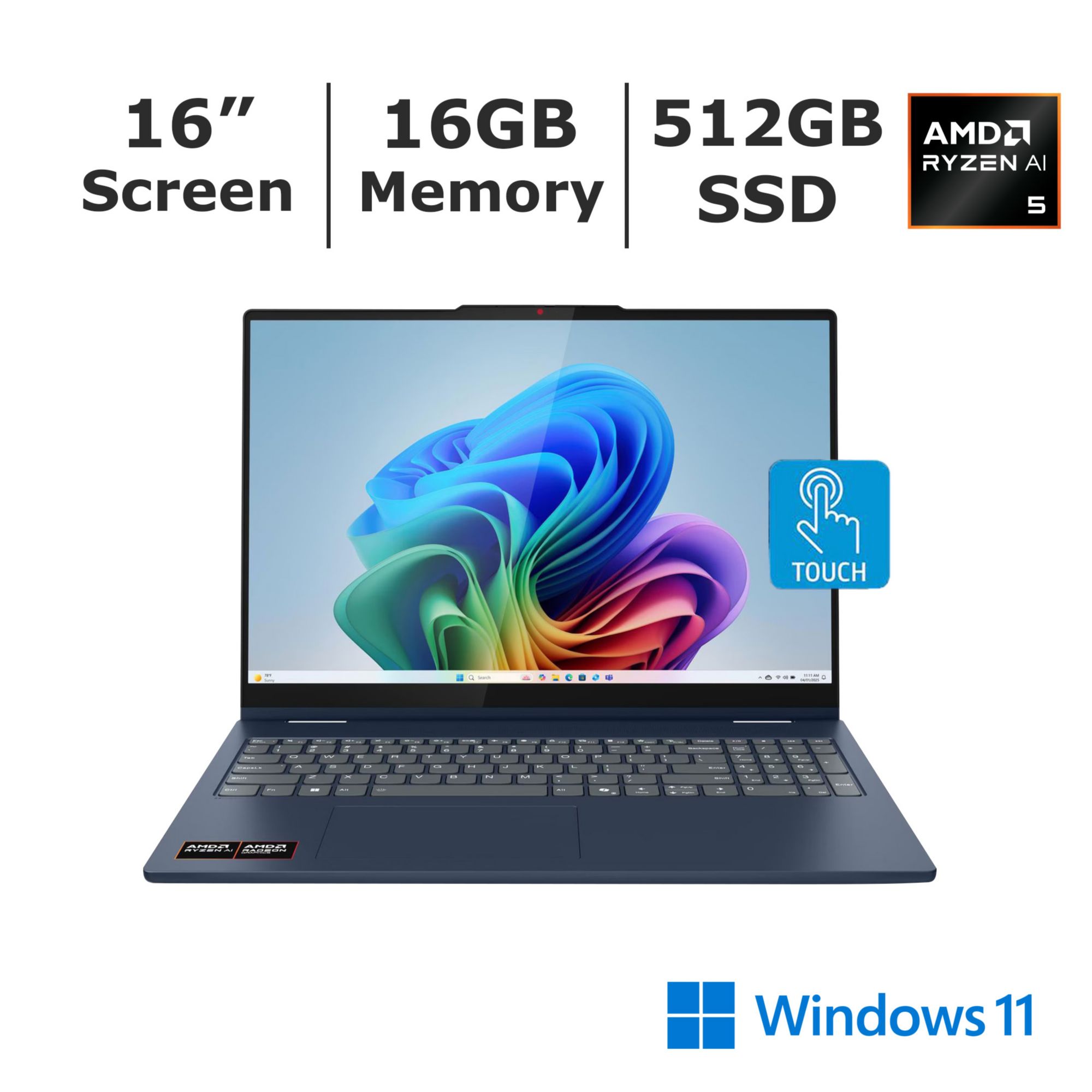 Lenovo 5 2-IN-1 16AKP10 AMD Ryzen AI 5 340 512GB SSD 16GB 16" (1920x1200) TOUCHSCREEN WIN11 COSMIC BLUE Backlit Keyboard Lenovo Digital Pen 2 Be bold with the 16" IdeaPad 5 2-in-1 — Powered by AMD Ryzen AI 300 Series processors, it delivers superior AI performance for real-time workload optimization and effortless multitasking to amplify productivity. Enjoy super-fast computing for the most demanding tasks and long battery life to go the distance. This 2-in-1 convertible laptop offers ultimate versatility with its 360° hinge, letting you seamlessly switch between laptop, tablet, tent, or stand modes to suit any task or moment. Boasting a sleek profile and robust design, it’s ready for anything. Available in Lunar Grey and Cosmic Blue, it’s custom-built for work, play, and creativity. Dive into a world of stunning visuals on the 16" convertible laptop with a hi-res display. A broader view with the 16:10 aspect ratio offers an immersive canvas where every detail shines with bright colors, whether creating or watching content. Power through your day with cutting-edge AMD Ryzen AI 300 Series processors, designed for AI-enhanced workflows that keep you ahead. Generous memory and intelligent power optimization allow you to handle demanding tasks, deliver seamless streaming, and enable effortless creativity — combining smarter performance with unmatched reliability.