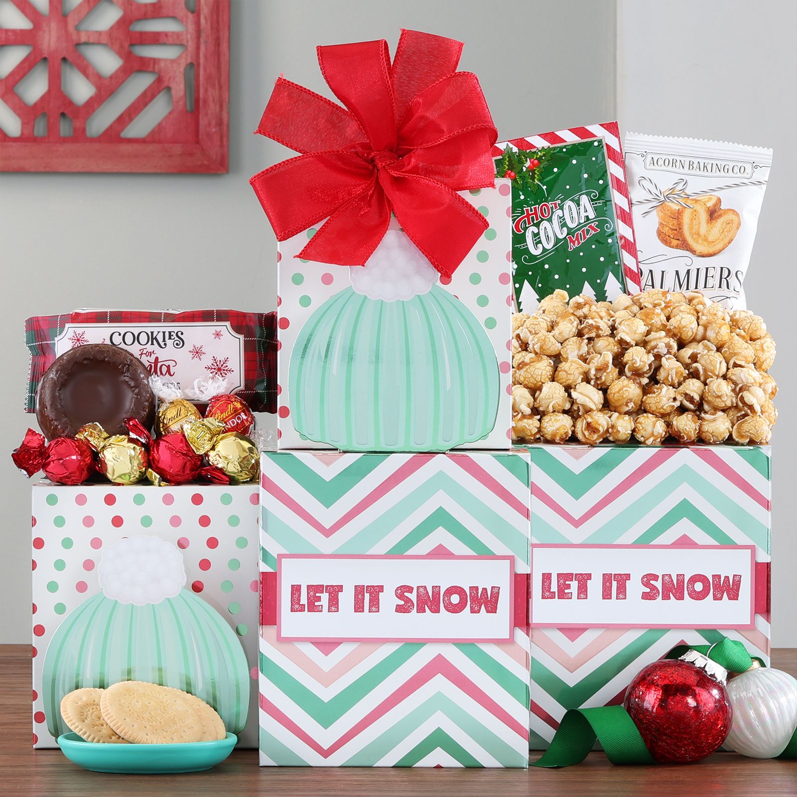 This Let it Snow gift tower is a gift anyone will love. The decorative boxes are filled with delicious cookies, hot cocoa, caramel corn, chocolate souffle & chocolates from Lindt and Rovelli.