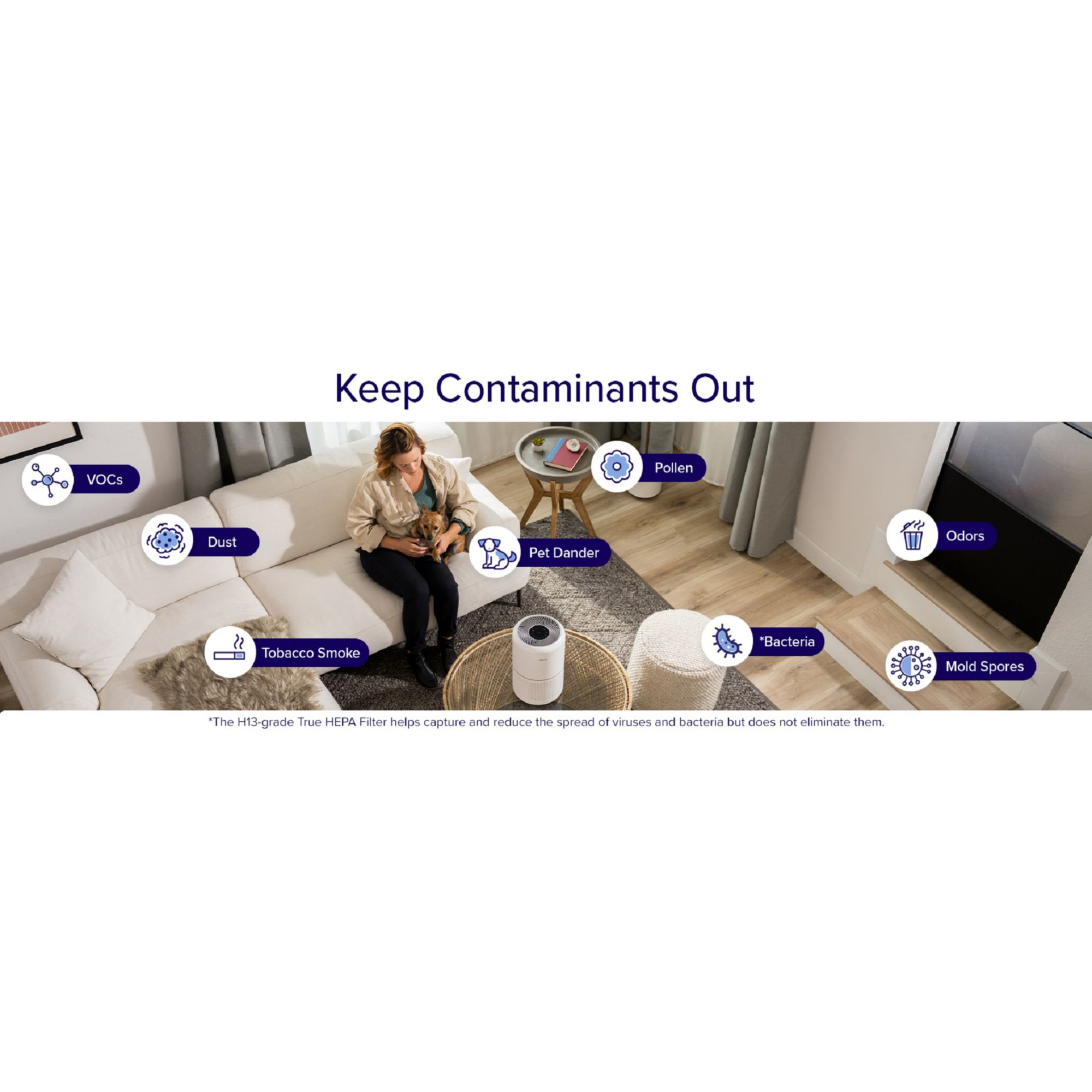 The Levoit Air Purifier keeps airborne contaminants out of your home with a three-stage filtration system that removes 99.97% of 0.3-micron particles. The filter traps fine particles and allergens, and the high-efficiency activated carbon filter absorbs and decomposes odors. The Levoit Core-RAC is for bedrooms and large rooms, covering up to 219 sq. ft.