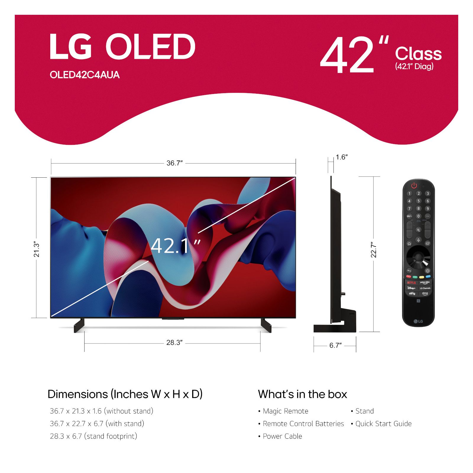 Includes magic remote MR24 (2 AA batteries), power cable, quick start guide, E-manual