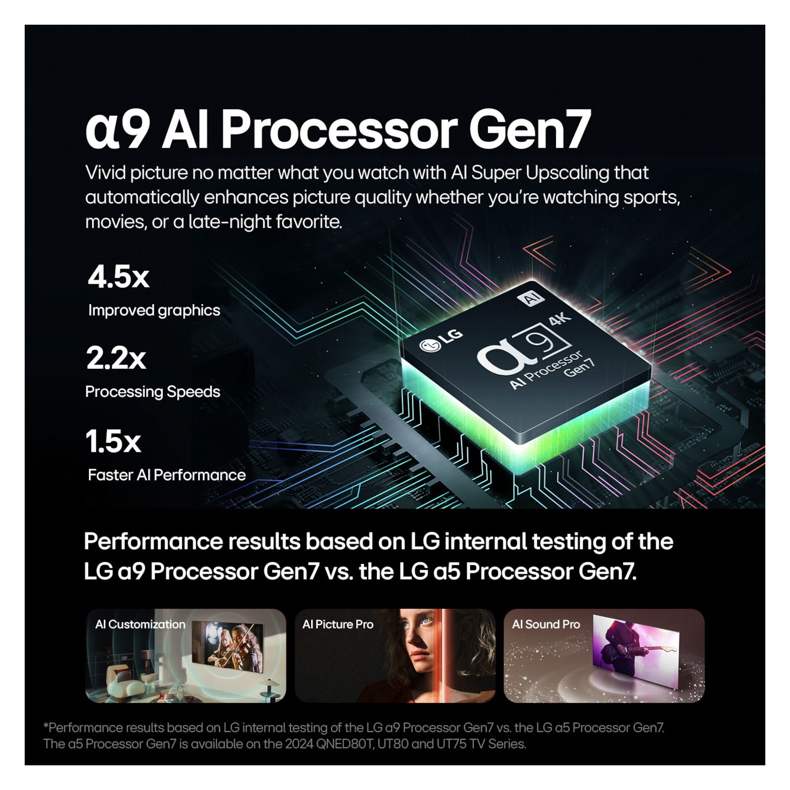 Stellar picture no matter what you watch: You'll get a smooth, vivid picture no matter what you watch with AI Super Upscaling, which automatically enhances picture quality whether you're watching sports, movies, or a late-night favorite. Thanks to LG's AI Processor Gen7