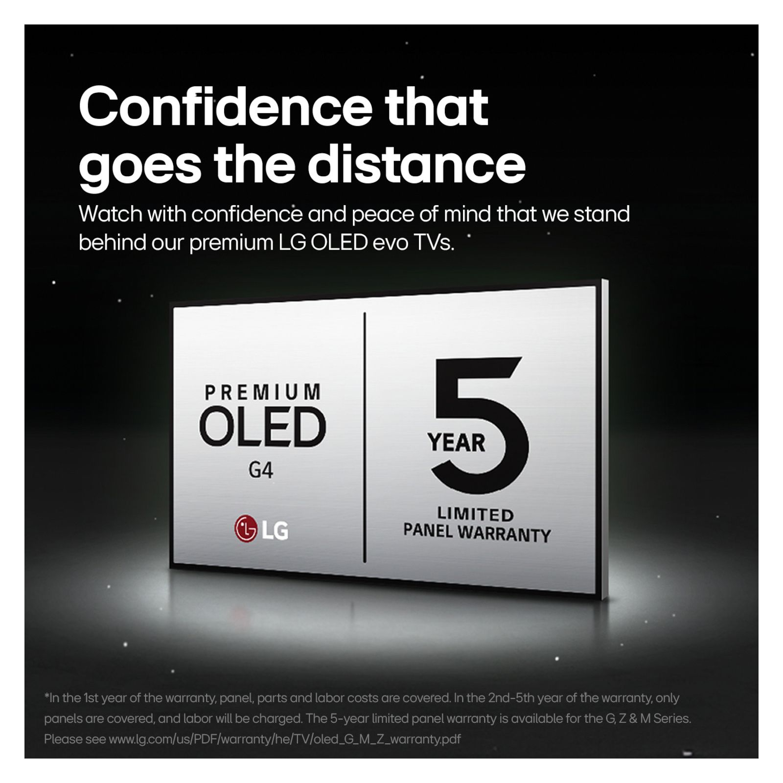 Self-lit Pixels - LG's flagship OLED technology creates an incredible watching experience and stellar picture quality illuminated with over 8 million self-lit pixels Brightness Booster Max - LG’s brightest, most vivid OLED, the OLED evo G4, is 150% brighter than our B4 series thanks to LG’s exclusive Brightness Booster Max and micro-lens array (MLA) technologies which magnify the glow of each pixel. The result is luminous picture that makes every detail shine – only from LG α11 AI Processor - The peak watching experience from our fastest processor yet. Enjoy smooth, crisp picture and sound no matter what you watch with AI Picture Pro and Super Upscaling 5-Year Panel Warranty - With a 5-year panel warranty—and industry-leading tech perfected for over a decade—you can watch on and on with confidence and peace of mind that we stand behind our premium LG OLED evo TVs Includes Magic Remote MR24 with NFC with 2 AA batteries, Power Cable, Quick Start Guide, E-Manual (Stand Sold Separately)