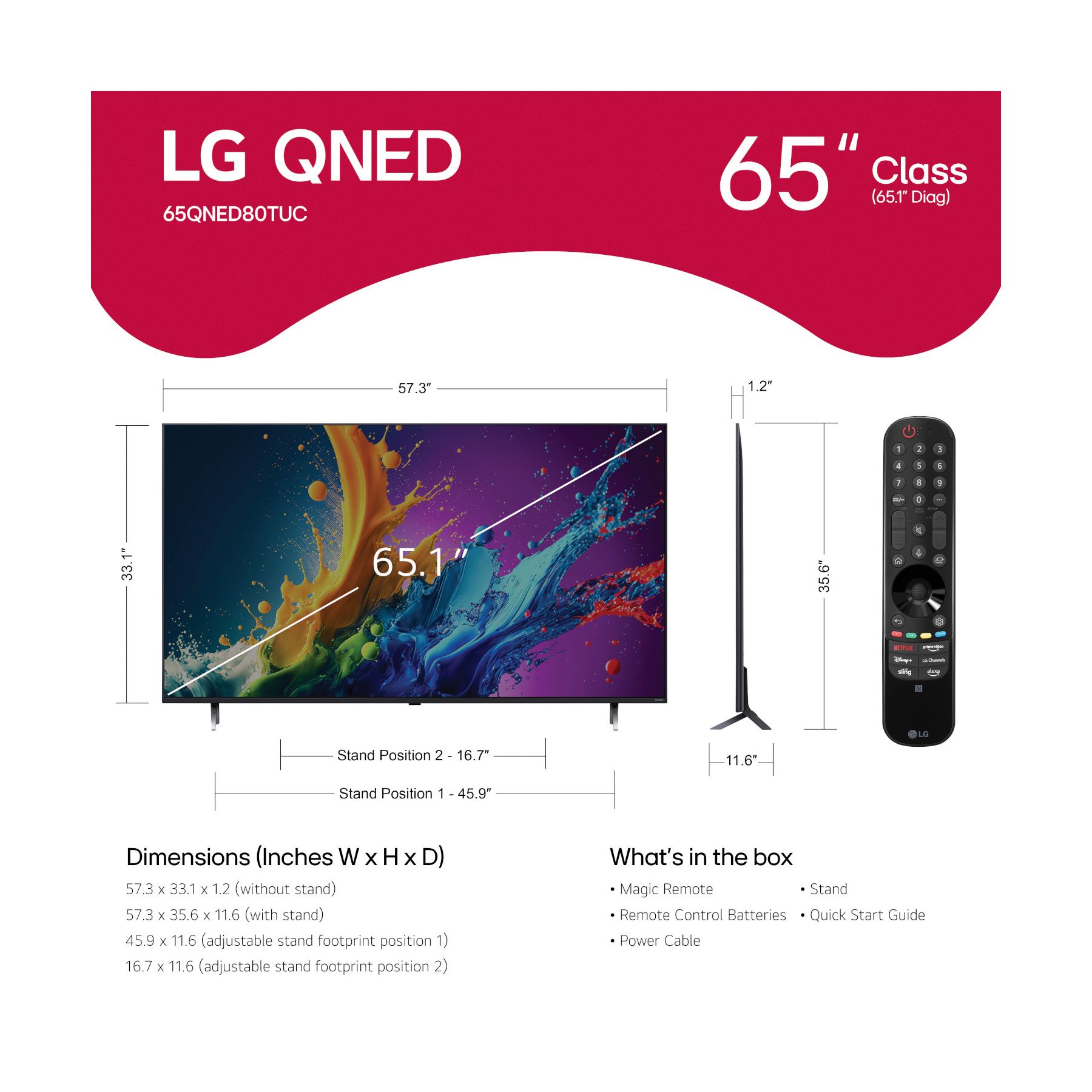 Magic Remote MR24 with 2 AA batteries, Power Cable, Quick Start Guide, E-Manual Enhanced Color Contrast - See more natural-looking images. Powerful deep-learning algorithms help improve contrast ratio and enhance brightness. Quantum Dot Nano Cell Technology - LG QNED combines cutting-edge Quantum Dots with LG's Nano Cell technology to create uniquely bright, colorful images. Dimming Pro dynamically adjusts the back lights to maintain deep black levels, allowing you to be immersed. α5 AI Processor Gen7 - Enhanced brightness, improved sound, refined picture detail. It all comes together for a thrilling watching experience powered by the α5 AI Processor Gen7. HDR10 Pro - HDR10 Pro delivers a dramatic visual experience and elevated picture quality by enhancing each color on your screen for a "wow" effect.