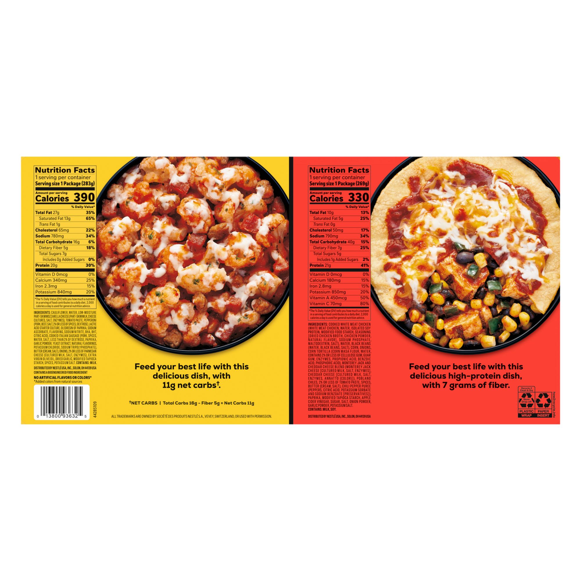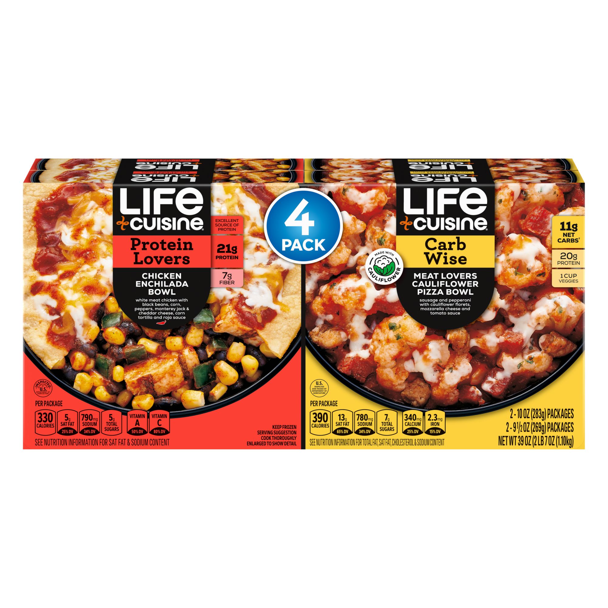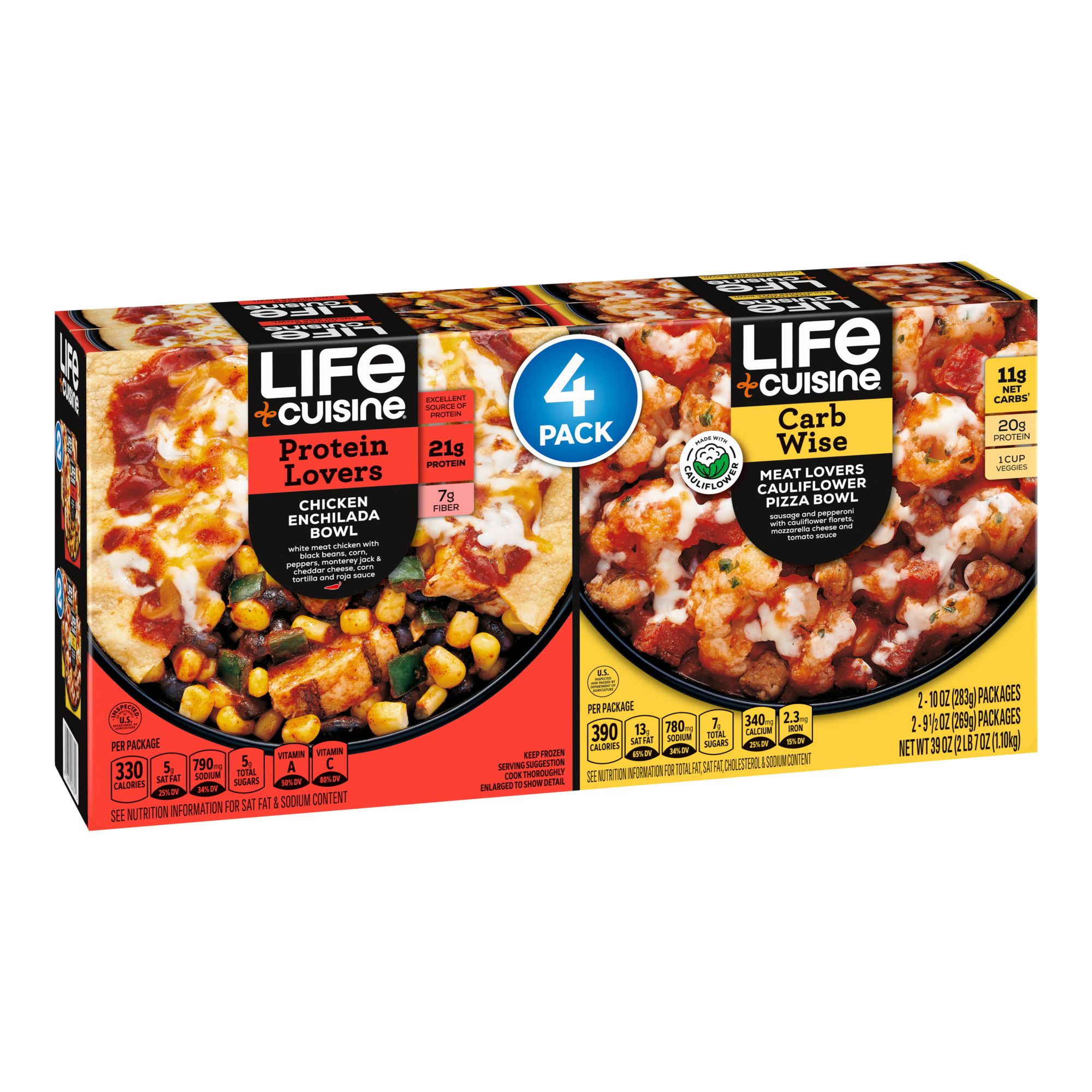 Feed your best life with Life Cuisine Low Carb Protein Bowls, a delicious frozen meal to fit your low carb lifestyle. Life Cuisine Low Carb Protein Bowls contains two delicious recipes. The Meat Lovers Cauliflower Pizza Bowl is made with 22 grams of protein and 12 grams of net carbs. This easy-to-make, 430-calorie frozen dinner features Italian sausage and pepperoni made with pork and beef mixed with cauliflower florets, mozzarella cheese and tomato sauce. This frozen bowl also offers essential nutrients, including 30% DV of calcium and 15% DV of iron. The Protein Lovers Chicken Enchilada Bowl is made with 22 grams of protein and 8 grams of fiber per serving. This easy-to-make, 350-calorie frozen bowl features white meat chicken, black beans, corn, peppers, Monterey Jack and cheddar cheeses with enchilada sauce and a corn tortilla. This frozen meal is an excellent source of protein and also provides essential nutrients, including 80% DV of Vitamin C and 50% DV of Vitamin A, for a satisfying frozen entree you can feel good about. Each 11-ounce microwave pizza bowl can be enjoyed on its own or served with a side salad as part of an easy meal. Quick and easy to prepare, this microwave meal is ready in minutes and makes a convenient lunch, dinner or snack at home or in the office. Life Cuisine frozen dinners are not your father's TV dinners. These microwave meals and snacks are carefully crafted with exciting flavors and thoughtful ingredients that feed your body and lift your spirits.