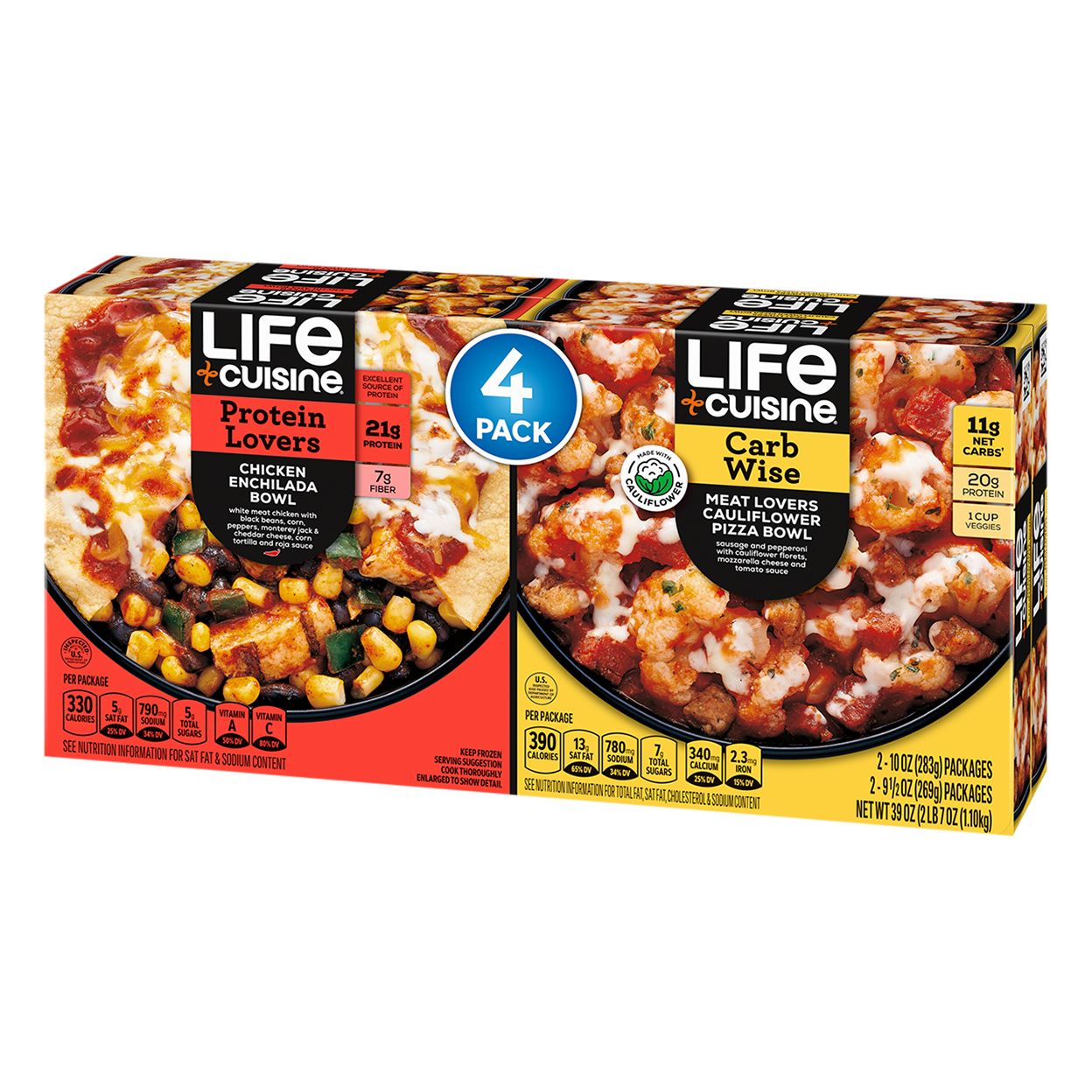 Variety pack with two units of Life Cuisine Carb Wise Meat Lovers Cauliflower Pizza Bowl and two units of Life Cuisine Protein Lovers Chicken Enchilada Bowl