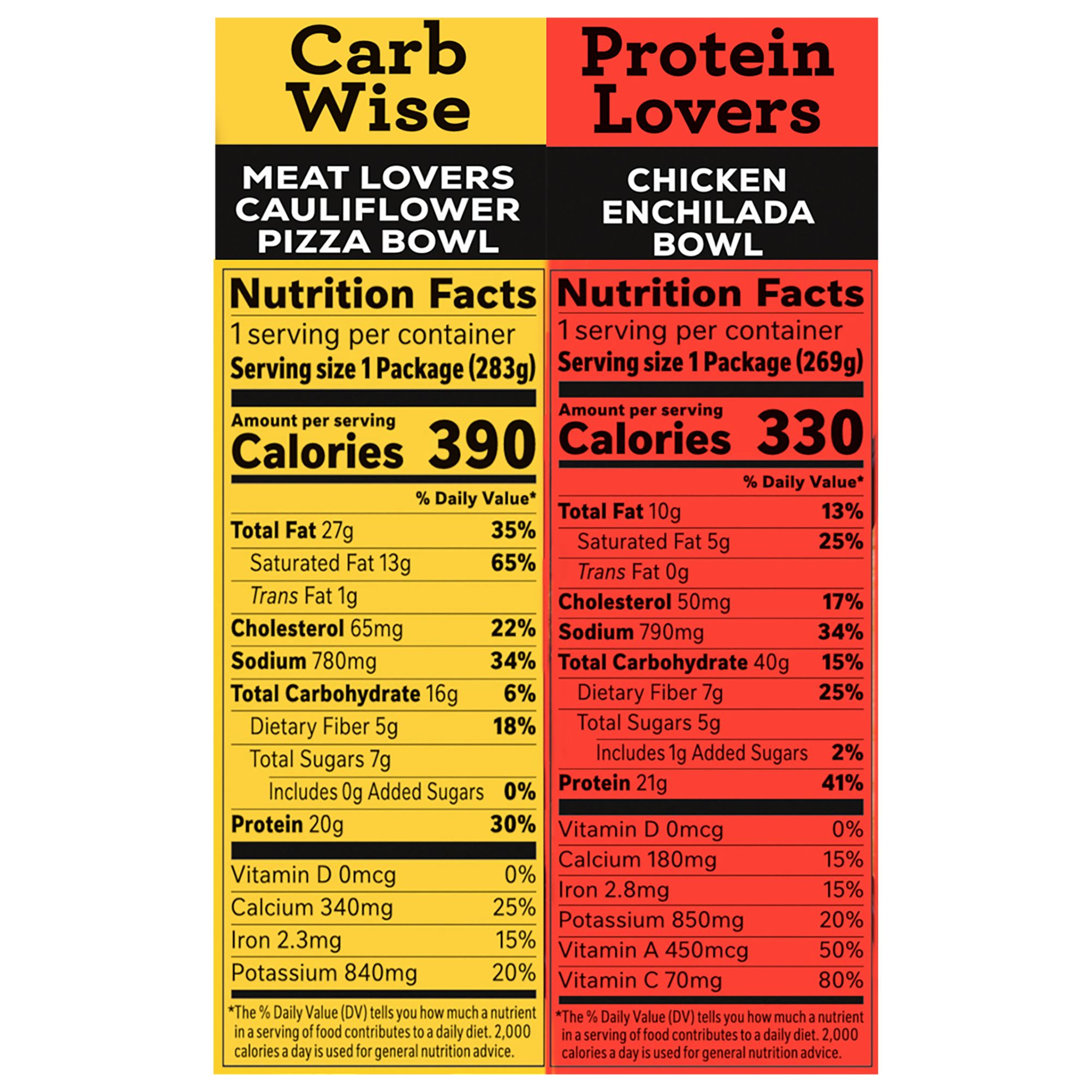 Ingredients: Meat Lovers Cauliflower Pizza Bowl: Cauliflower, Water, Low-moisture Part-skim Mozzarella Cheese (Cultured Part-Skim Milk, Salt, Enzymes), Tomato Paste, Pepperoni (Pork, Beef, Salt, 2% Or Less Of Spices, Dextrose, Lactic Acid Starter Culture, Oleoresin Of Paprika, Sodium Ascorbate, Flavoring, Sodium Nitrite, Bha, Bht, Citric Acid), Cooked Italian Sausage (Pork, Spices, Water, Salt, Less Than 2% Of Dextrose, Paprika, Garlic Powder, Yeast Extract, Natural Flavorings, Potassium Chloride, Sodium Tripolyphosphate), Butter (Cream, Salt), Onions, 2% Or Less Of Parmesan Cheese (Cultured Milk, Salt, Enzymes), Modified Cornstarch, Extra Virgin Olive Oil, Dried Garlic, Basil, Spices, Potassium Salt. Protein Lovers Chicken Enchilada Bowl: Cooked White Meat Chicken (White Meat Chicken, Water, Isolated Soy Protein, Modified Food Starch, Seasoning [Dried Chicken Broth, Chicken Powder, Natural Flavor], Sodium Phosphate, Maltodextrin, Salt), Water, Black Beans (Water, Black Beans, Salt), Corn, Onions, Corn Tortilla (Corn Masa Flour, Water, Contains 2% Or Less Of Cellulose Gum, Guar Gum, Enzymes, Propionic Acid, Benzoic Acid, Phosphoric Acid), Monterey Jack And Cheddar Cheese Blend (Monterey Jack Cheese [Cultured Milk, Salt, Enzymes], Cheddar Cheese [Cultured Milk, Salt, Enzymes, Annatto {Color}]), Poblano Chiles, 2% Or Less Of Tomato Paste, Spices, Butter (Cream, Salt), Chili Pepper Puree (Peppers, Citric Acid, Potassium Sorbate And Sodium Benzoate [Preservatives]), Paprika, Modified Cornstarch, Apple Cider Vinegar, Sugar, Salt, Onion Powder, Garlic Powder, Potassium Salt.