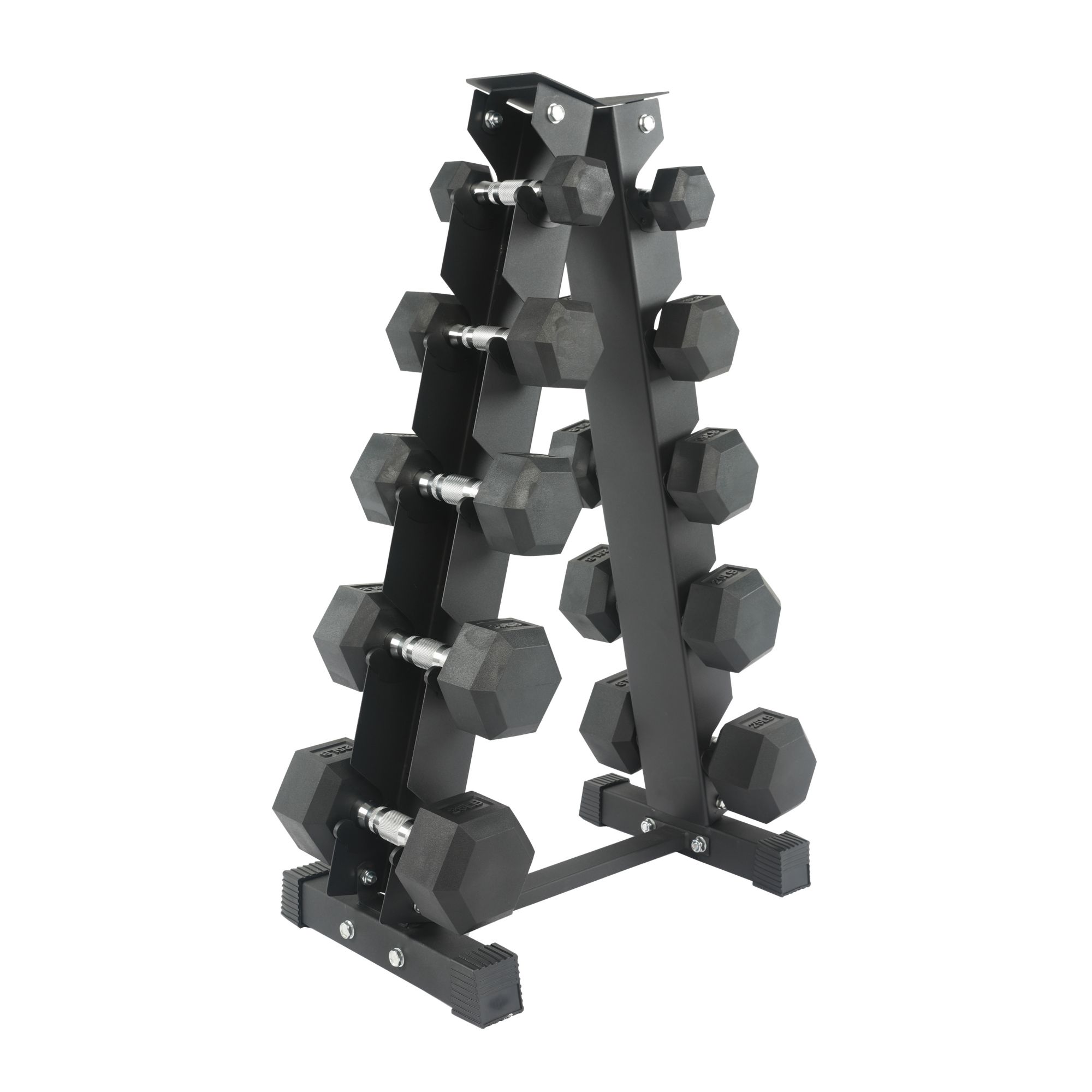 Includes pairs of 5 lb., 10 lb., 15 lb., 20 lb. and 25 lb. rubber hex dumbbells and an A-frame rack