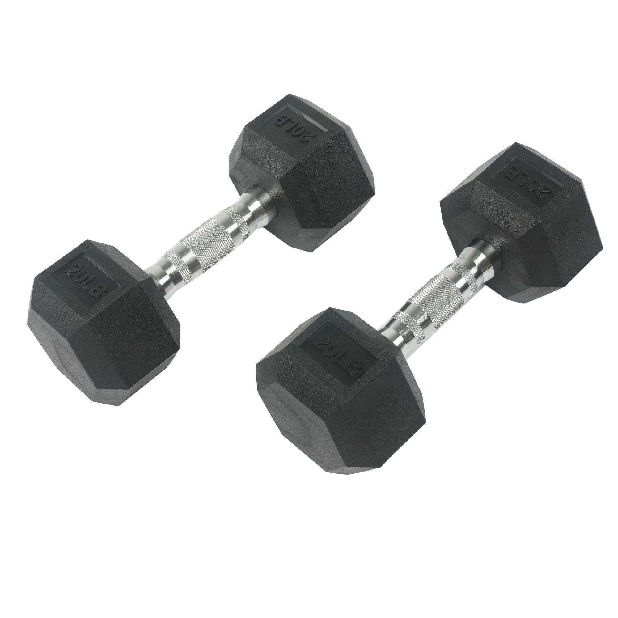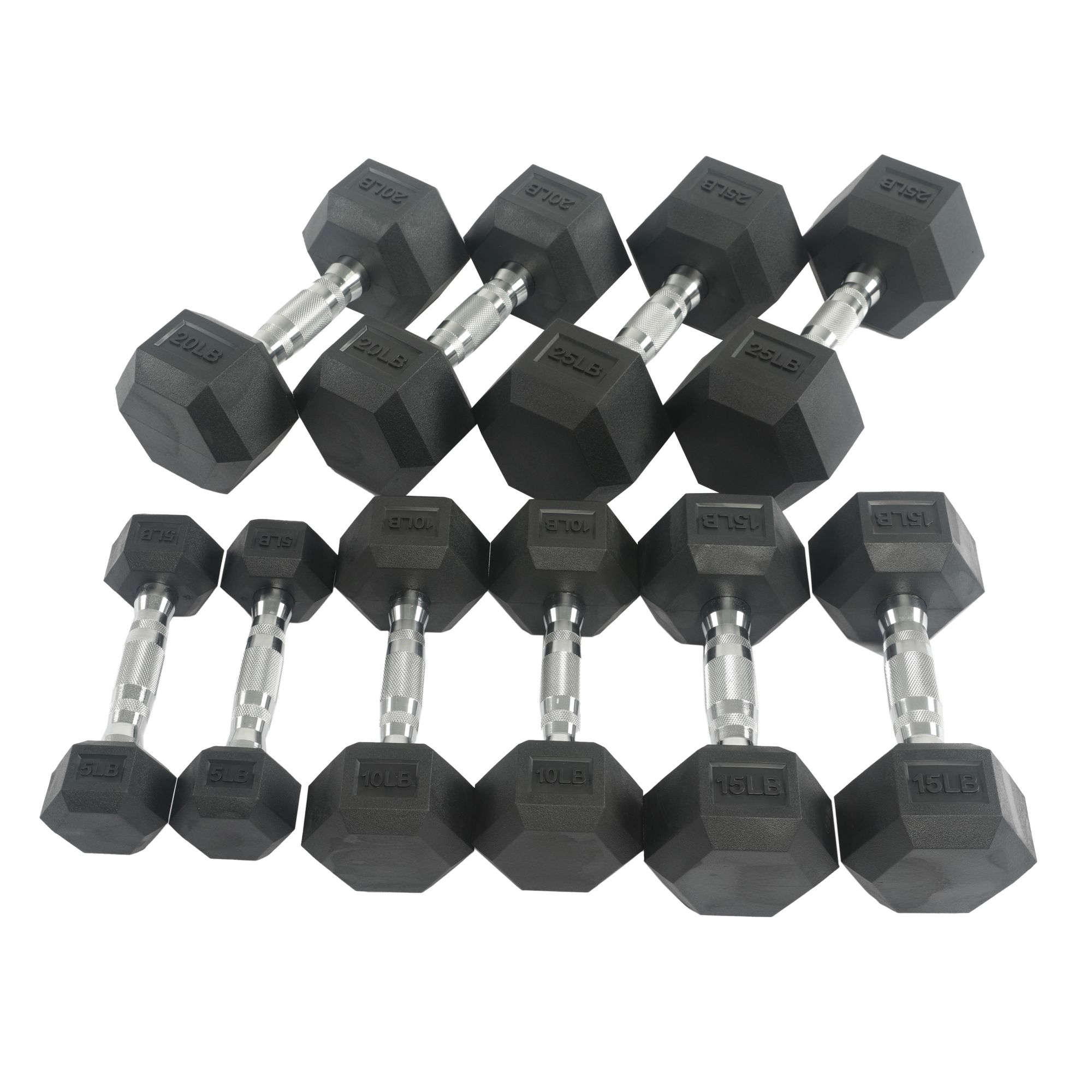 Five pairs of rubber hex dumbbells: 5 lb., 10 lb., 15 lb., 20 lb., and 25 lb.