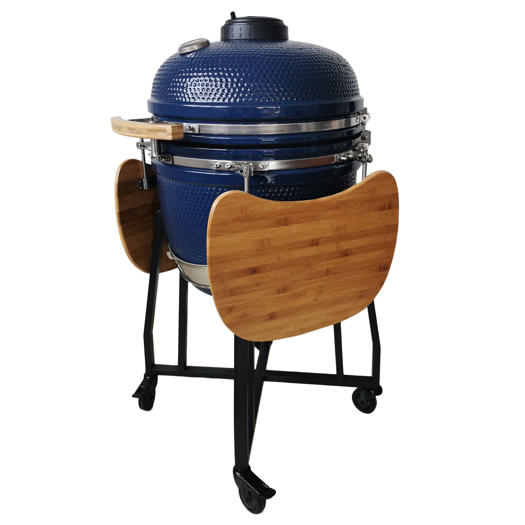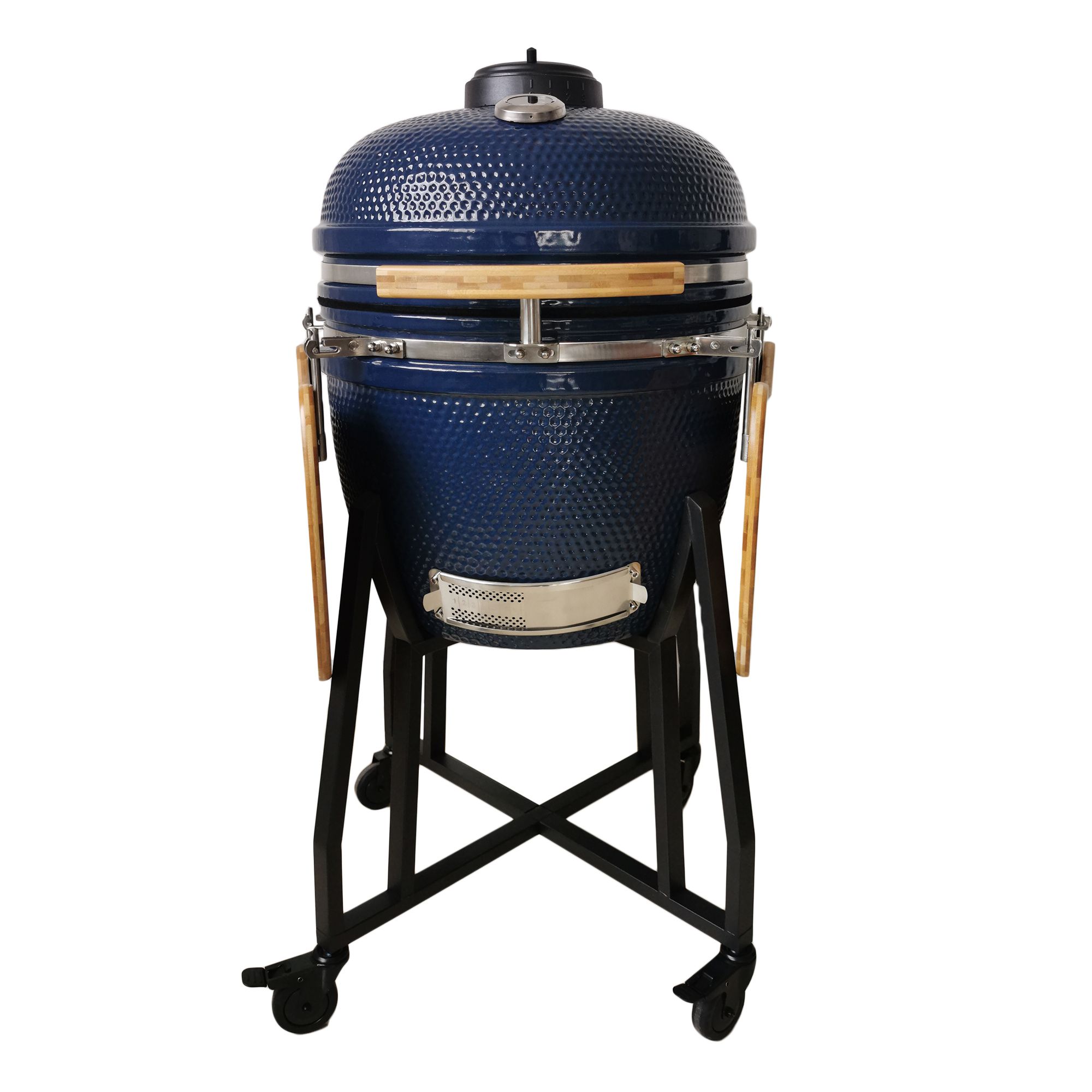 493-sq.-in. cook area over two grill grates -- grill/smoke meats on the bottom grate and sides on the second grate Bonus 3rd tier grill grate offers additional grilling surface. Swing out feature lets you easily get to the other grill grates Bonus reversible half-moon griddle can be used as a flat top griddle or grill 21" exterior shell is constructed from durable heat-retaining ceramics Black anodized steel cart with locking wheels for easily mobility on the deck or patio Top and bottom easy set airflow vents for optimum internal temperature control Cast iron charcoal tray Use lump hardwood charcoal only (not included) Some assembly required Includes Kamado grill, cart with locking wheels, two side shelves, grill cover, starter, pizza stone, half-moon grate, swing-out style grill grate Warranty: 1 year