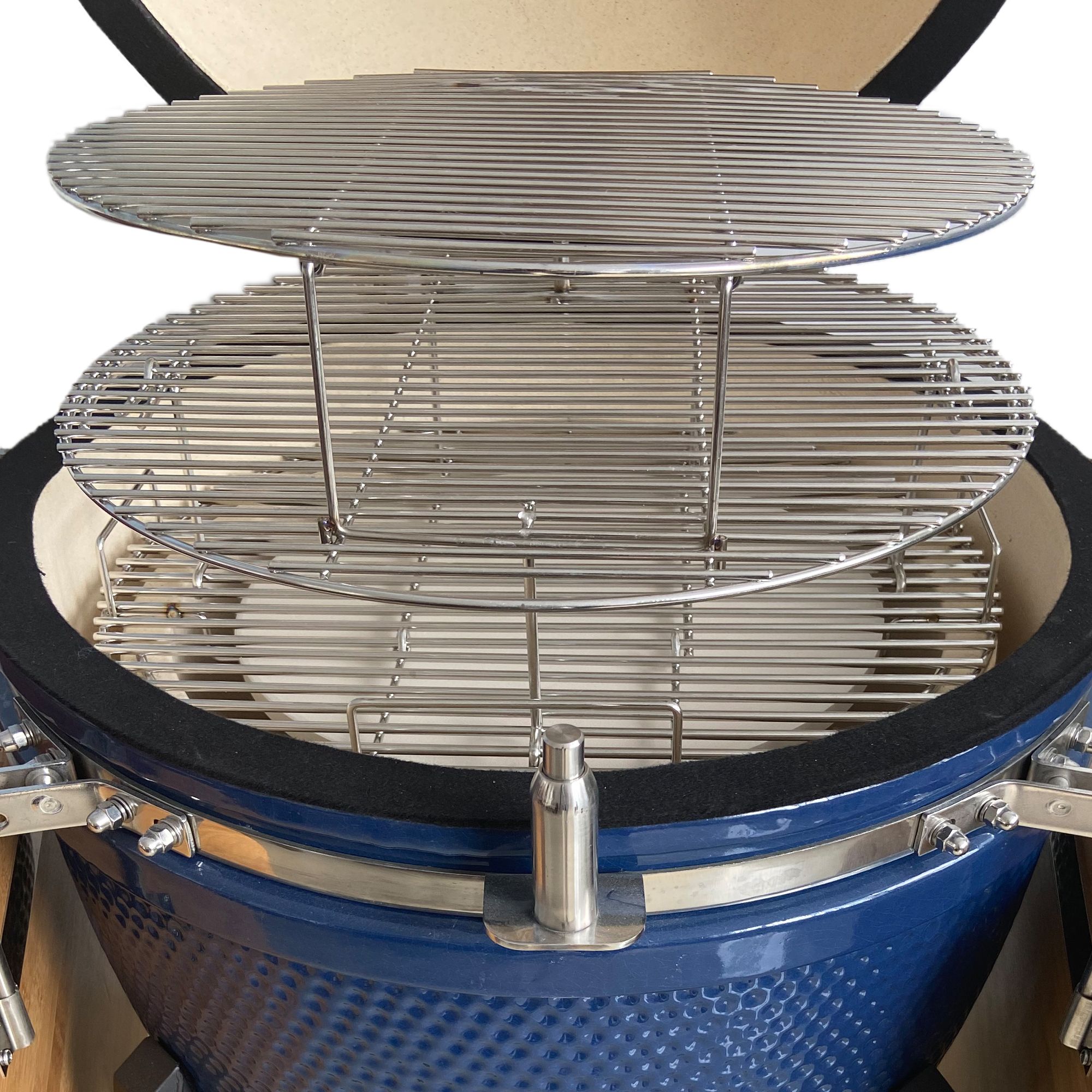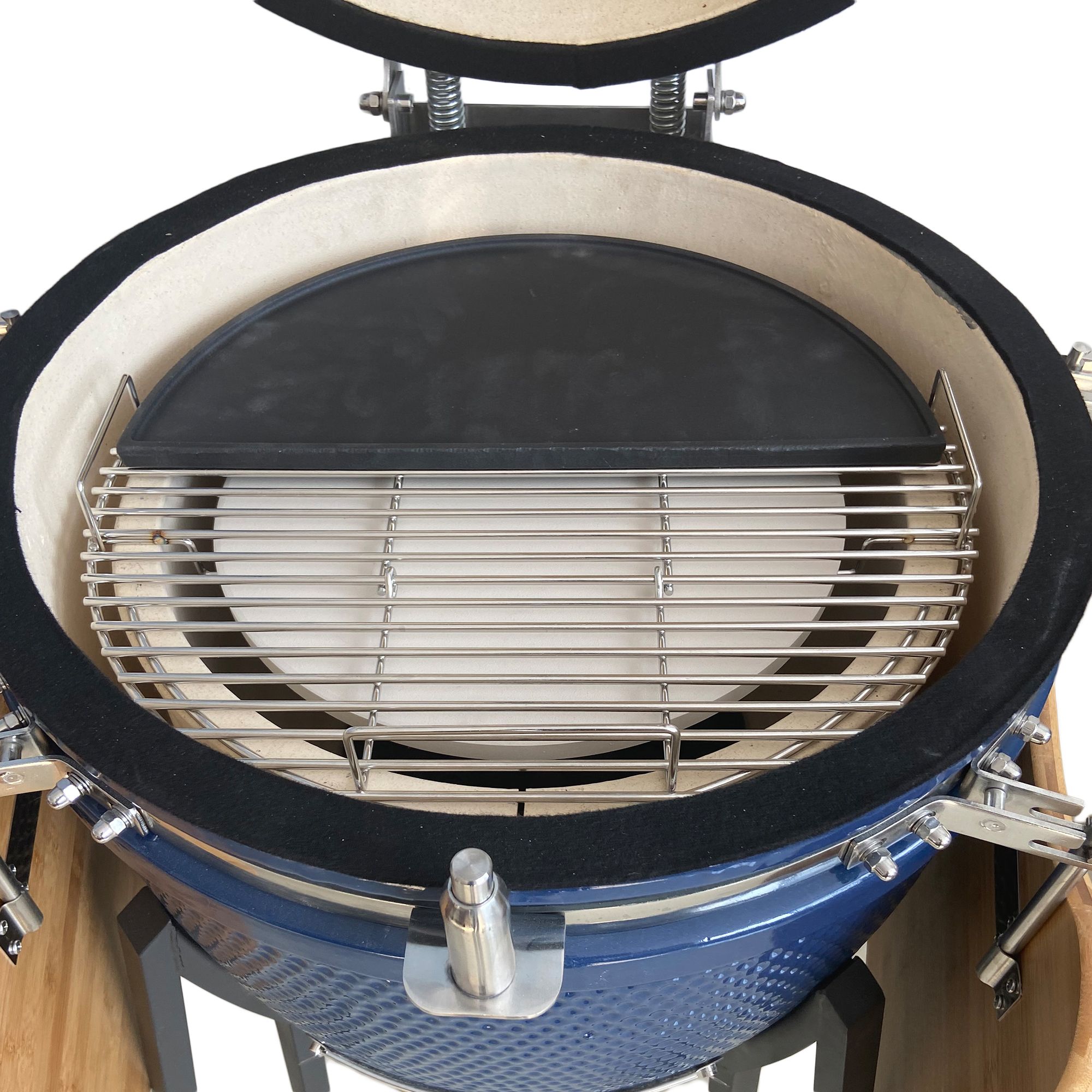 The Lifesmart 21" Kamado grill is the complete outdoor grill that allows you to sear, grill, smoke, and bake meats, sides, even desserts. All Lifesmart Kamado grills are manufactured from high-grade performance ceramics, with the ceramic shell acting as a super insulator, holding the heat in and temperature constant. Primary two stainless steel grill grates offer up to 493-sq.-in. of cook surface, perfect for meat on the bottom and a couple of sides on the second rack. Bonus 3rd tier grate provides additional grill space for meat or sides and swings out so you can easily get to the other grates in the grill. An added bonus is a half-moon reversible cast iron grate, giving the flexibility to use half of the grill grate surface as a flat top griddle to saute onions, fries, or vegetables. Flip it over and use it to create grill marks on steaks and burgers.