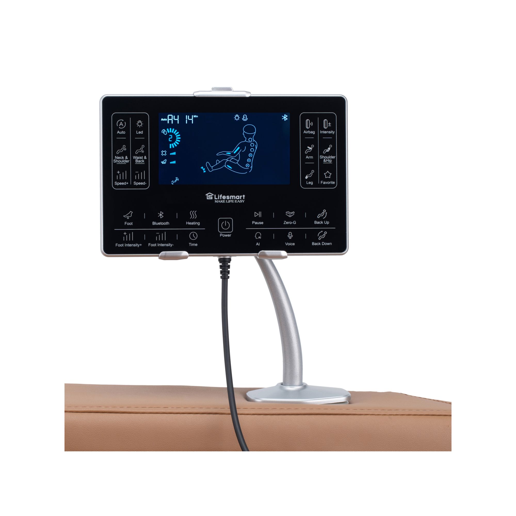 Sit back and enjoy a luxurious massage in this 2D Lux massage chair by Lifesmart. Start in one of the mulit-level zero gravity positions, designed to suspend the body into a neurtal, or floating, position, allowing for deeper relaxation and tension release. This massage chair features 14 fixed back rollers that provide massage from neck down to lower back. Air bag massage with adjustable intensity for shoulders, arms, hips, calves and feet. Manual massage modes let you choose ideal massage technique. Soothing heating element in lumbar area gradually warms to loosen up sore muscles. All massage features and programs can be conveniently controlled through the attached 4.3-inch touch screen tablet. Armrest shortcut dials feature quick start options. Built-in bluetooth speakers allow you to listen to favorite music or podcast as you relax during your massage session. Keep mobile deivces nearby and charged with USB charger conveniently located near the armrest shortcut dial. This chair is wrapped in faux leather black upholstery and offers LED ambient lightng on the side of the chair.