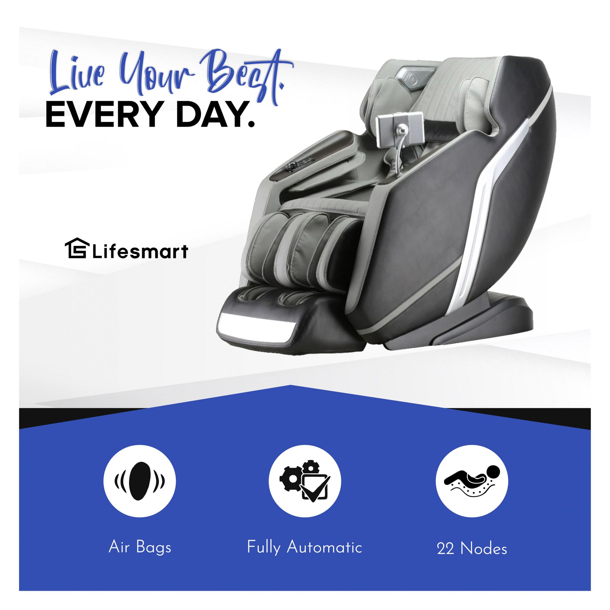 Take home massage to a new level of wellness with the Lifesmart 8658L 4D deluxe massage chair. Begin with the body mapping feature and let the chair automatically create your own customized massage. Enjoy a preset massage program or create your own for a whole-body massage experience from your shoulders to your feet. Revive tired, aching muscles with the zero-gravity position deep tissue massage. All the massage features, including a programmable timer, are at your fingertips with the handheld remote. There is also a heat feature to enhance your massage, plus you can enjoy your favorite relaxation music with the built-in Bluetooth speakers. Treat yourself to the luxury you deserve and enjoy a break from the everyday stresses of life. Includes a 4D Massage Experience utilizing an extra-long SL track and heated therapy shoulder featuring arm, waist, and calf, and feet airbags. Forty-four total compression airbags provide a deluxe massage experience and promotes enhanced blood circulation by compressing and contracting different muscles. Twelve auto pre-programmed modes to help relieve back stress and improve circulation. Massage balls rotate clockwise or counterclockwise to ease tight muscle tension. Triple foot rollers provide rolling, and kneading massage provides a relaxing foot massage. iTrack Personalize your massage therapy from your neck all the way down to your legs using auto pre-programmed 15-minute massage modes or select a more custom massage with the manual massage modes.