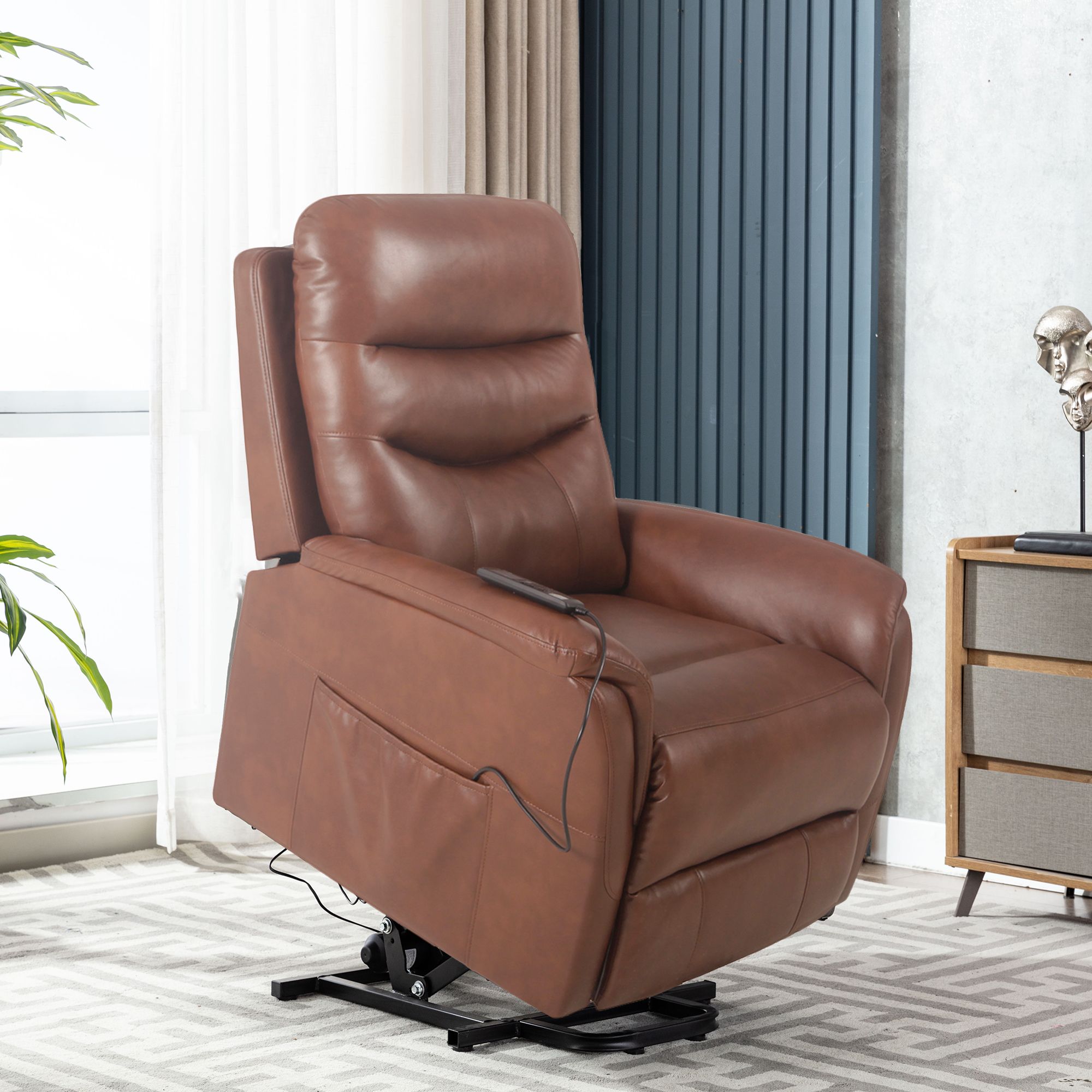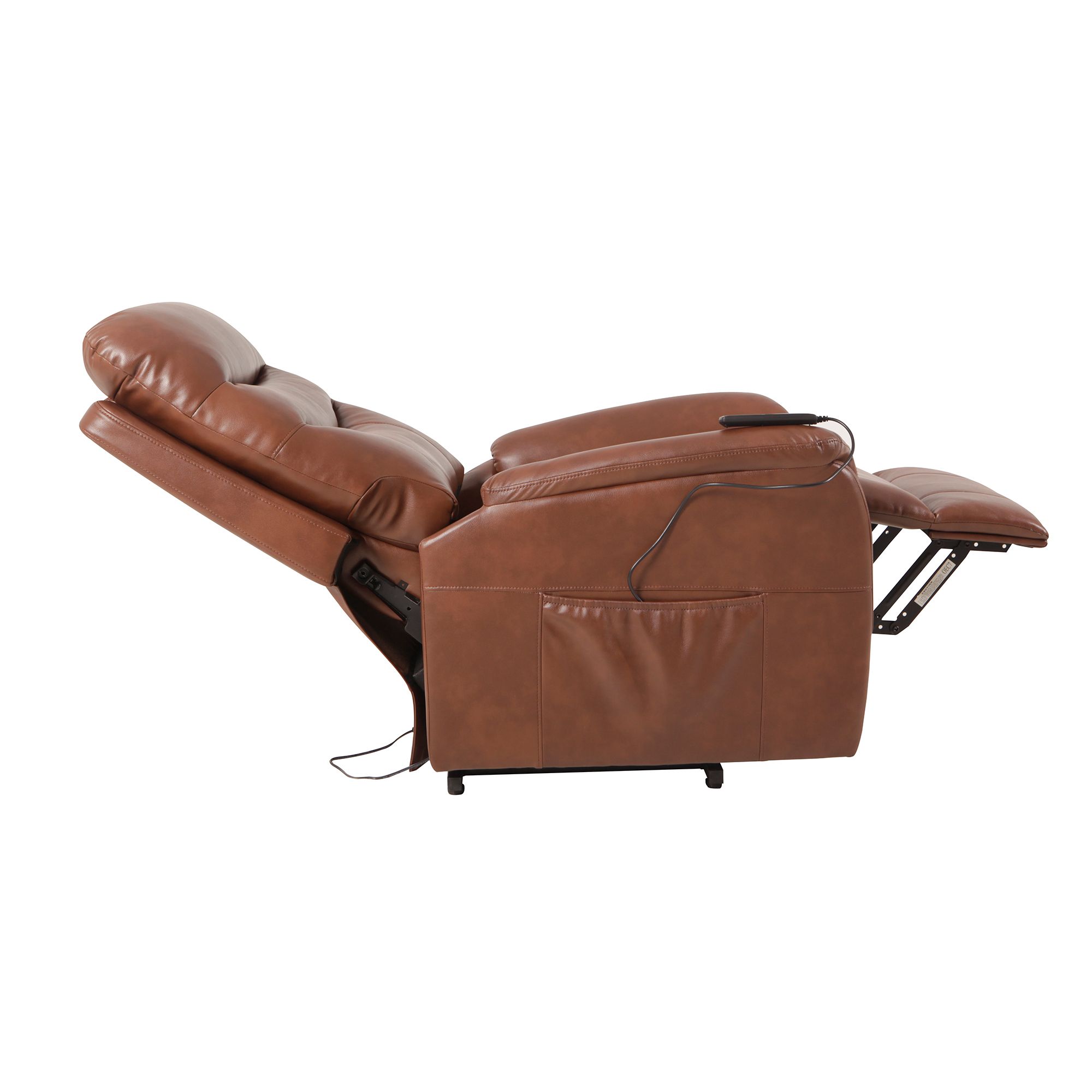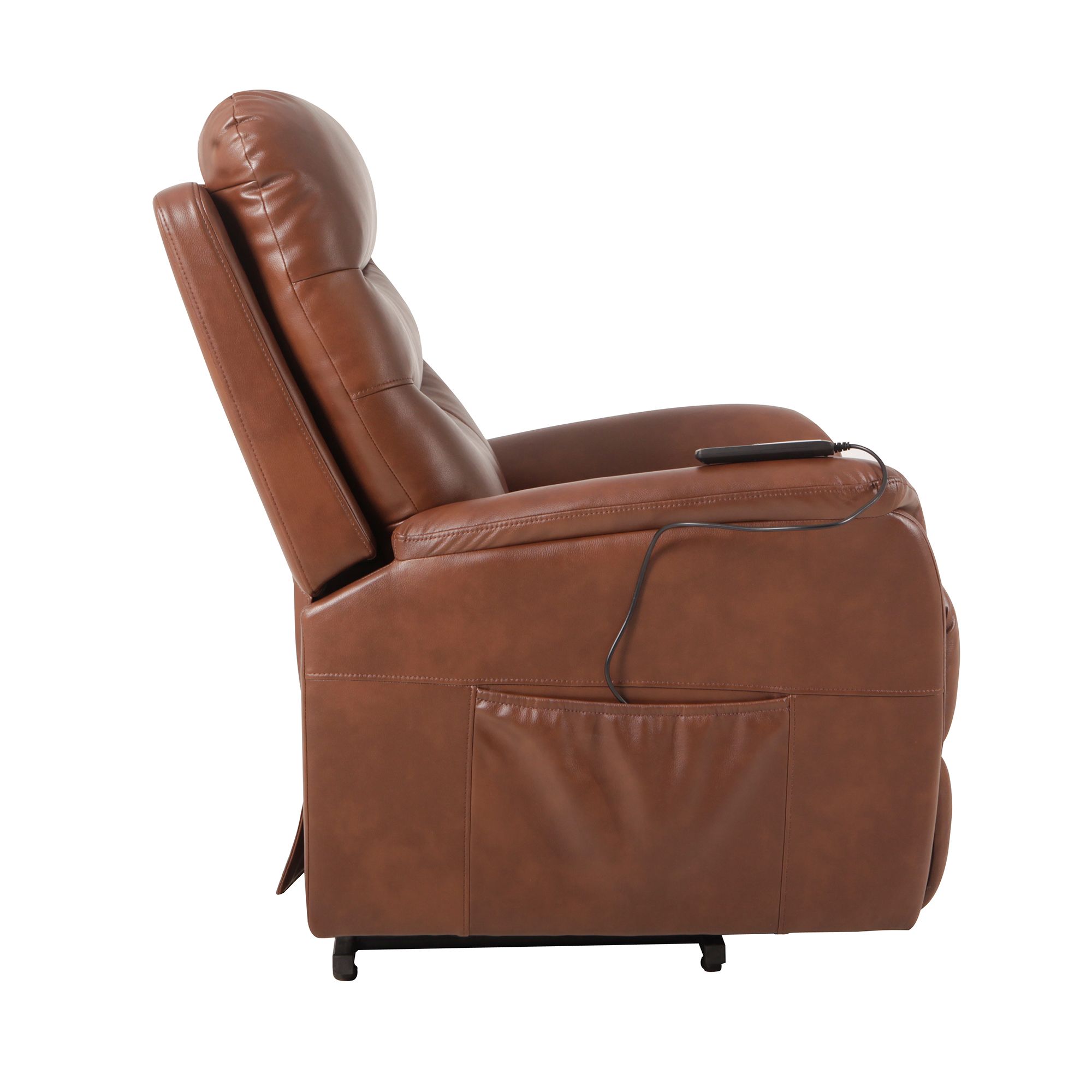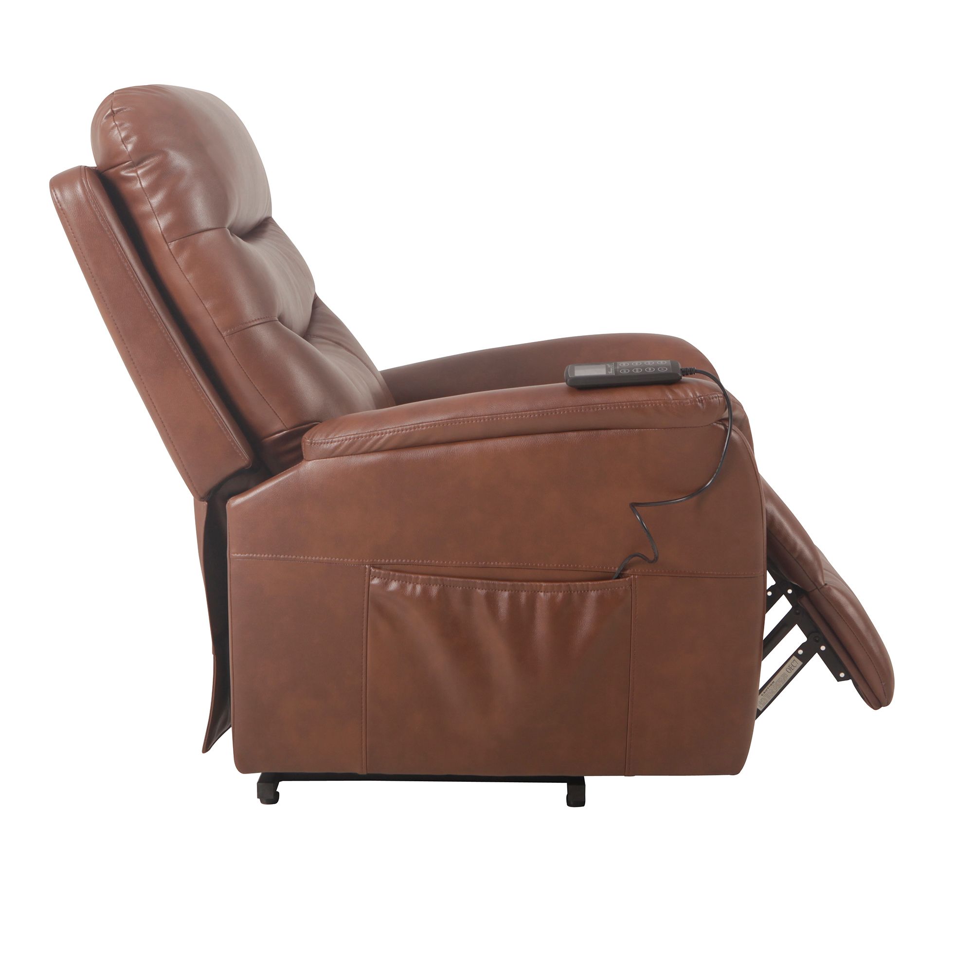 The Lifesmart Power Lift Chair Recliner with built-in massage and heat allows you to sit back and relax in comfort. This lift chair allows people who are challenged with stability or back and leg weakness to safely and easily sit down or stand up. A heating element around the lumbar area provides a gentle and soothing heat for aches lower back muscles. The multi-point variable intensity massage feature offers an element of total relaxation while sitting in a chair. All functions are controlled by a corded remote control that never needs batteries. The lift chair functions are stand to sit, sit to stand, and recline. The chair's versatility allows use as a lift chair or just a recliner. The chair is wrapped in a durable and comfortable brown faux leather upholstery and built on a solid metal braced frame to hold people up to 225 lbs.