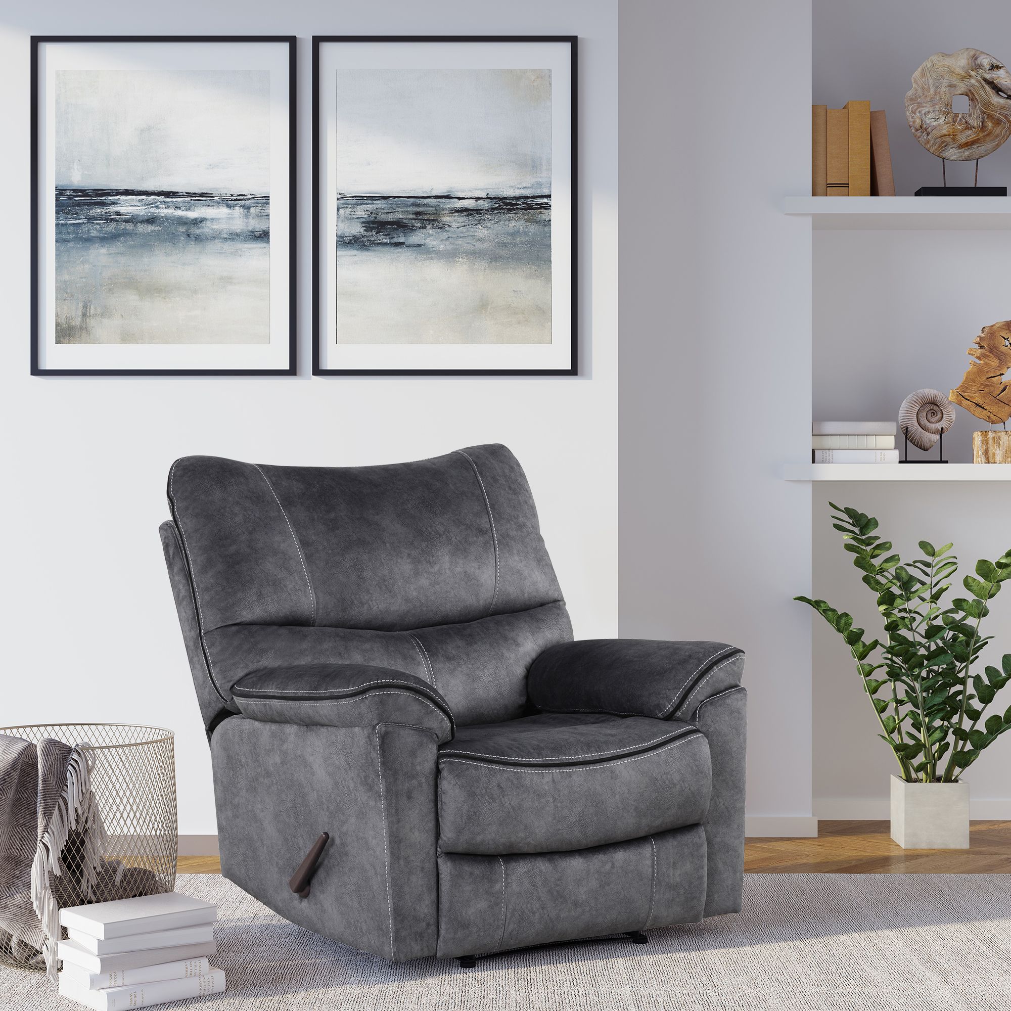 The Lifestyle Solutions Jefferson is a single-seat recliner made for full-body support providing a weightless feel and total relaxation. This recliner is durable and easy to clean, featuring solid structure, pocket coils, and high-quality dark gray fabric. Its manual pull handle gives a smooth, quiet, and effortless recline as you sit back and relax in style and ultimate comfort. The Jefferson Recliner is fitted with a padded cushion and back in high-density foam providing exceptional support. Combining simplicity and style, the Jefferson is ready for many years of enjoyment in your home.