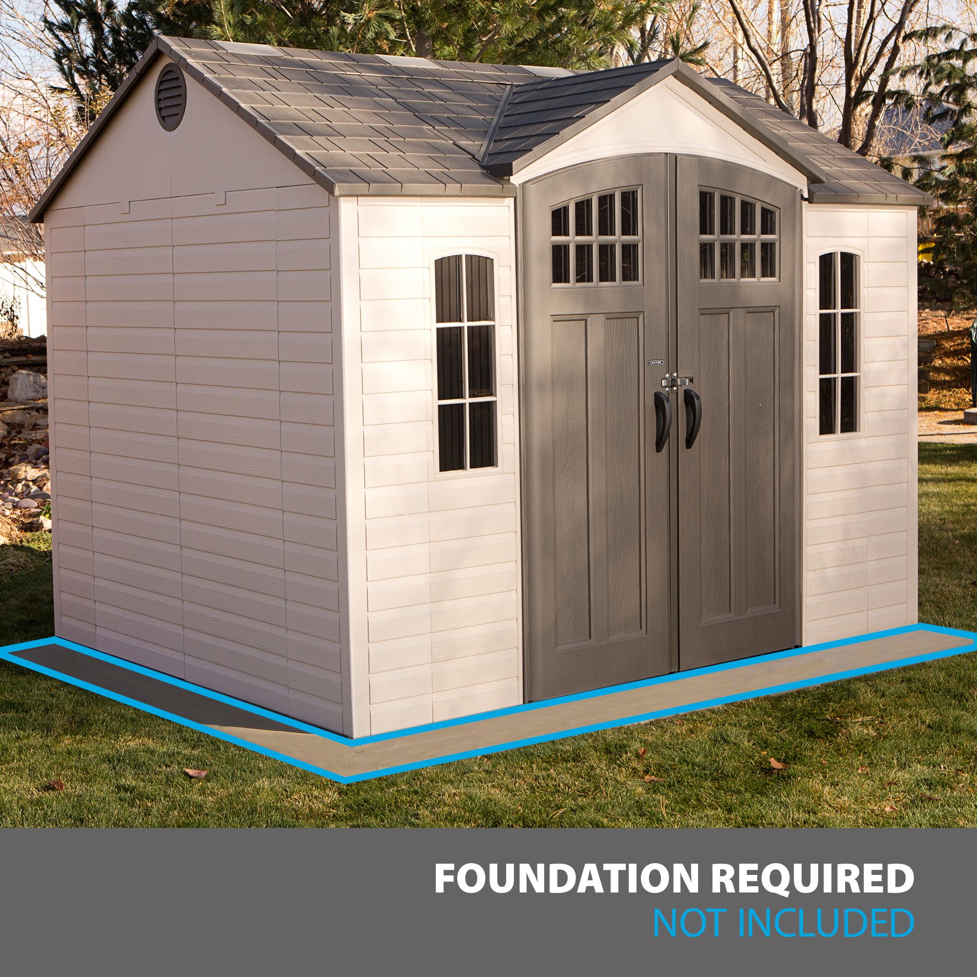 The 10-foot wide sheds from Lifetime Products give you that extra space needed while accenting the beauty of your backyard. The centralized location of the doors provides easy storage access and the decorative shutters, molded wood-grain panels, and simulated shingled roof ensure an attractive design that will be the envy of your neighborhood.