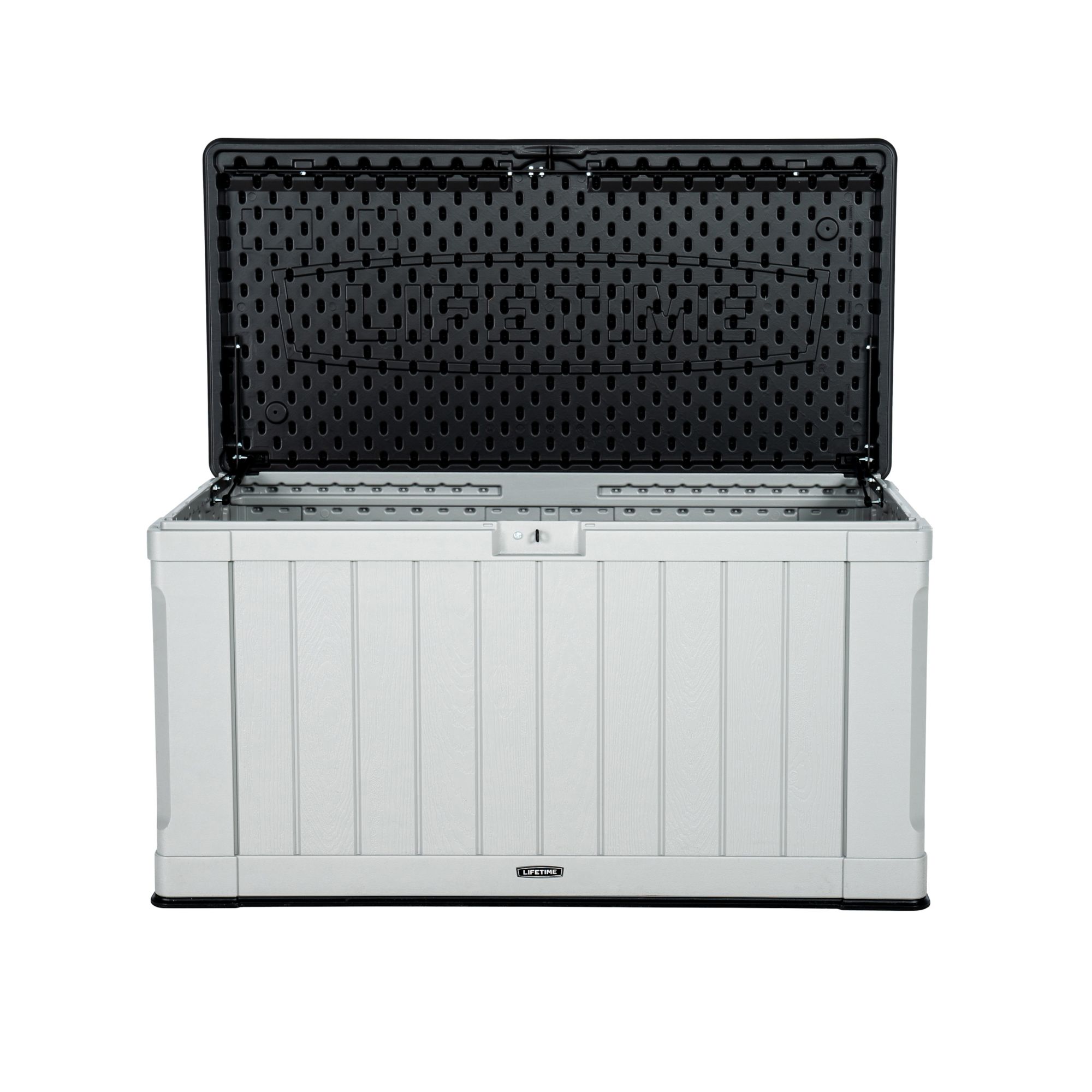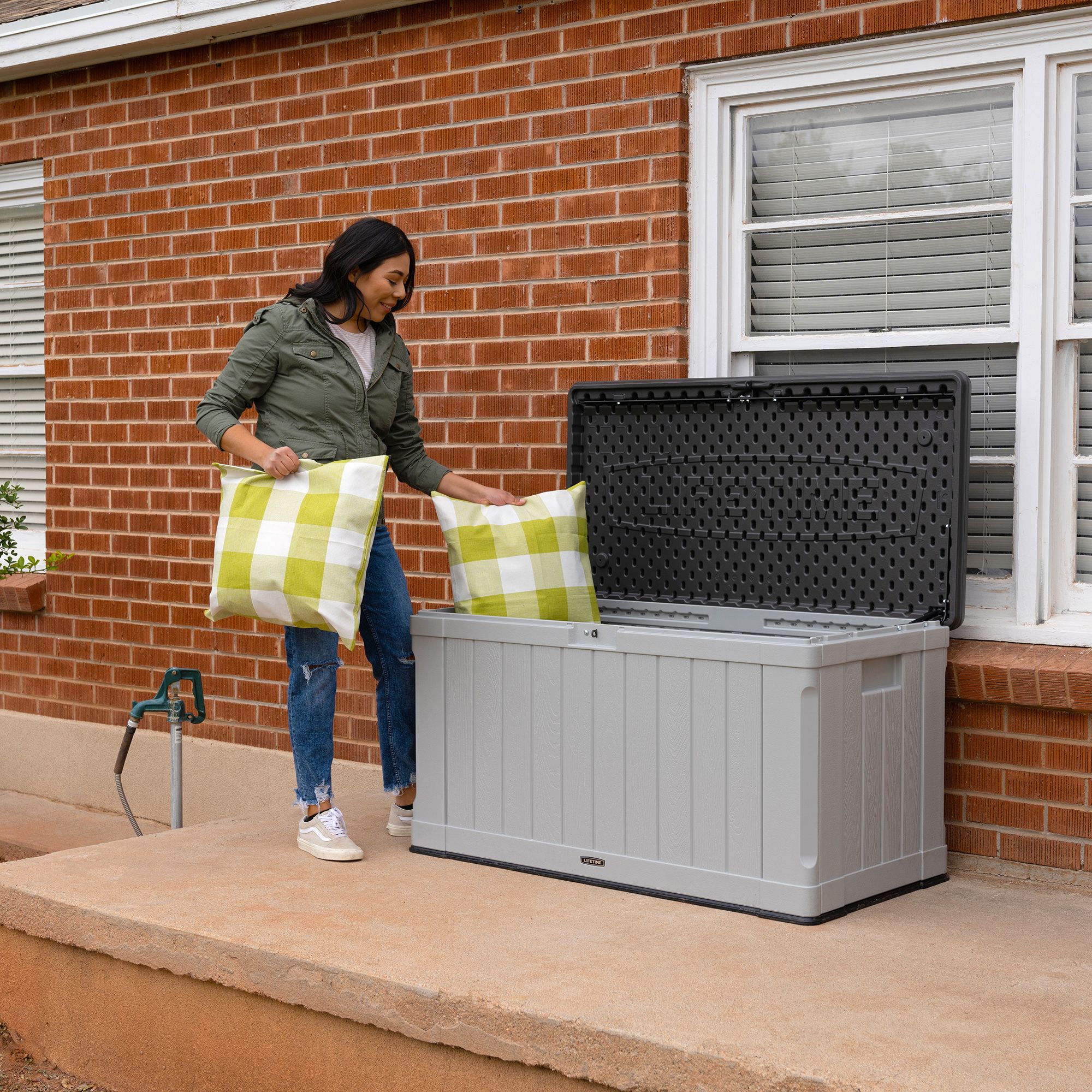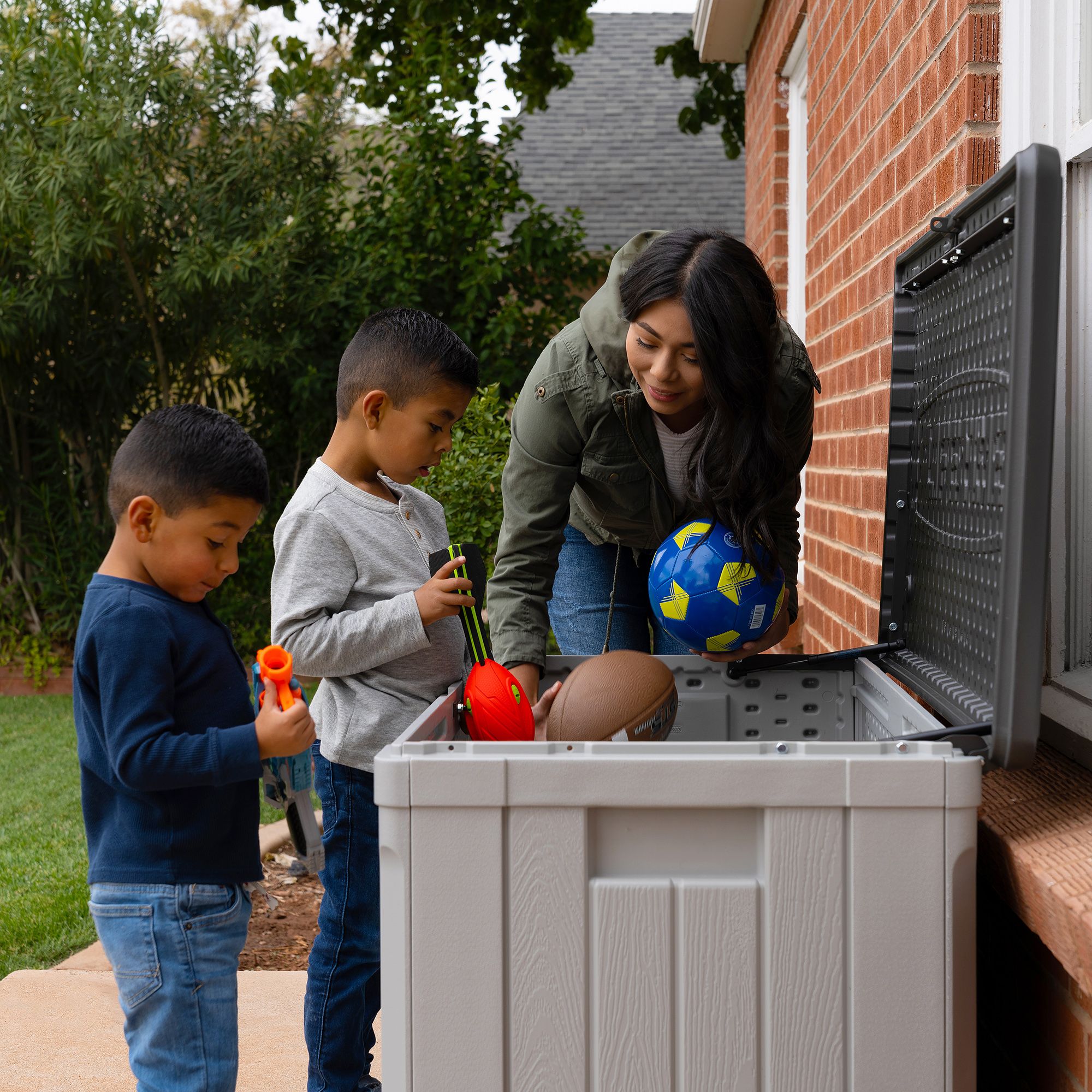 Need a more convenient place to store items around your yard? Lifetime’s Deck Boxes are the perfect way to expand your storage and get better access to items you use regularly around your yard. Whether you have gardening tools, lawn equipment, yard games, or even outdoor seat cushions, the Deck Box makes them easy to store and find when needed. It is durable, UV-protected, and weather resistant to ensure your belongings have years of protection. The lid is lockable (lock not included) to provide even greater security and has a controlled spring-hinge for easy opening and closing. It has molded side handles for easy transport making it easy to move around your yard or patio and it is even sturdy enough to be used as a bench. The Lifetime Deck Box blends durability, convenience and style to create a versatile storage solution.