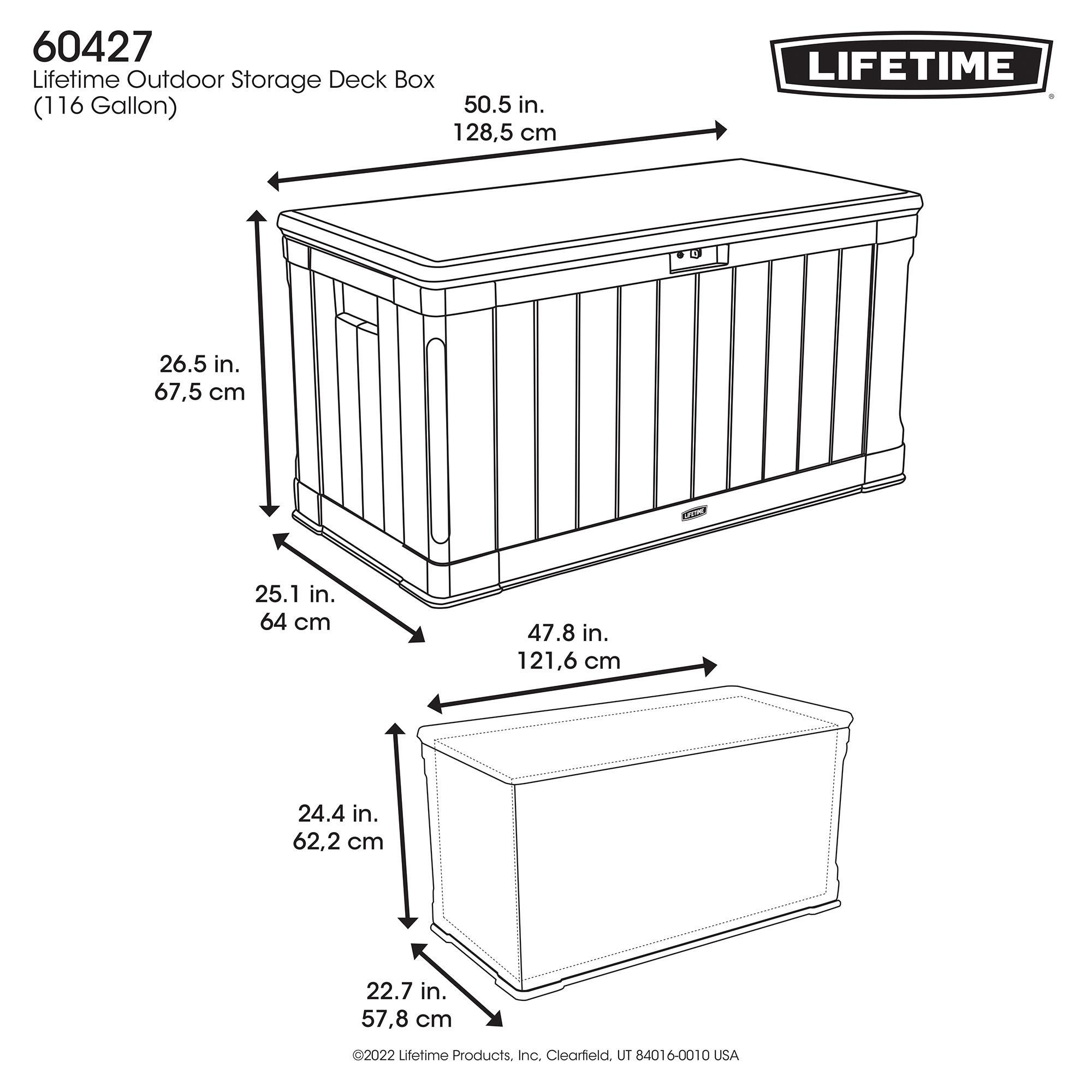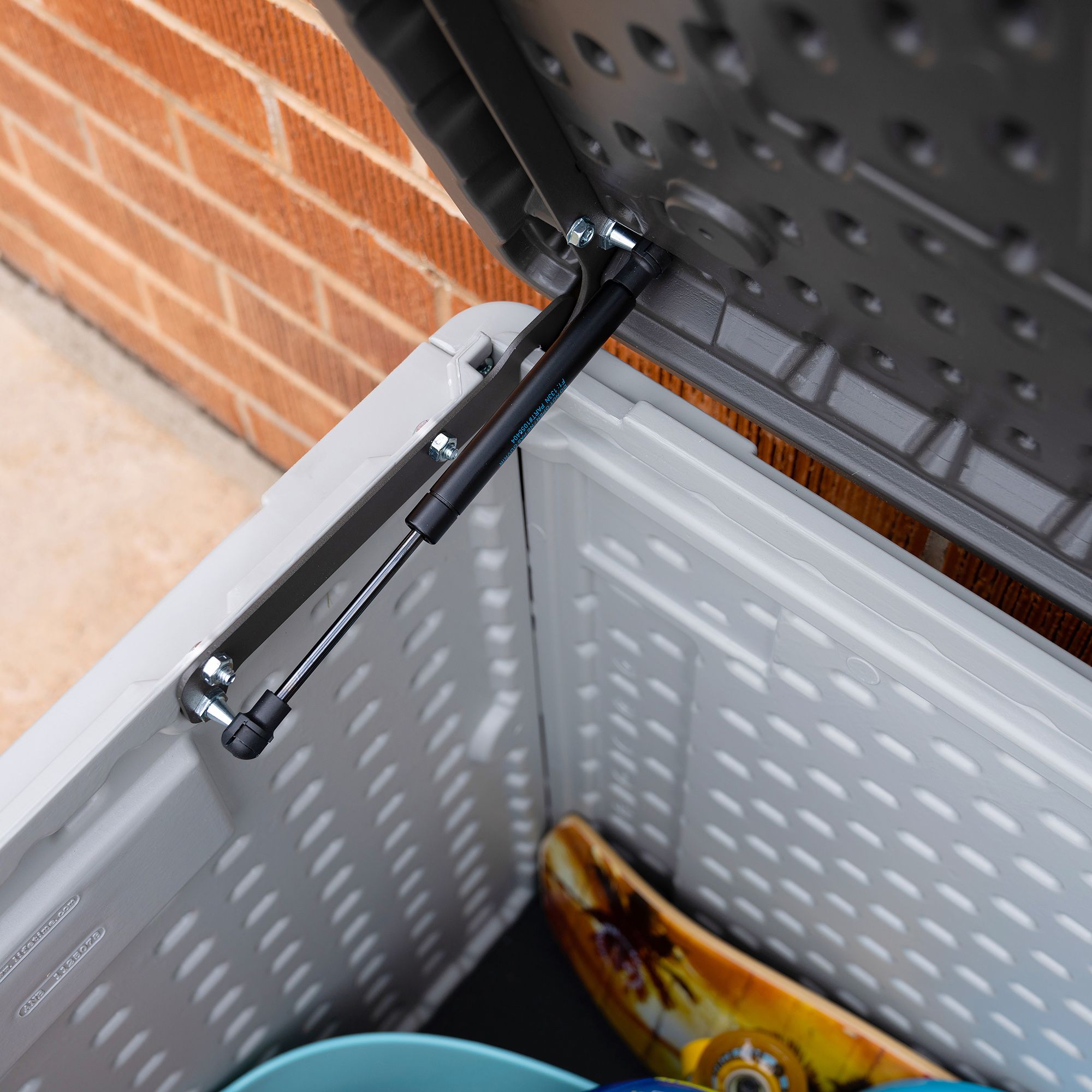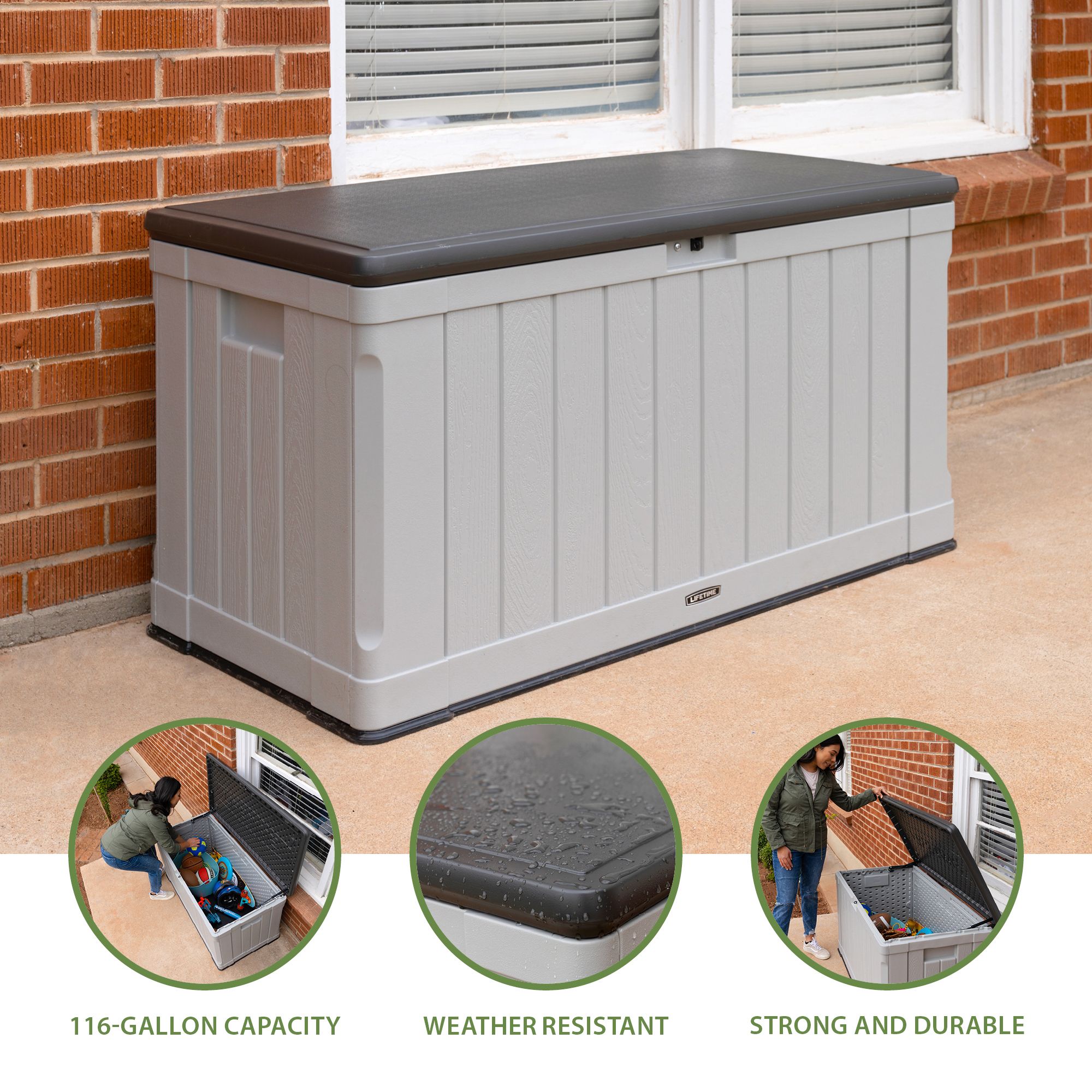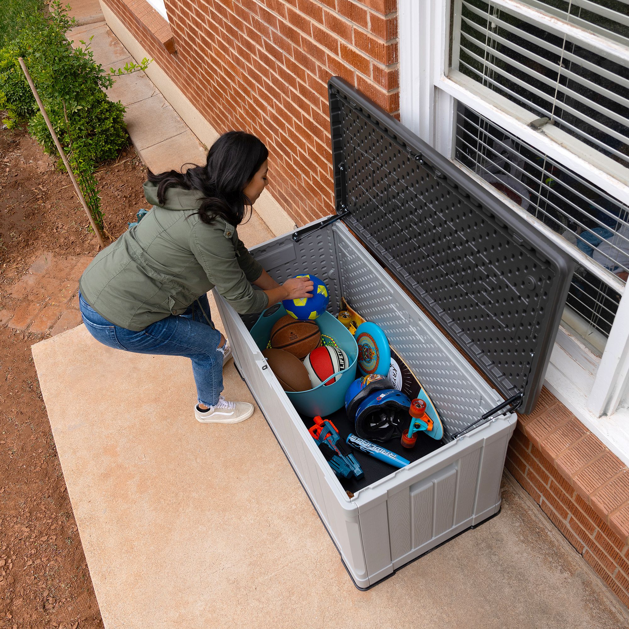 Need a more convenient place to store items around your yard? Lifetime’s Deck Boxes are the perfect way to expand your storage and get better access to items you use regularly around your yard. Whether you have gardening tools, lawn equipment, yard games, or even outdoor seat cushions, the Deck Box makes them easy to store and find when needed. It is durable, UV-protected, and weather resistant to ensure your belongings have years of protection. The lid is lockable (lock not included) to provide even greater security and has a controlled spring-hinge for easy opening and closing. It has molded side handles for easy transport making it easy to move around your yard or patio and it is even sturdy enough to be used as a bench. The Lifetime Deck Box blends durability, convenience and style to create a versatile storage solution.