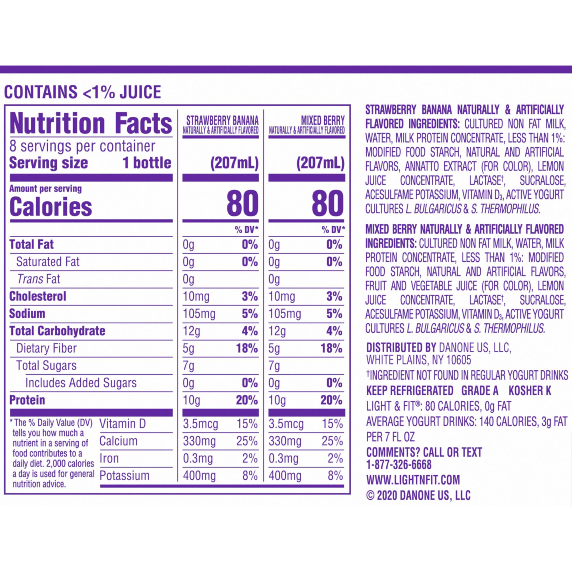 This pack includes two delicious flavors, Mixed Berry and Strawberry Banana. It is a great yogurt option for an on-the-go snack. In terms of nutritionals, it has less sugar, less calories, and more protein than the leading competitor (0g sugar added, 10g of protein, 80 calories per bottle.) It is certified gluten-free and a great low-calories option. For balanced nutrition on-the-go, Dannon Light & Fit Protein Smoothies are a smart choice. Shake up your routine with your favorite fruit flavors in a smooth 7 fl. oz. protein smoothies with 10 grams of protein, 80 calories, 0 added sugar, and 0% fat. A delicious way to eat well on-the-go.