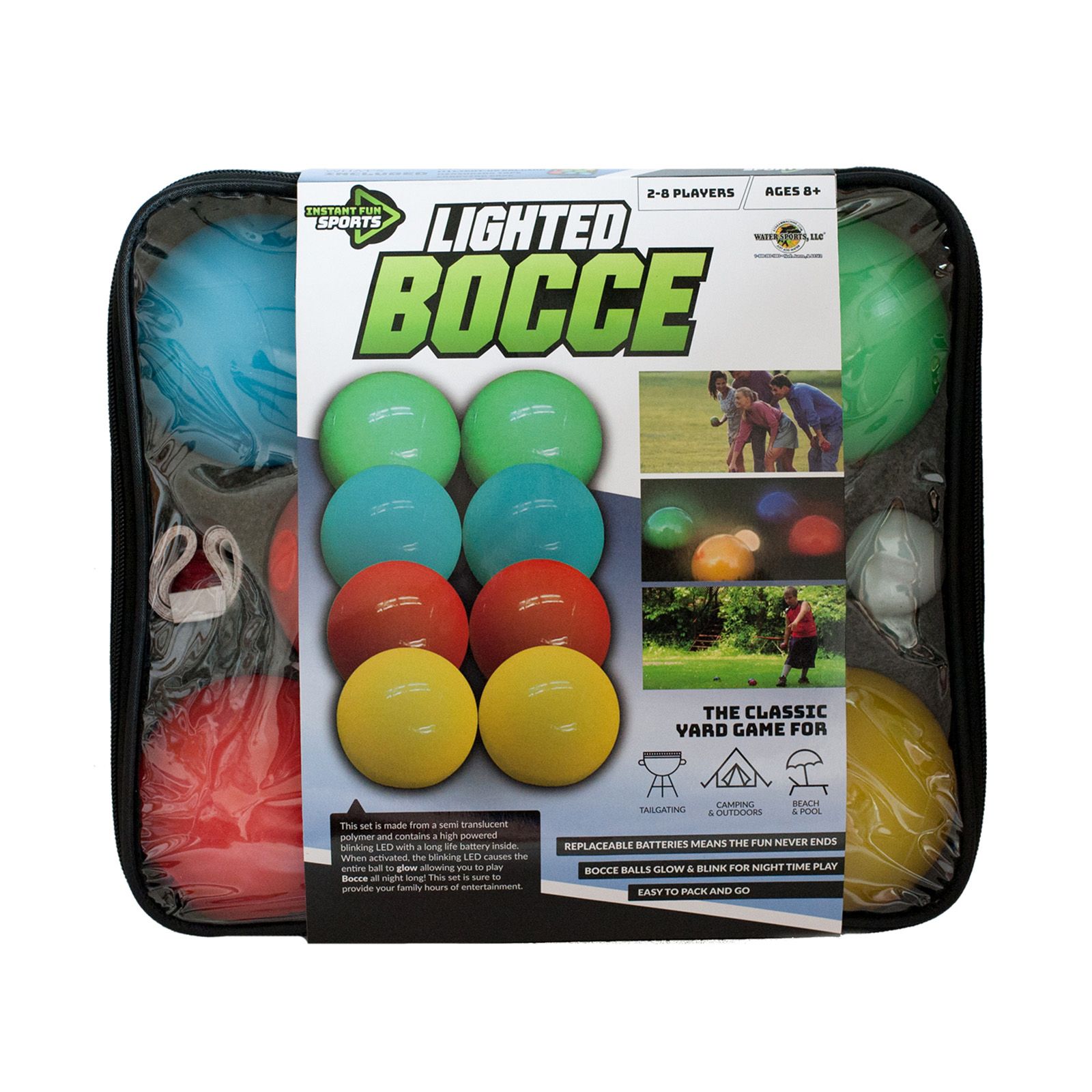 Keep the fun going with this outdoor glow-in-the-dark bocce ball game Easy to use carry case to take the fun to the backyard, beach, camping, a party, etc. Fun for all ages Reawaken your competitive spirit and experience hours of backyard family fun, even after hours Age ranges: 8+ Includes eight balls: two per color, one pig ball, marker, marker rope, tape measure and carry case
