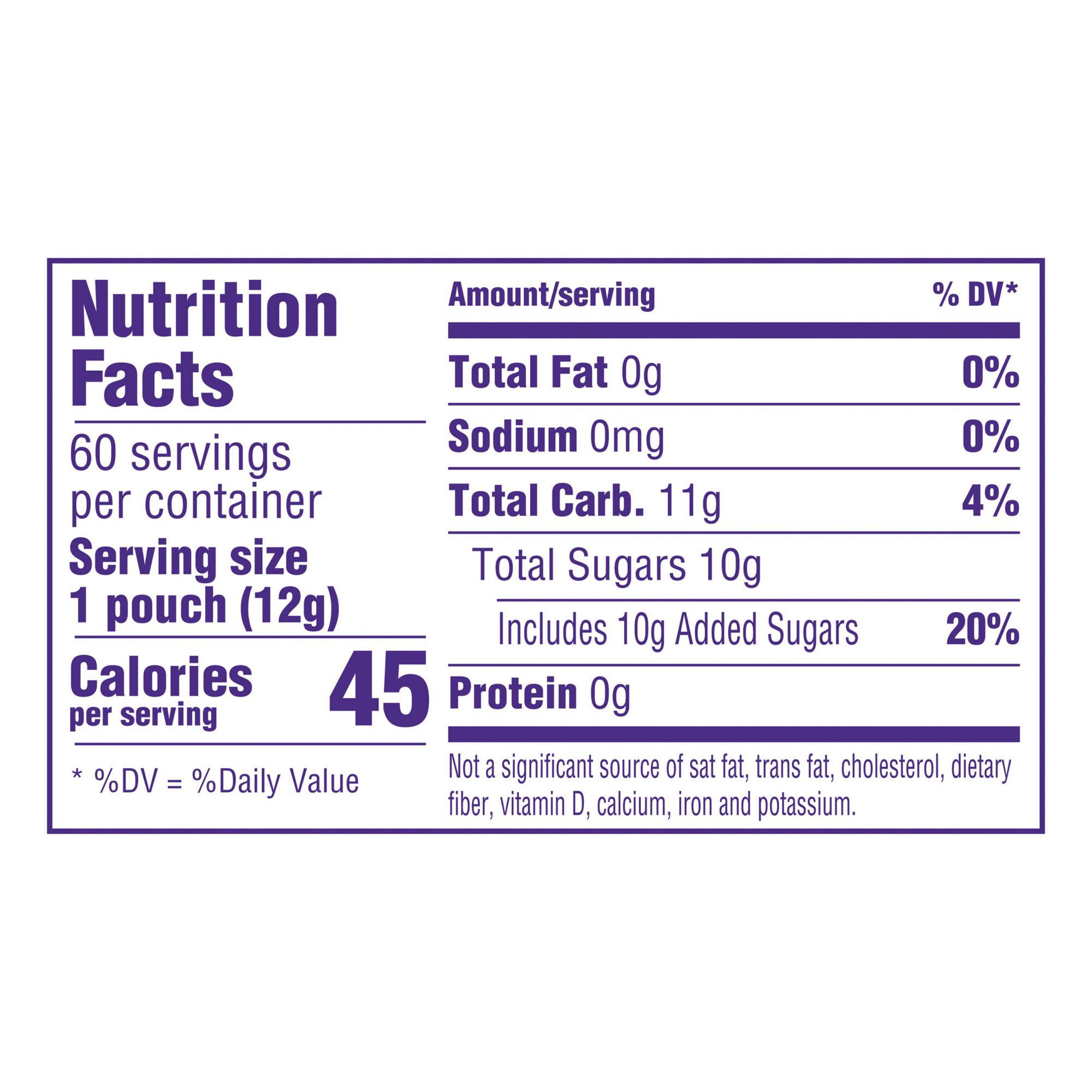 Ingredients: Dextrose, Maltodextrin, Contains 2% or Less of Citric Acid, Calcium Stearate, Natural Flavors, Blue 1 Lake, Yellow 5, Red 40 Lake, Blue 1.