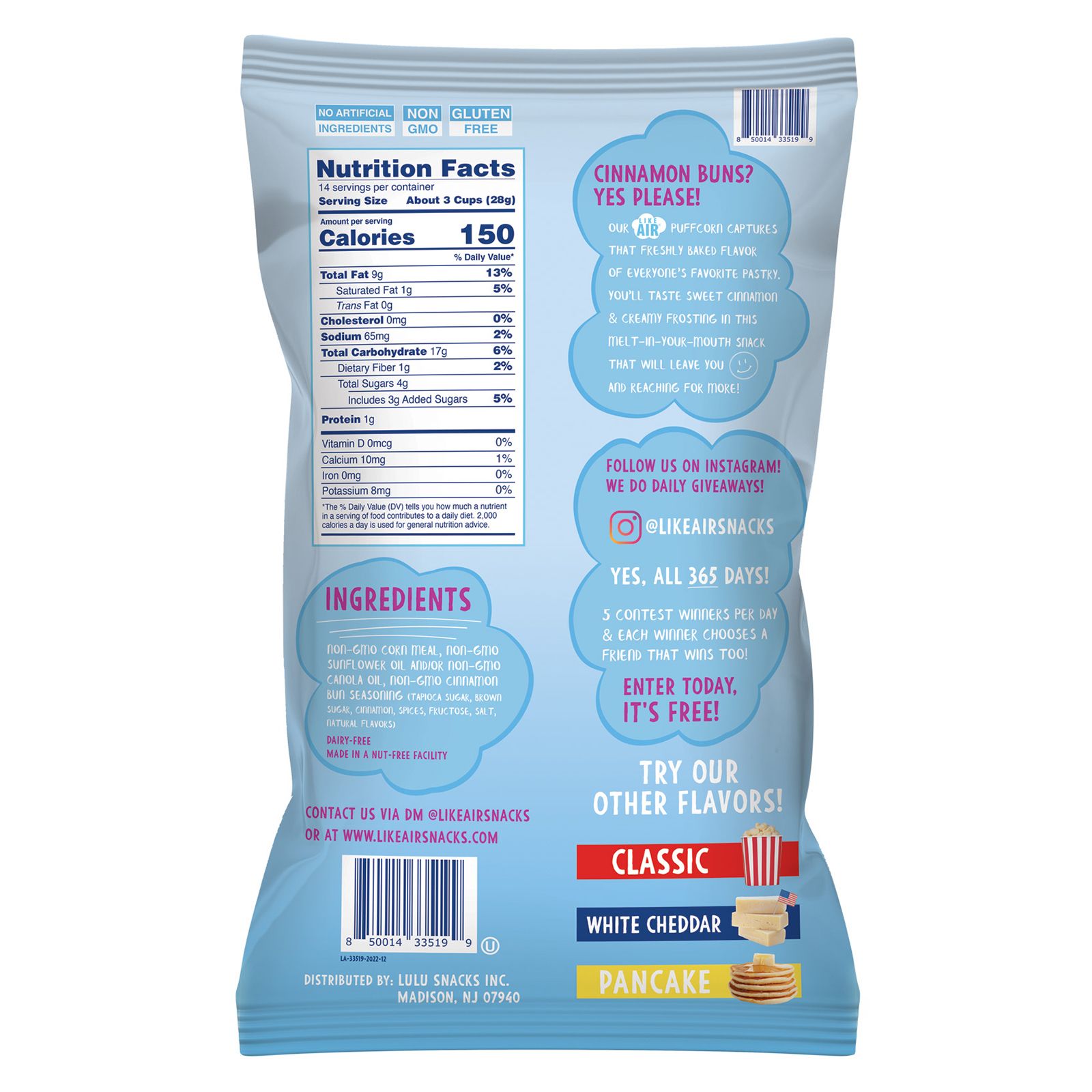 Introducing Like Air Cinnamon Bun Puffcorn, the perfect blend of sweet cinnamon and indulgent frosting flavor, all wrapped up in a light and airy snack. Like Air's latest creation captures the irresistible taste of freshly baked cinnamon buns without the guilt. With just 50 calories per cup and 50% less sugar than traditional kettle corn, you can satisfy your sweet tooth cravings while maintaining a healthier snacking routine. Don't miss out on this amazing limited time flavor and pick up a bag today.
