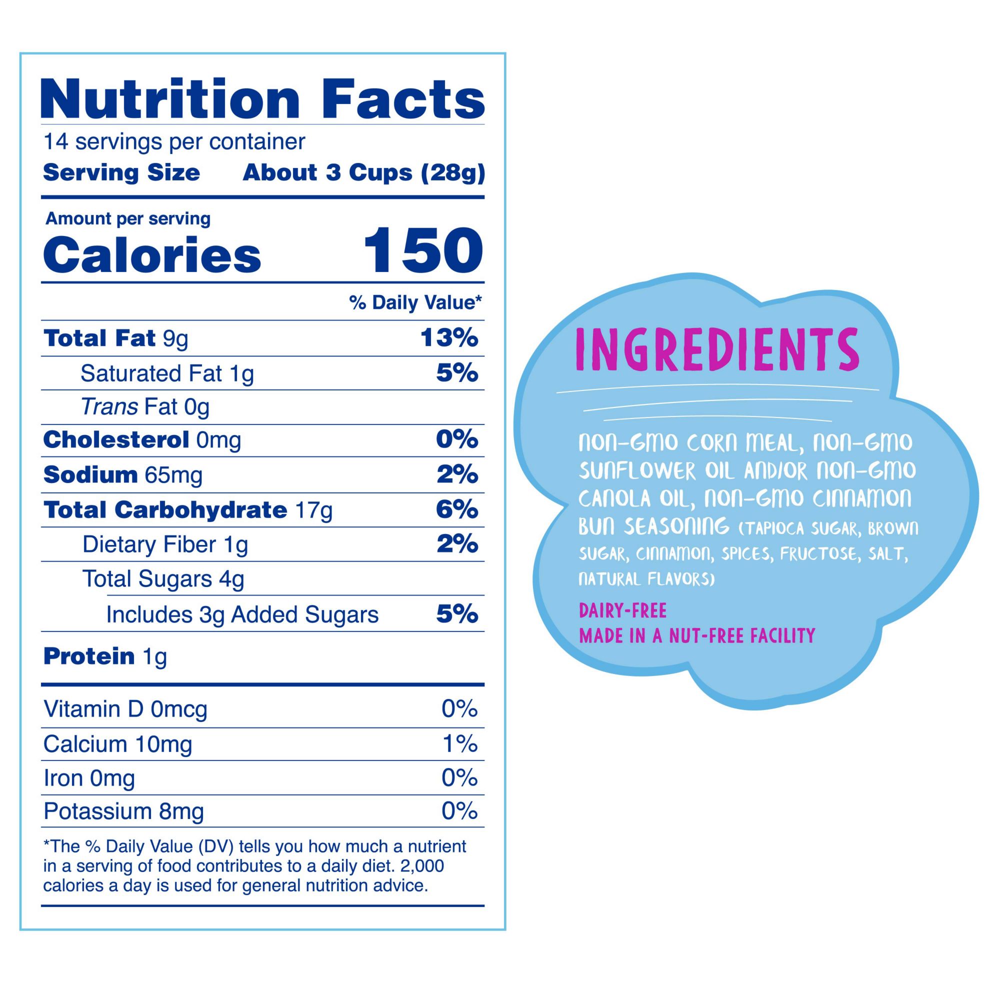 Ingredients: Non-GMO Corn Meal, Non-GMO Sunflower Oil and/or Non-GMO Canola Oil, Non-GMO Cinnamon Bun Seasoning (Tapioca Sugar, Brown Sugar, Cinnamon, Spices, Fructose, Salt, Natural Flavors).
