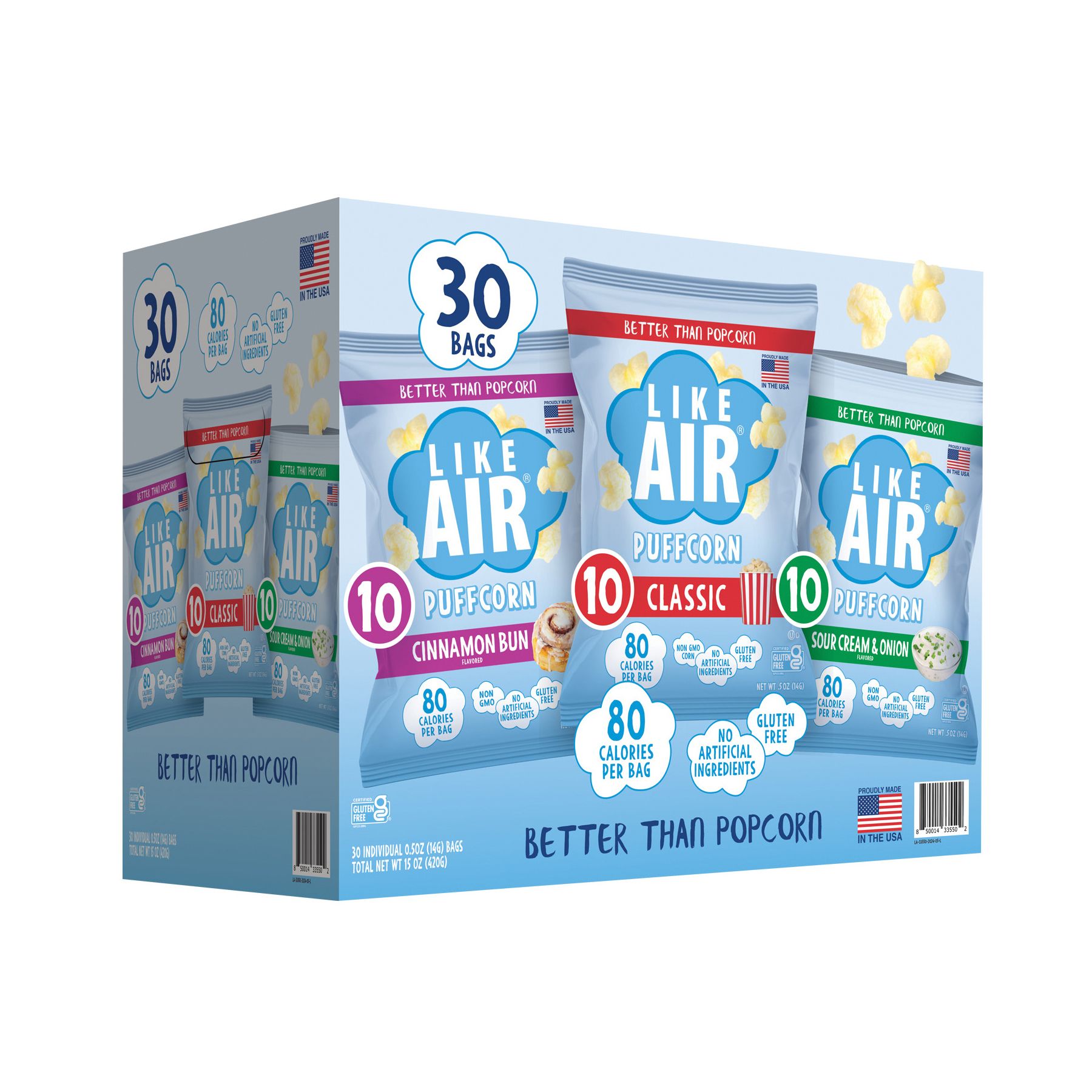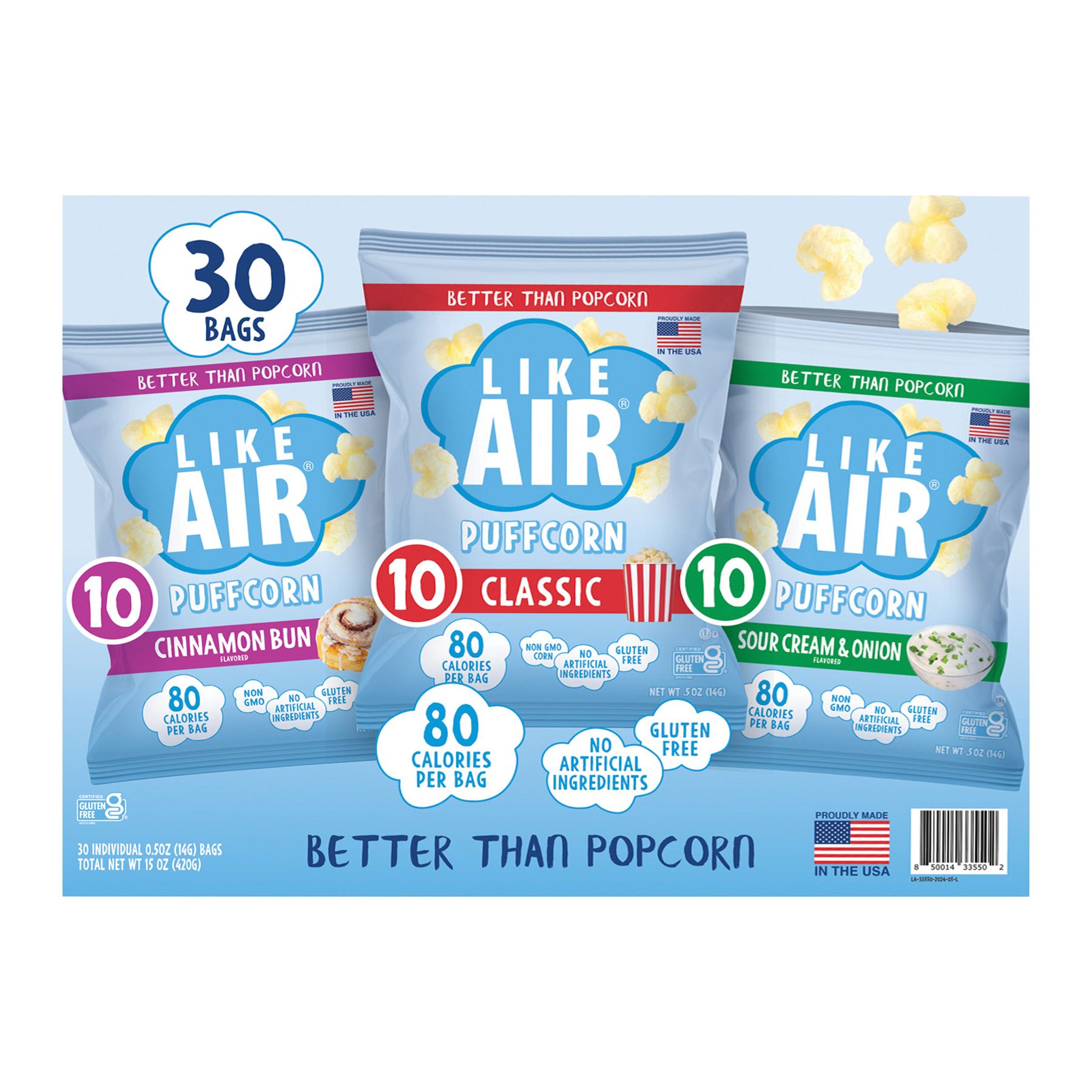 Discover the irresistible appeal of Like Air's puffcorn variety pack! Featuring 30 convenient single-serve bags, each offering just 80 calories so you can indulge guilt-free. From the timeless taste of Classic to the savory delight of Sour Cream & Onion, and the sweet indulgence of Cinnamon Bun, there's a flavor for everyone to enjoy. Treat your family to the joy of Like Air's Variety Pack – because every bite is packed with happiness.
