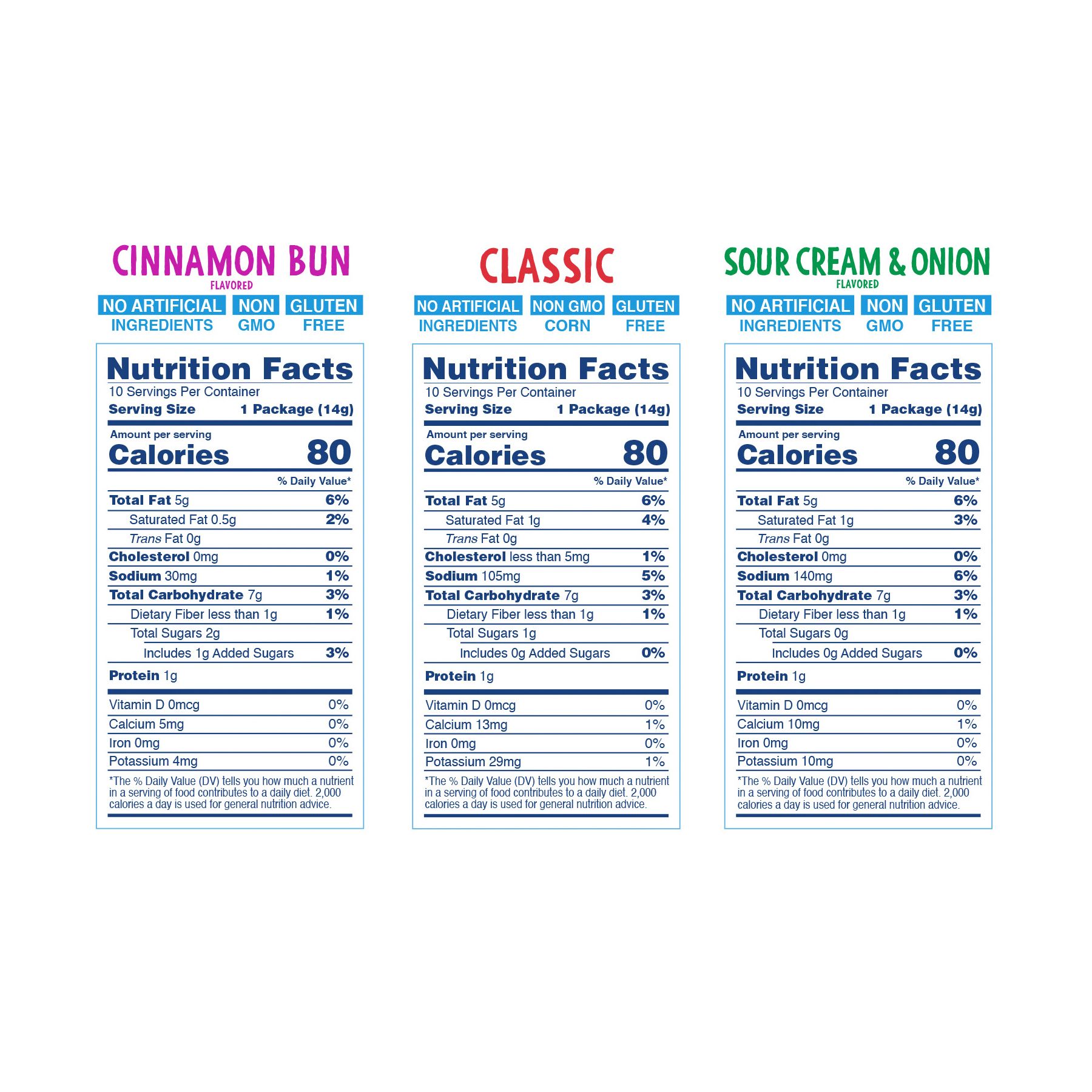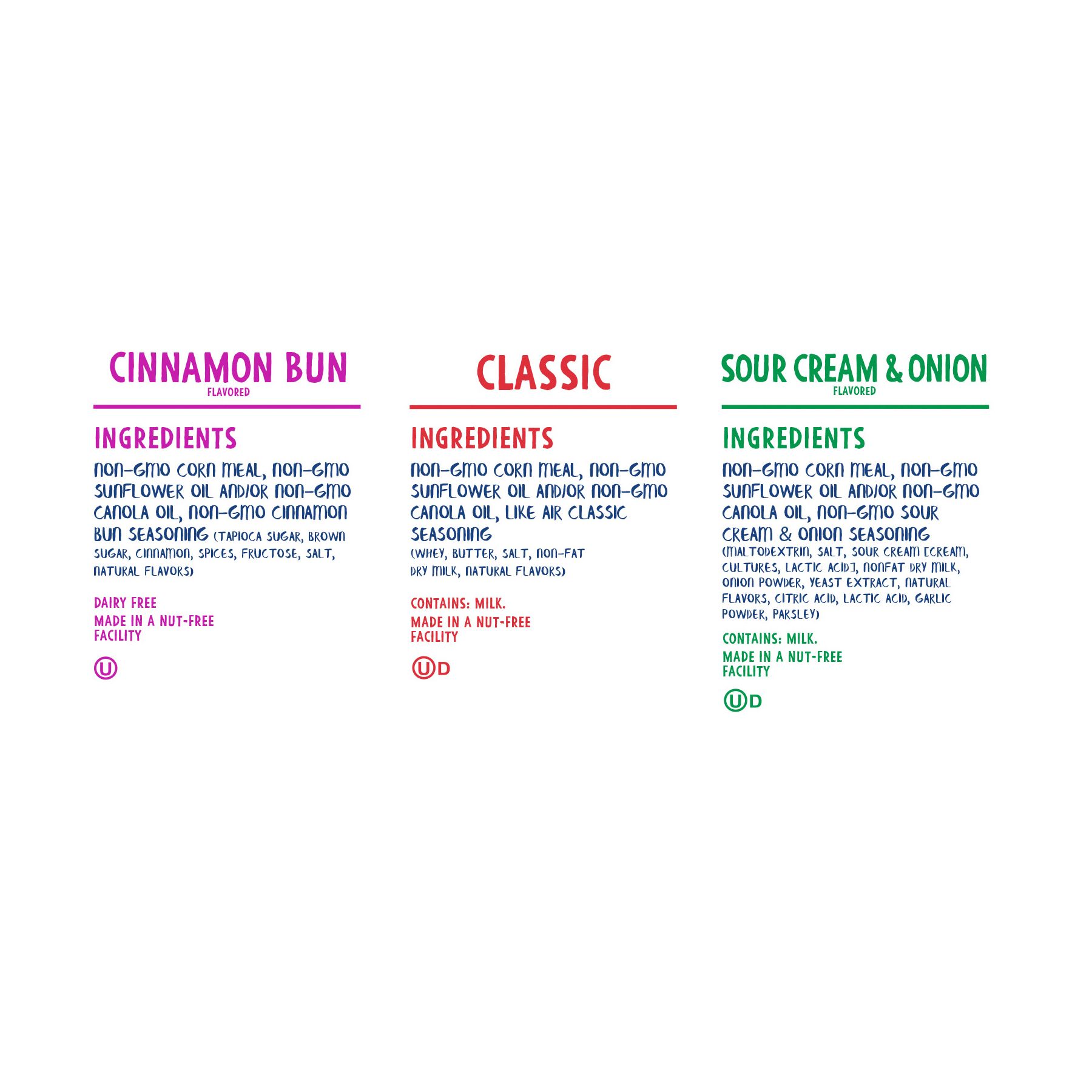 Ingredients Sour Cream and Onion: Non-GMO Corn Meal, Non-GMO Sunflower Oil and/or Non-GMO Canola Oil, Non-GMO Sour Cream & Onion Seasoning (Maltodextrin, Salt, Sour Cream [Cream, Cultures, Lactic Acid], Nonfat Dry Milk, Onion Powder, Yeast Extract, Natural Flavors, Citric Acid, Lactic Acid, Garlic Powder, Parsley. Classic: Non-GMO Corn Meal, Non-GMO Sunflower Oil and/or Non-GMO Canola Oil, Like Air Classic Seasoning (Whey, Butter, Salt, Non-Fat Dry Milk, Natural Flavors). Cinnamon Bun: Non-GMO Corn Meal, Non-GMO Sunflower Oil and/or Non-GMO Canola Oil, Non-GMO Cinnamon Bun Seasoning (Tapioca Sugar, Brown Sugar, Cinnamon, Spices, Fructose, Salt, Natural Flavors).